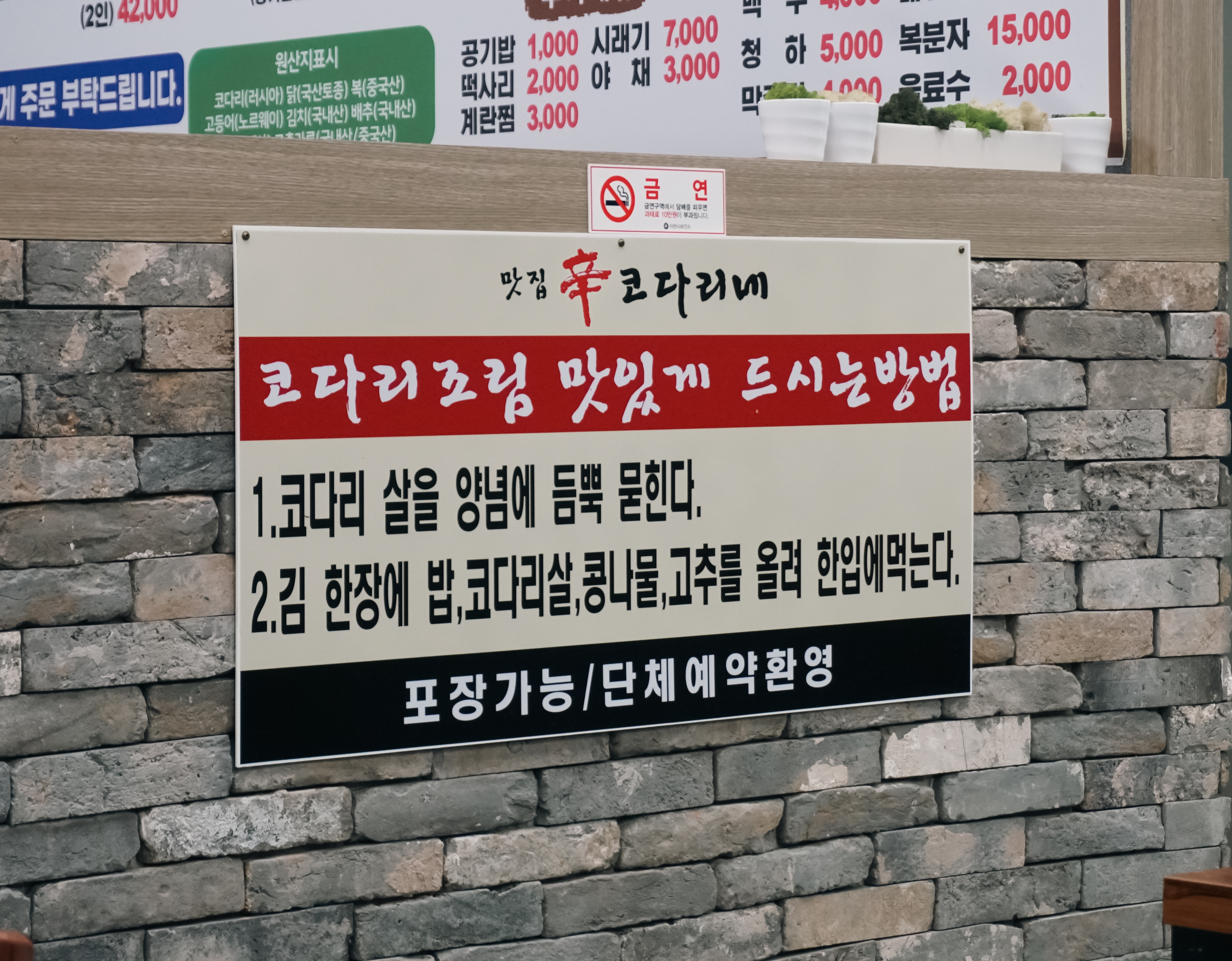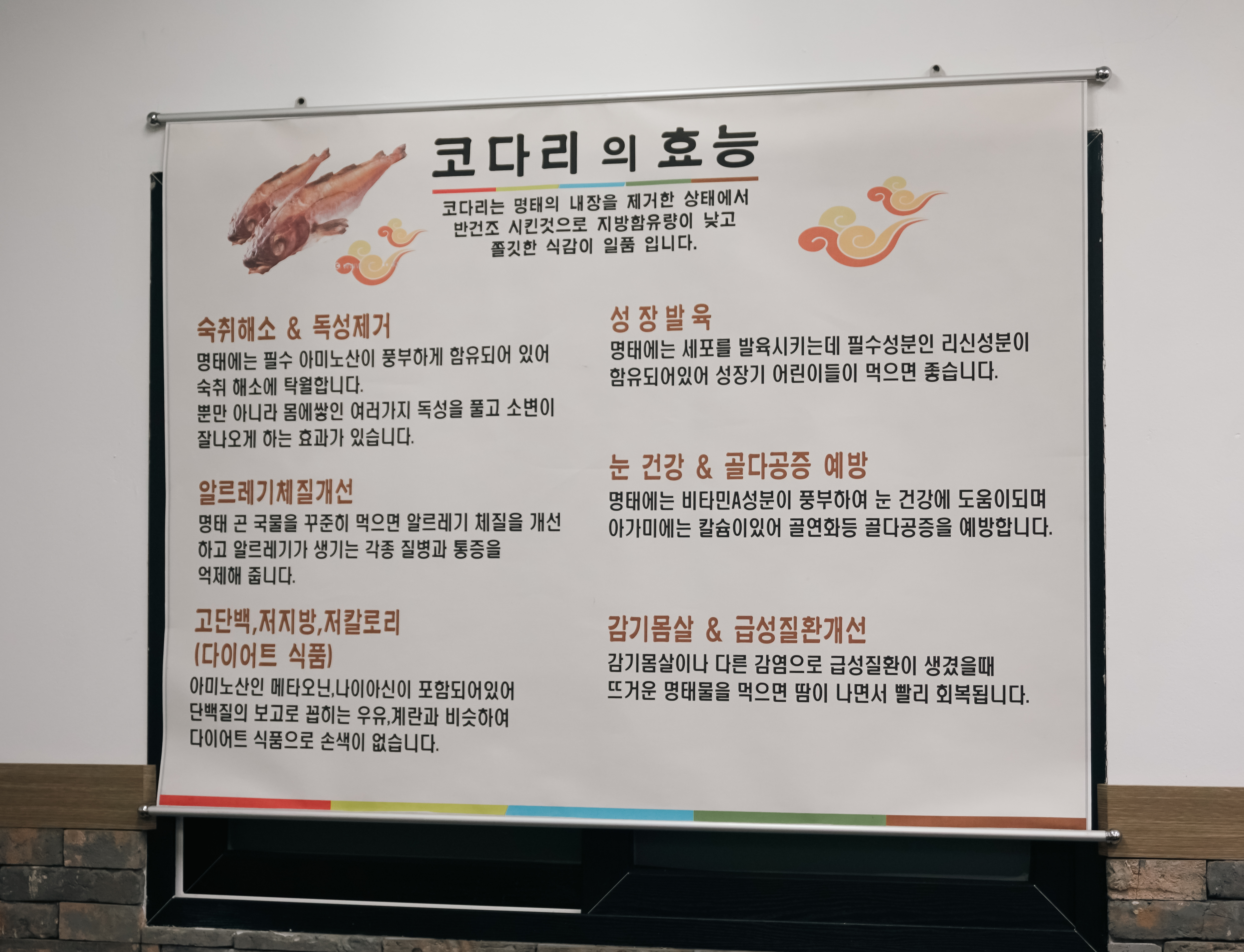 맛집신코다리네의 코다리조림은 꼬들꼬들한 식감의 코다리와 매콤한 양념이 잘 어울리는 메뉴였습니다. 재미있는 것은 대부분 식당마다 공통적으로 'OO의 효능' 이라는 문구를 적어놓는 것을 볼 수 있는데, 굳이 효능 따지면서 식사하러 오지는 않을 텐데 참 재미있는 문화(?)인 것 같습니다.
