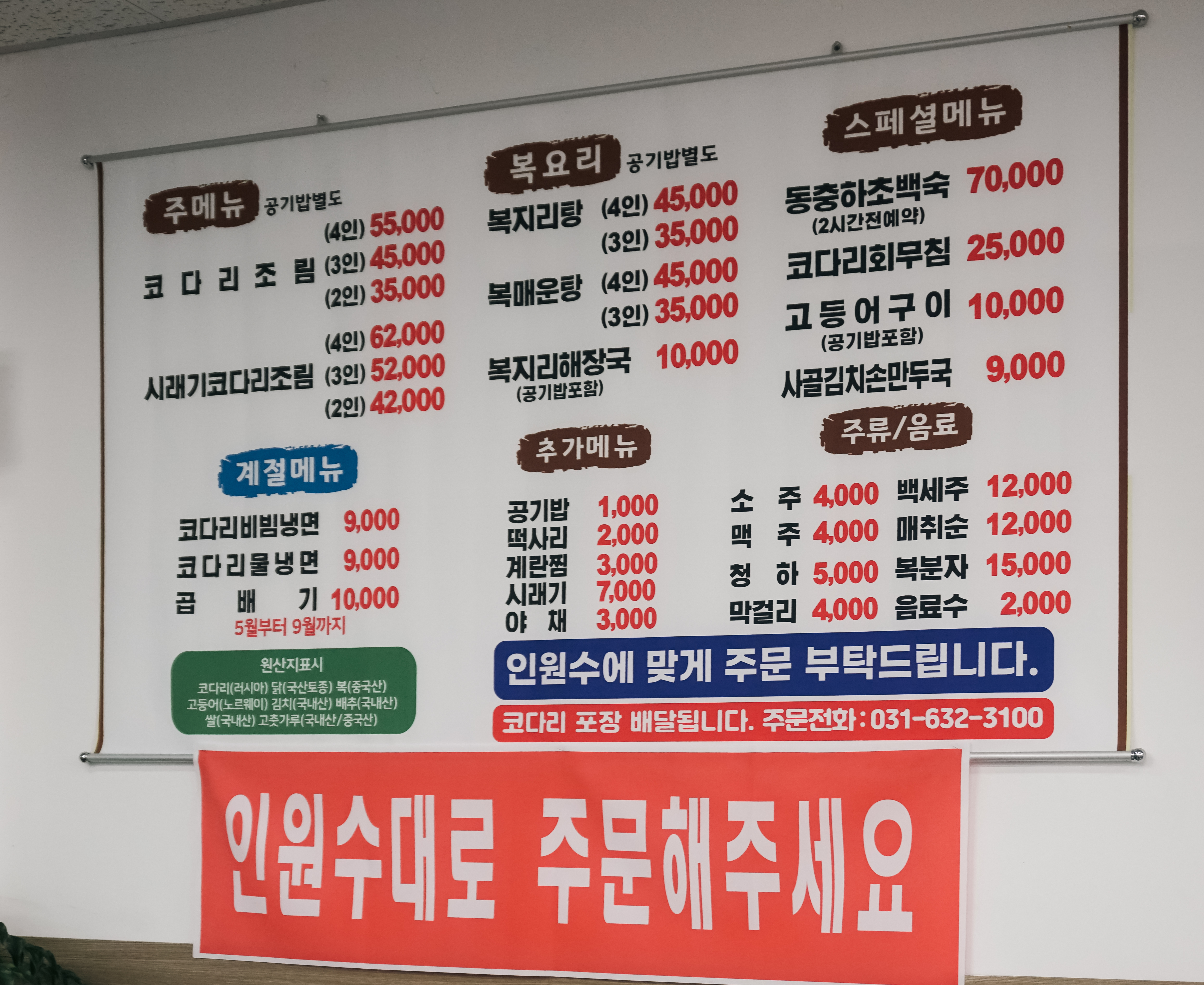 마장면 맛집신코다리네 메뉴는 코다리조림, 시래기코다리조림, 복지리탕, 복매운탕, 복지리해장국, 동충하초백숙, 코다리회무침, 고등어구이, 사골김치손만두국, 코다리비빔냉면, 코다리물냉면 등이 있었습니다. 저희는 코다리조림을 주문했습니다.
