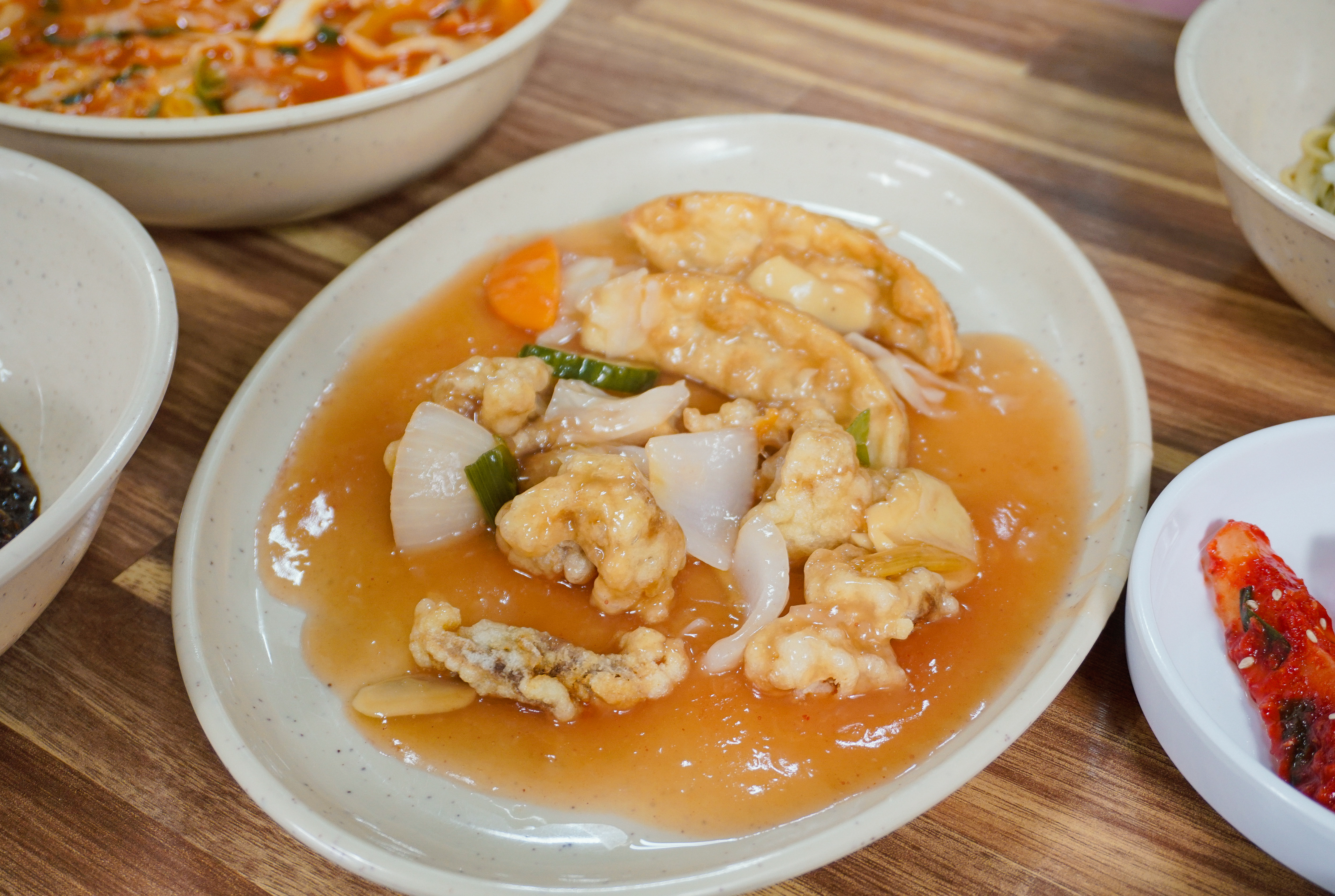 탕수육과 짬뽕의 모습입니다. 탕수육은 옛날식 탕수육이었는데, 기본적으로 소스가 부어 나왔고, 바삭한 식감보다는 무른 식감으로 먹었습니다. 짬뽕은 꽤 먹을만하더라고요. 제가 느끼기엔 중깐이라는 메뉴는 전체적으로 후식 메뉴처럼 짜장, 짬뽕, 탕수육까지 조금씩 맛보기 형태로 제공되는 메뉴같이 느껴졌습니다.