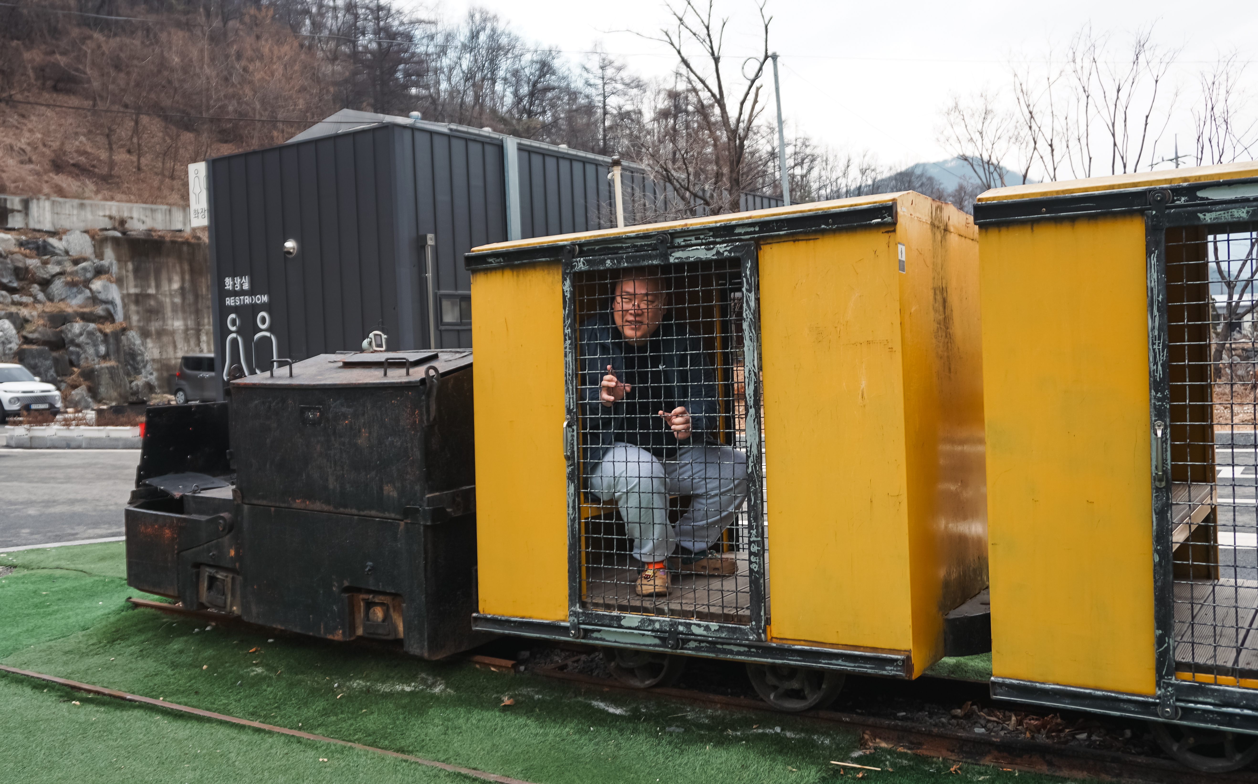 동굴 밖에는 전시공간이 있었는데, 공룡이나 로봇 같은 아이들을 위한 전시품이 많았습니다. 저는 갱에서 사용하던 조그마한 열차에 탑승해서 기념사진을 남겨보았습니다.