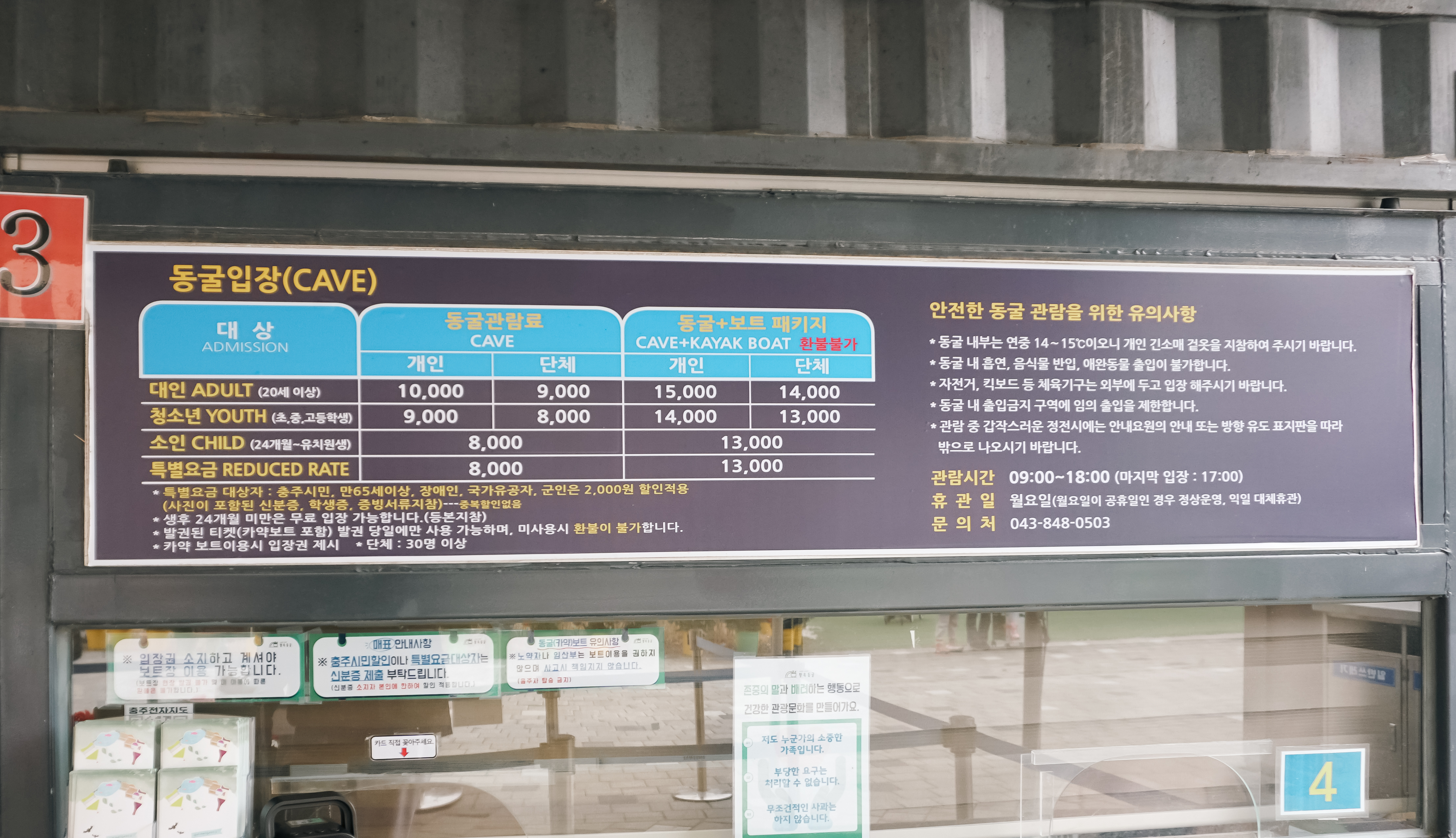 활옥동굴의 입장료는 다음과 같습니다. 성인기준 관람만 할 경우 10,000원, 보트 체험을 포함하면 15,000원 이었습니다. 투명카약 탑승은 개인의 기호에 따라 이용하는 체험으로 저는 관람만 목적으로 하기 때문에 10,000원의 입장료를 내고 들어갔습니다.