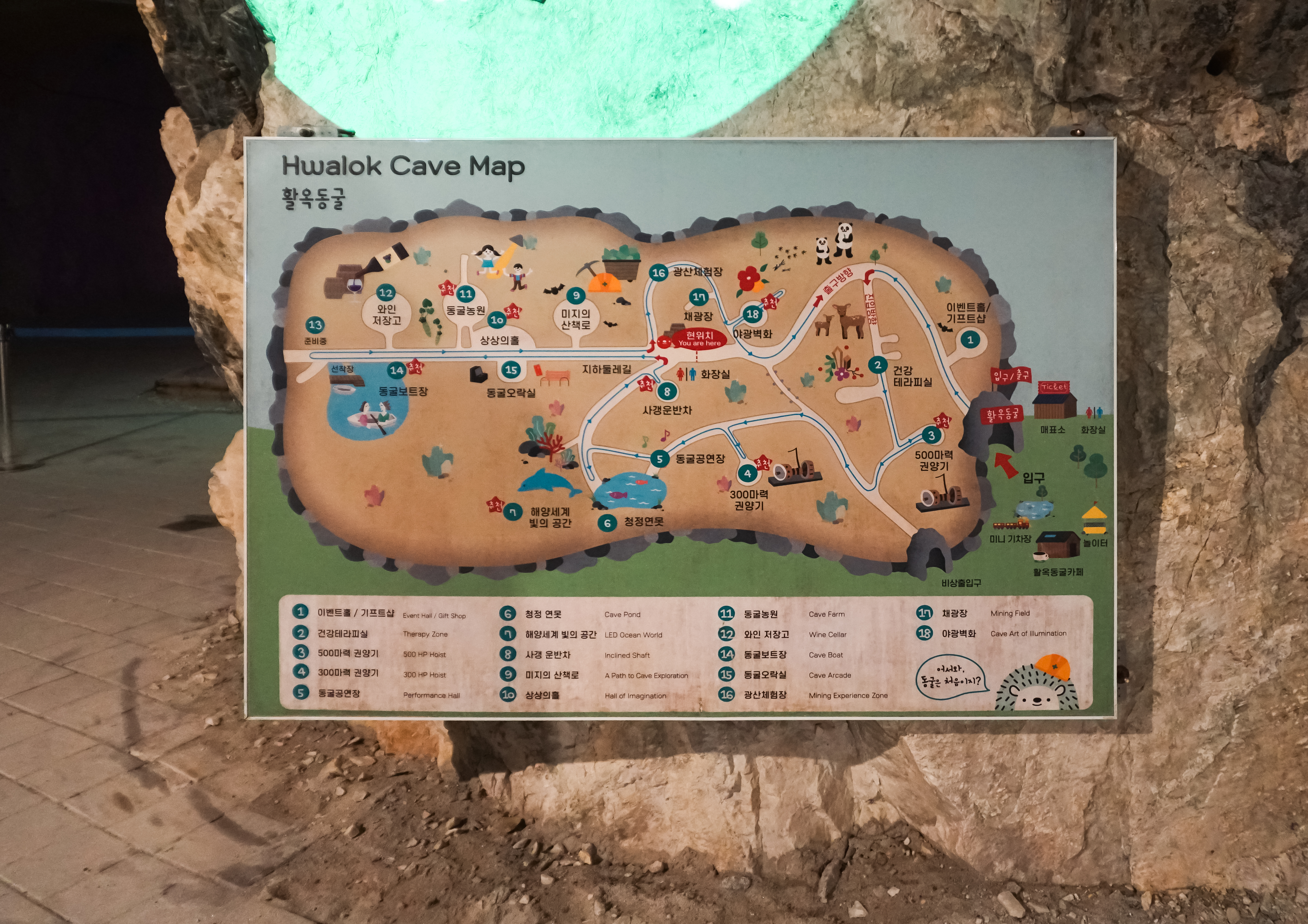 활옥동굴은 이벤트홀, 건강테라피실, 500마력권양기, 300마력권양기, 동굴공연장, 청정연못, 해양세계빛의공간, 사갱운반차, 미지의산책로, 상상의홀, 동굴농원, 와인저장고, 동굴보트장, 동굴오락실, 광산체험장, 채광장, 야광벽화로 구성되어 있었습니다. 매표소에 동굴안내 지도가 있으니 지도를 참고하셔도 됩니다.