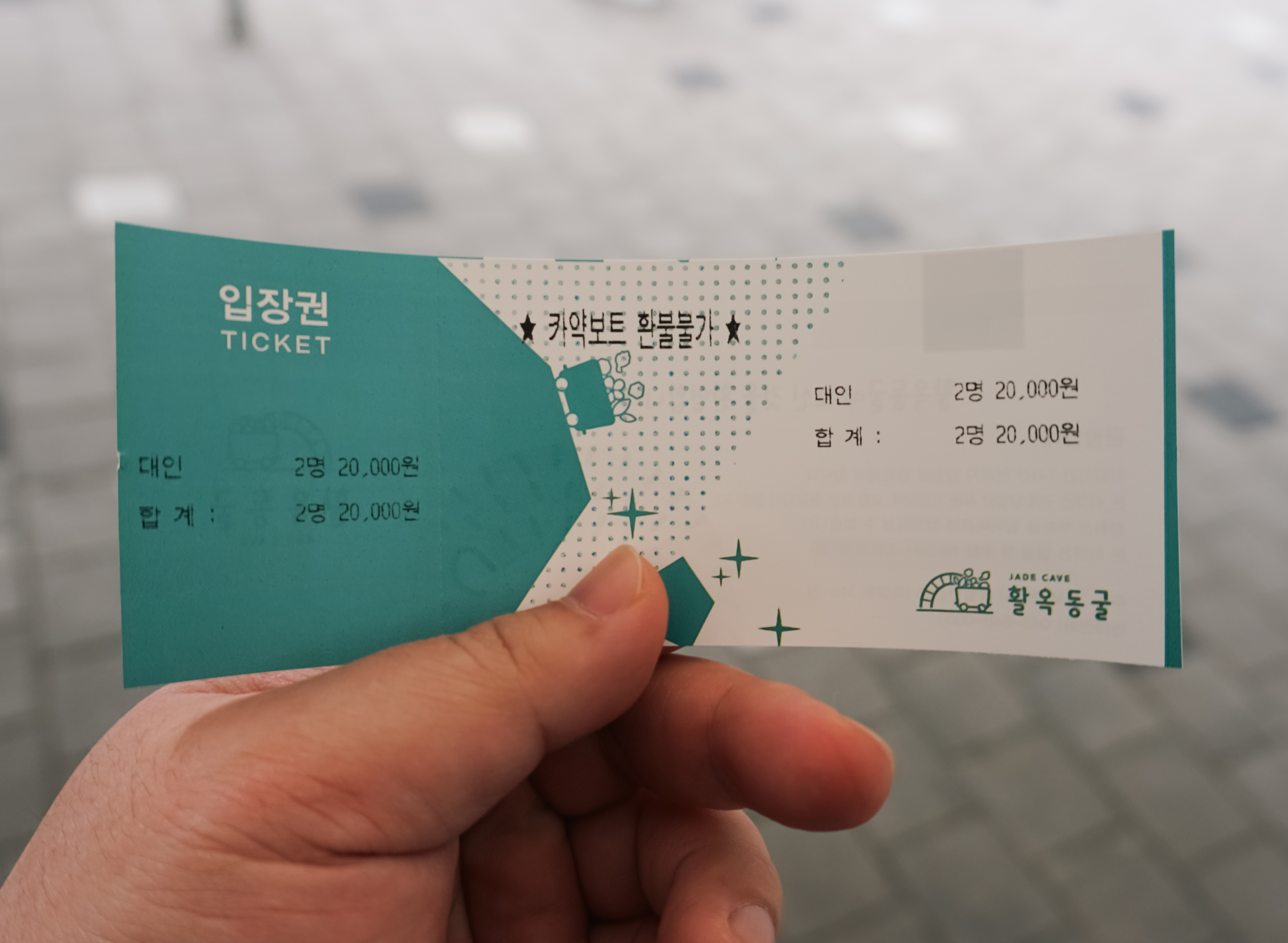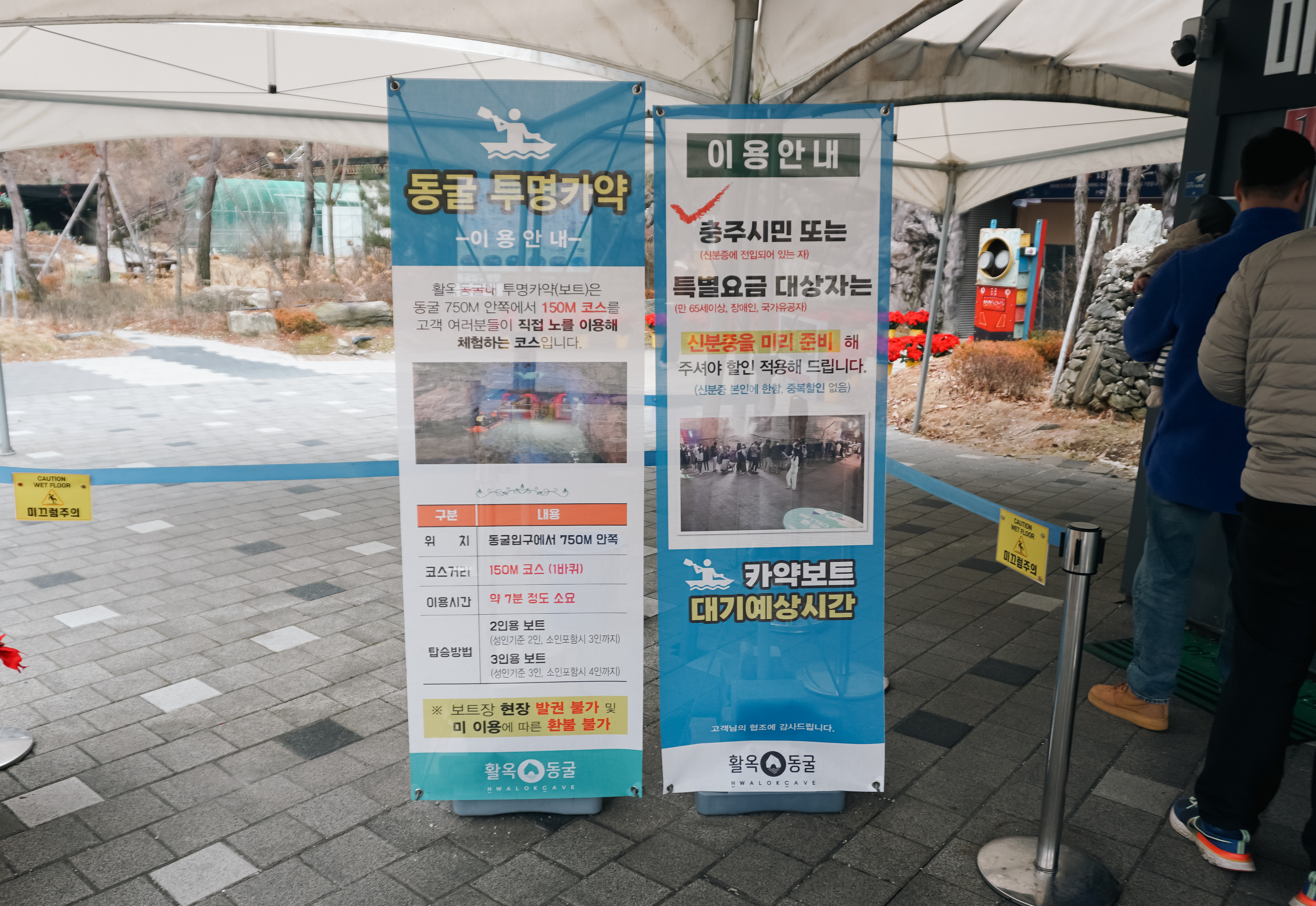 활옥동굴의 입장료는 다음과 같습니다. 성인기준 관람만 할 경우 10,000원, 보트 체험을 포함하면 15,000원 이었습니다. 투명카약 탑승은 개인의 기호에 따라 이용하는 체험으로 저는 관람만 목적으로 하기 때문에 10,000원의 입장료를 내고 들어갔습니다.