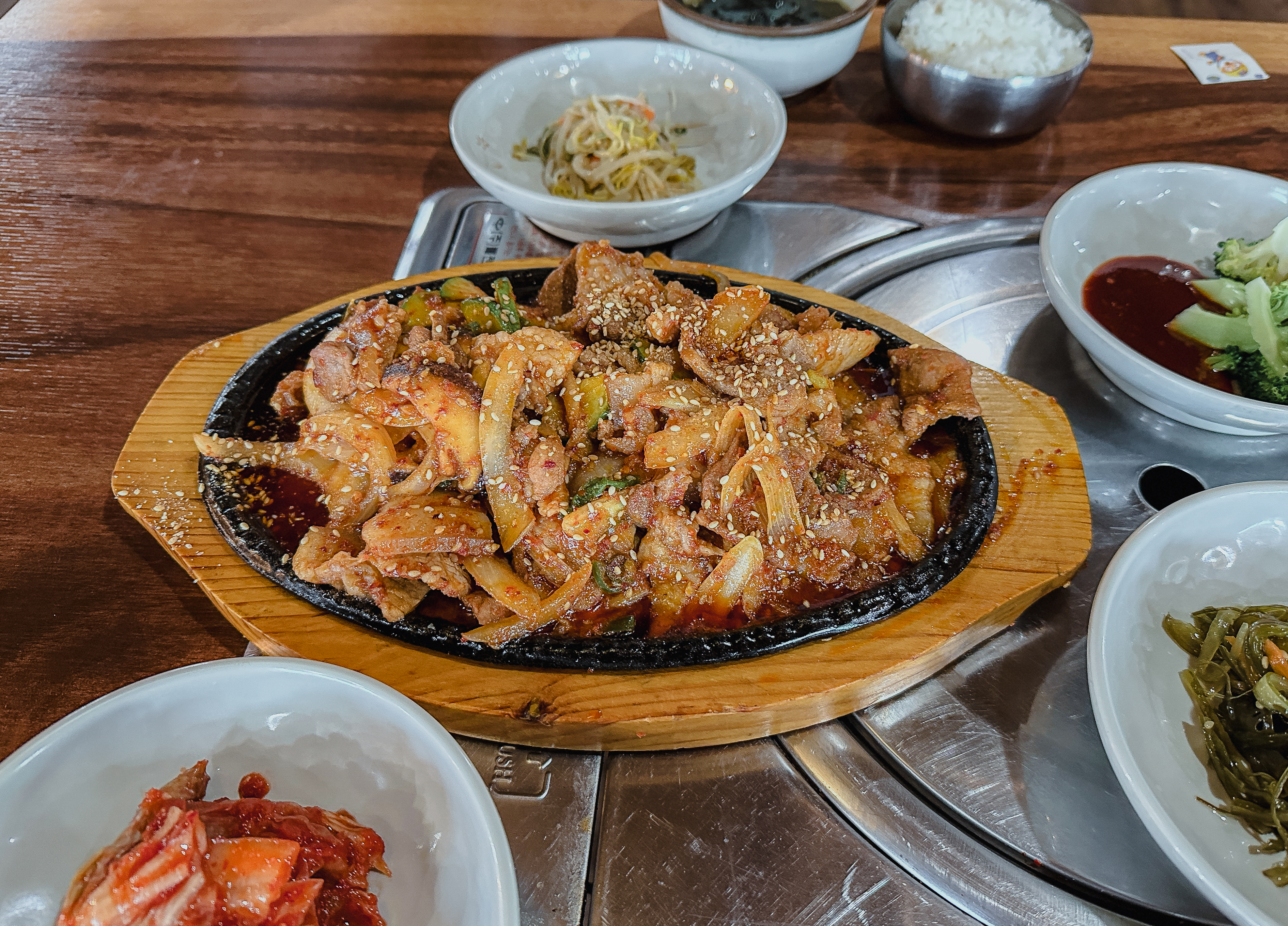 동막골유황천에서 찜질을 하고 찜질방 내 한식당에서 아침 겸 점심으로 제육볶음을 먹었습니다. 큰 기대 없이 먹었는데 무난한 맛이었고요, 어찌 보면 조금 느끼할 수 있는 기름진 메뉴였어요. '맛있는녀석들'이라는 프로그램에 소개된 적이 있는 가게여서 뭔가 차별화된 맛이 있냐면요 그에 대한 대답은 '아니'라고 할 수 있겠습니다.