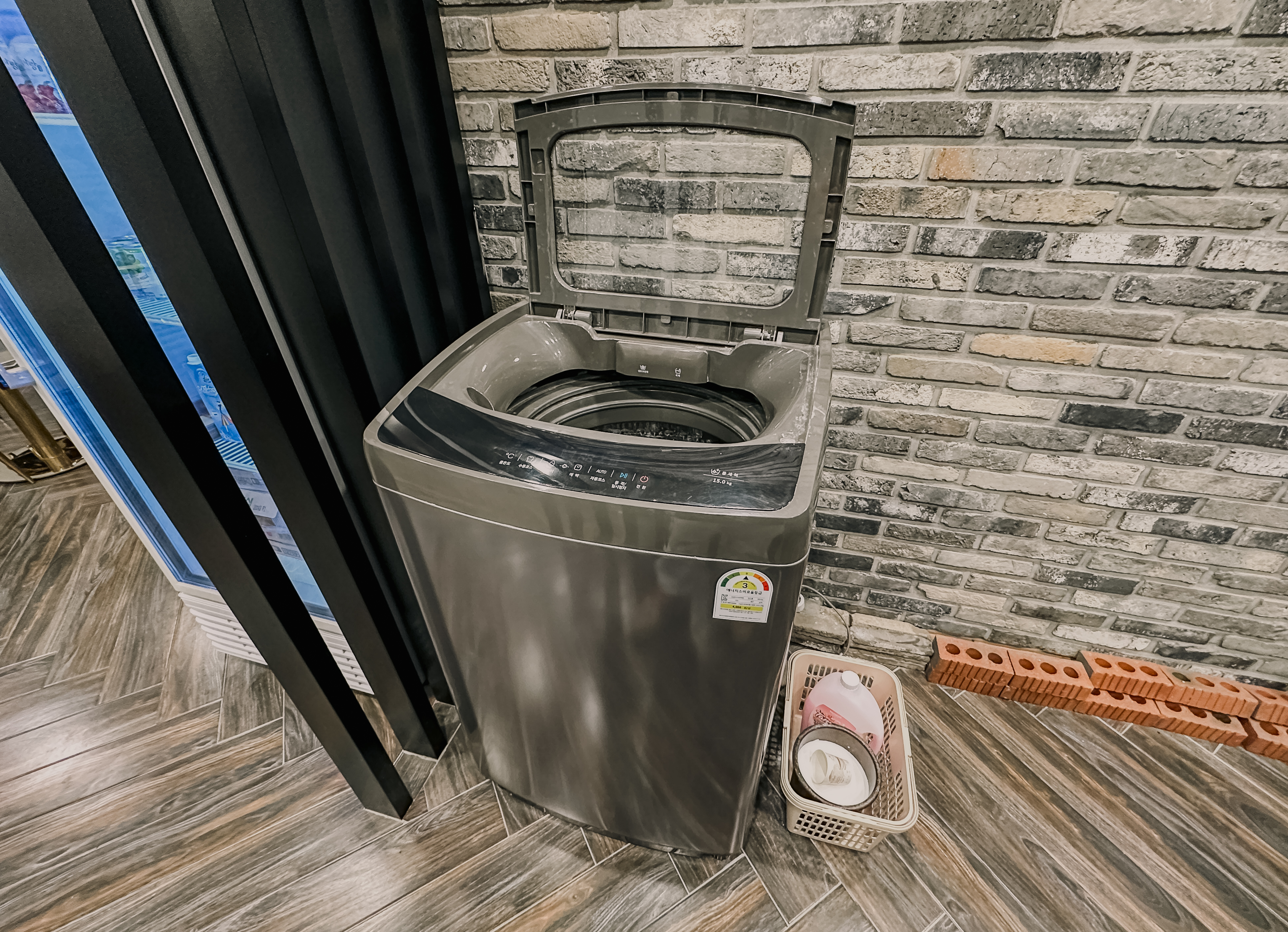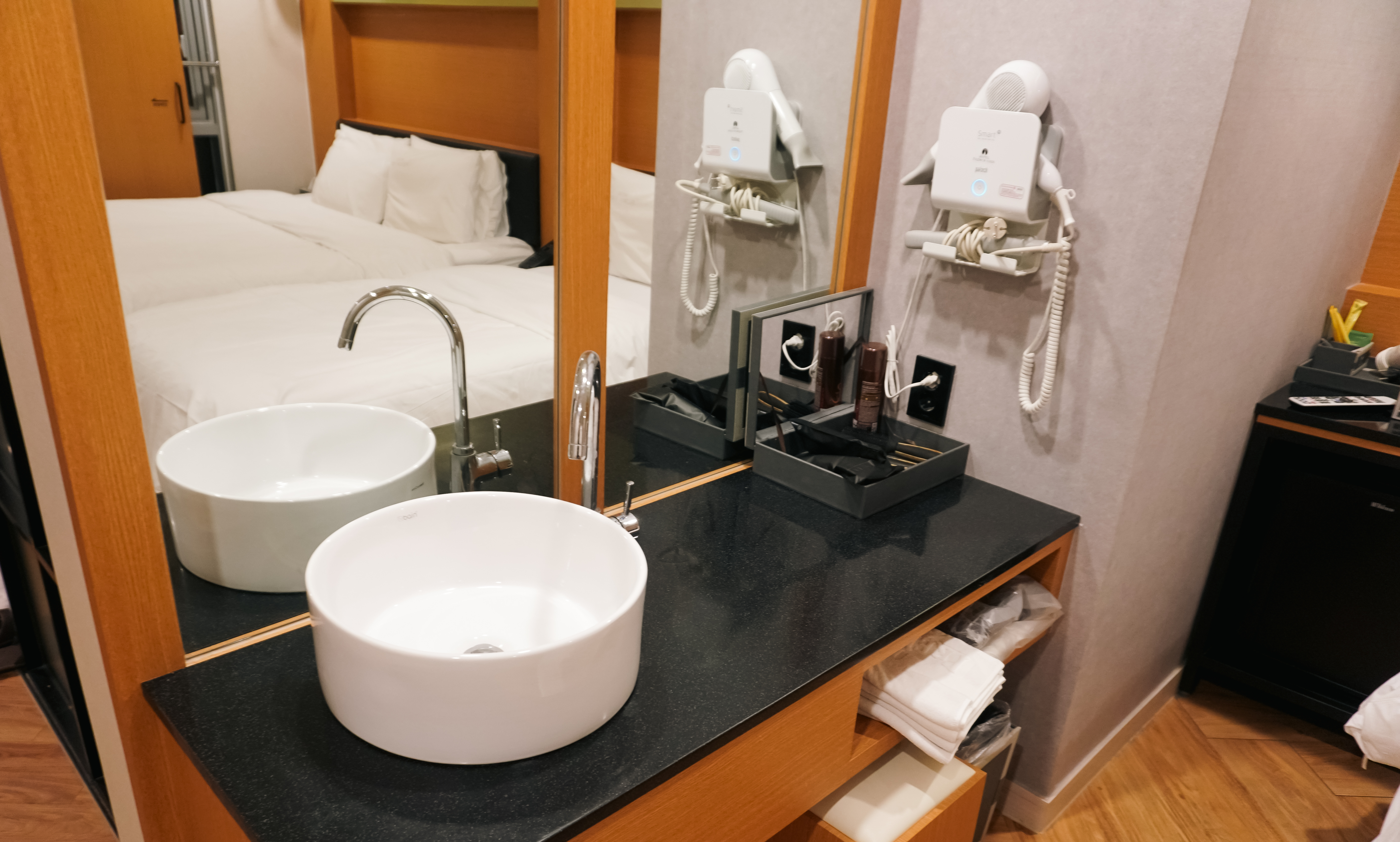 청주 프렌치코드 침실에는 의류관리기와 커피포트, 냉장고, TV, 헤어드라이어 등이 마련되어 있었고, 침대와 침구류가 편안하고 좋았습니다. 욕실도 같이 확인해 보시죠.