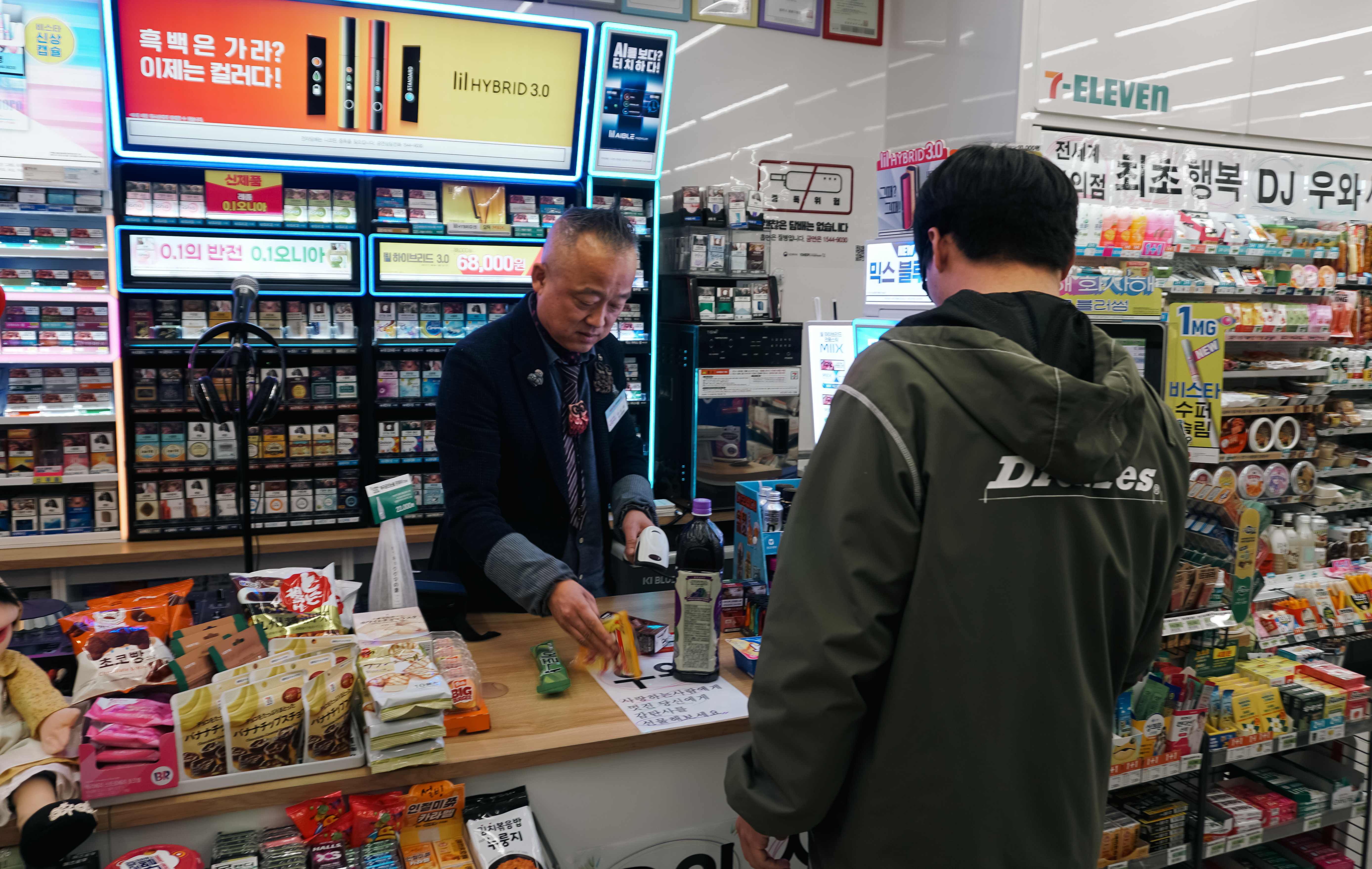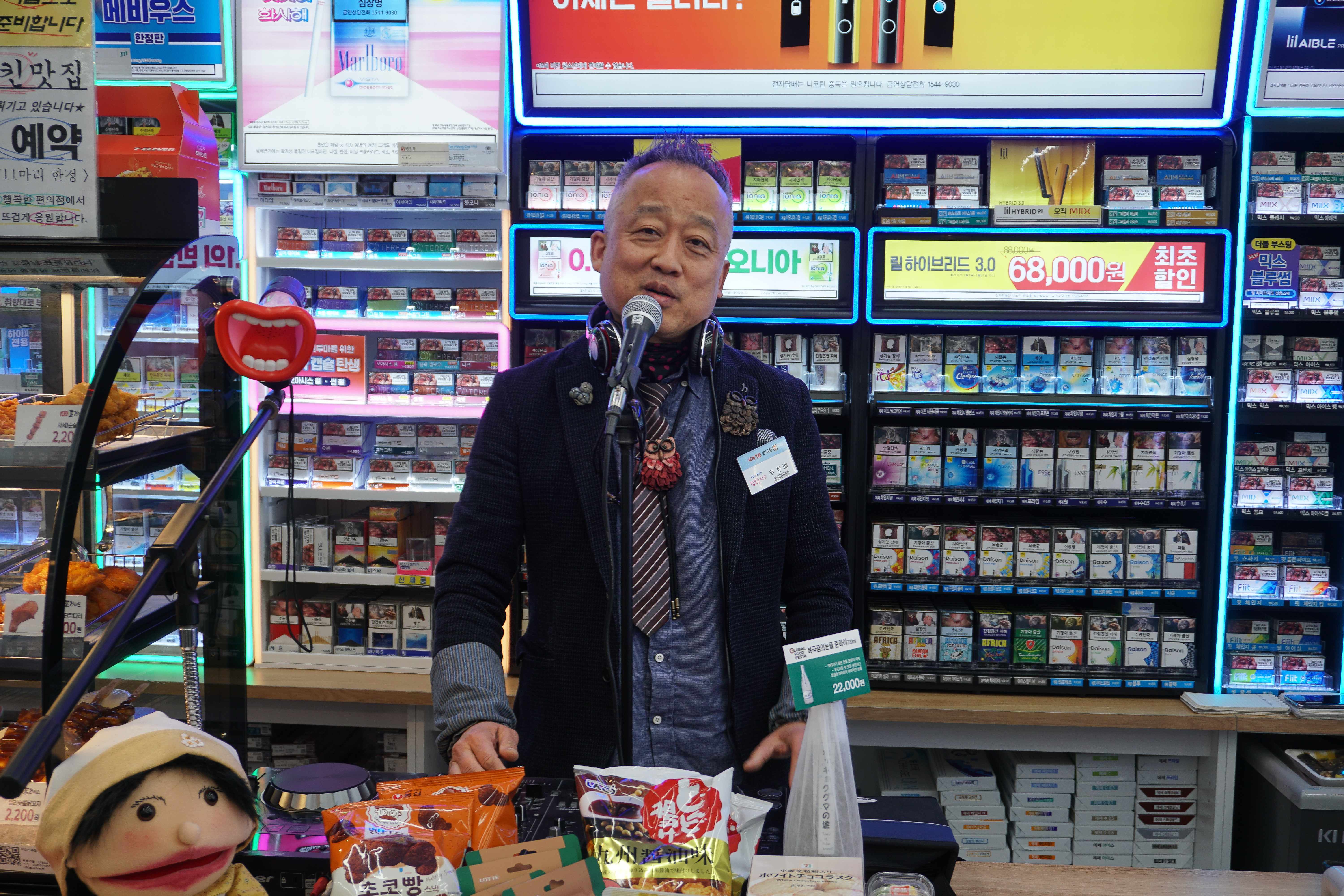 그냥 봤을 때는 일반적인 편의점이었지만, 오가는 손님에게 마이크에 대고 "우와"라는 시그니처 멘트와 함께 인사를 건네시는 모습을 볼 수 있었고, 분위기에 따라 조명까지 바꿔가며 디제잉을 하시는 모습도 볼 수 있었습니다.
