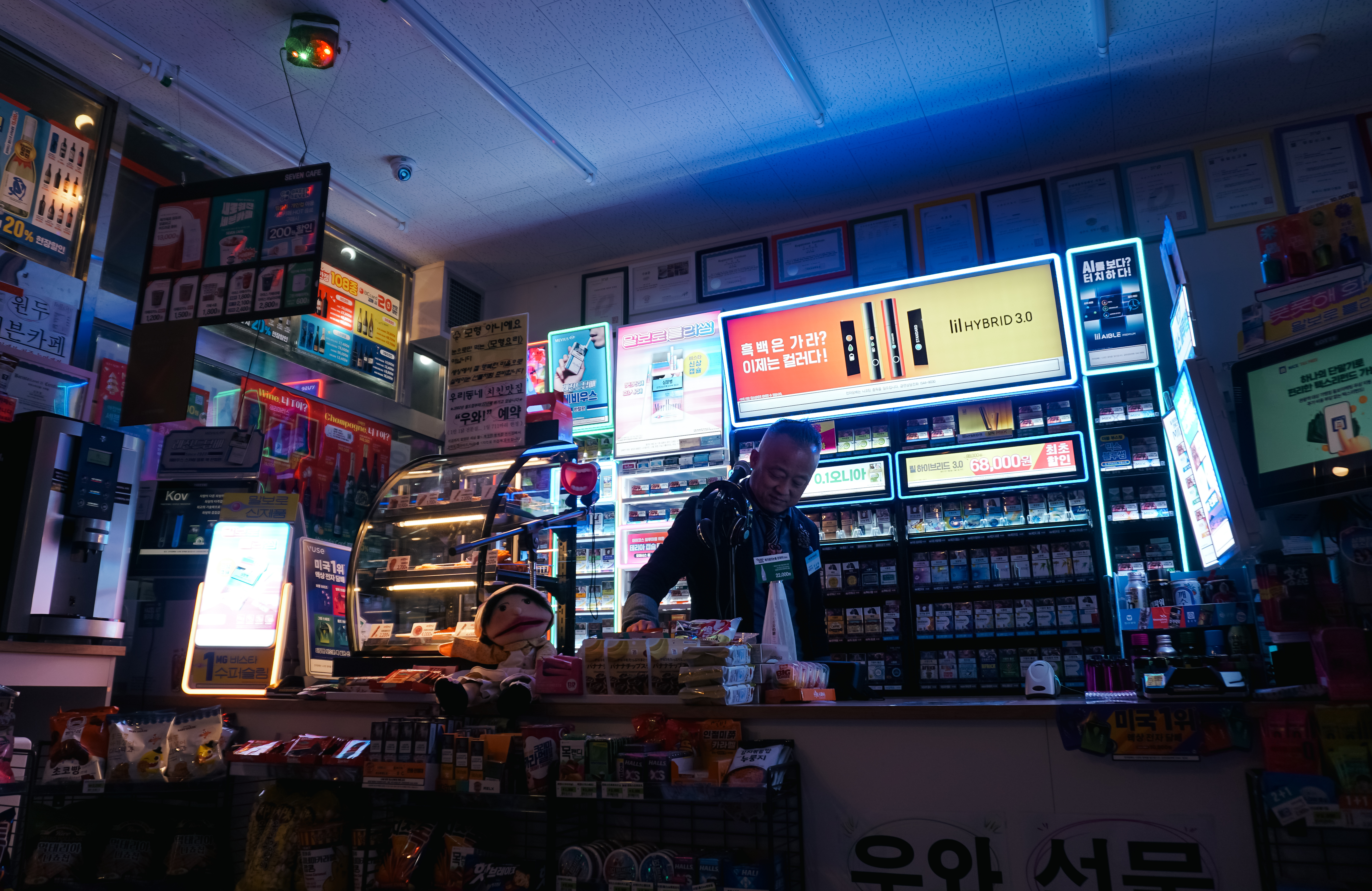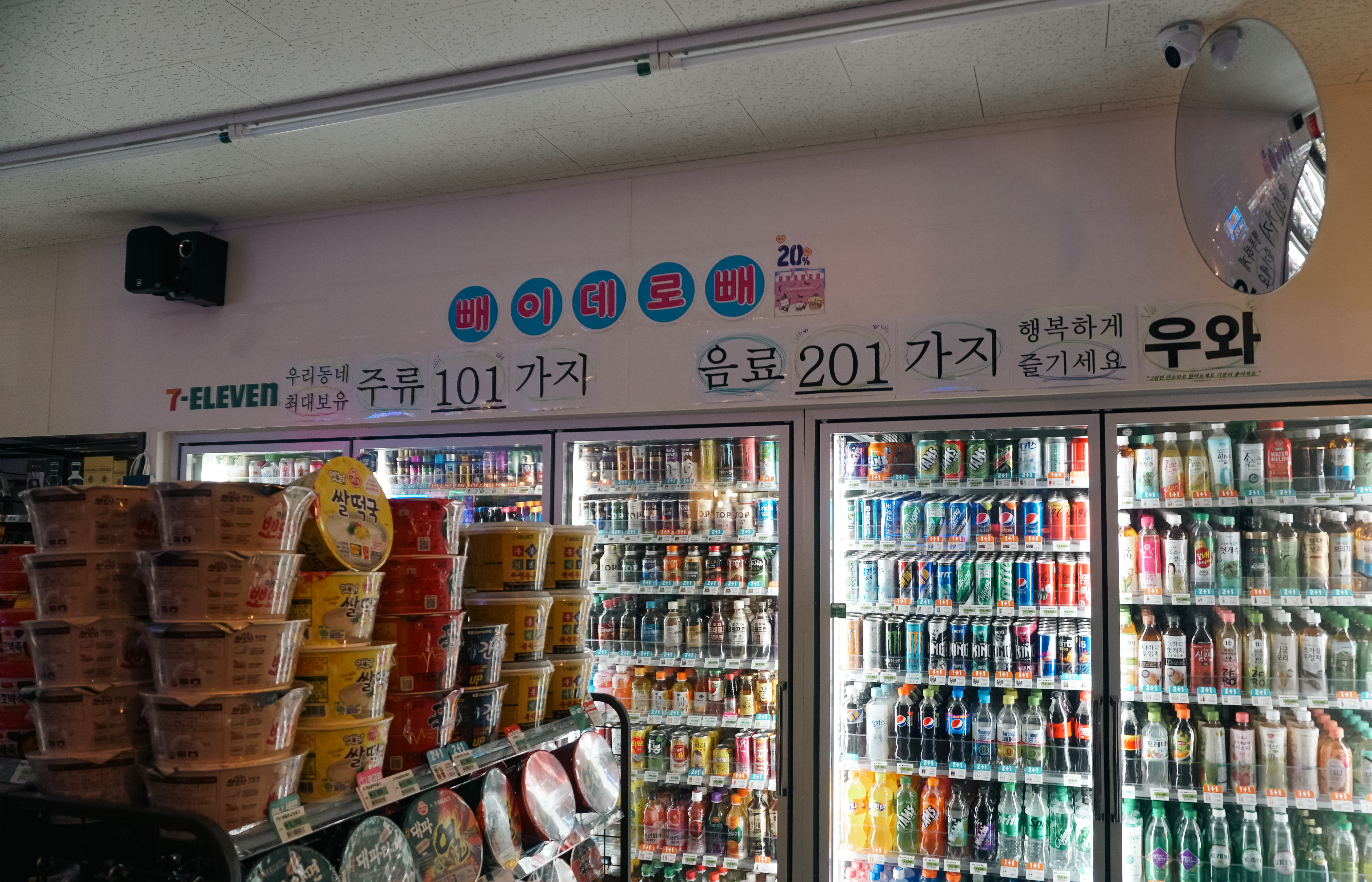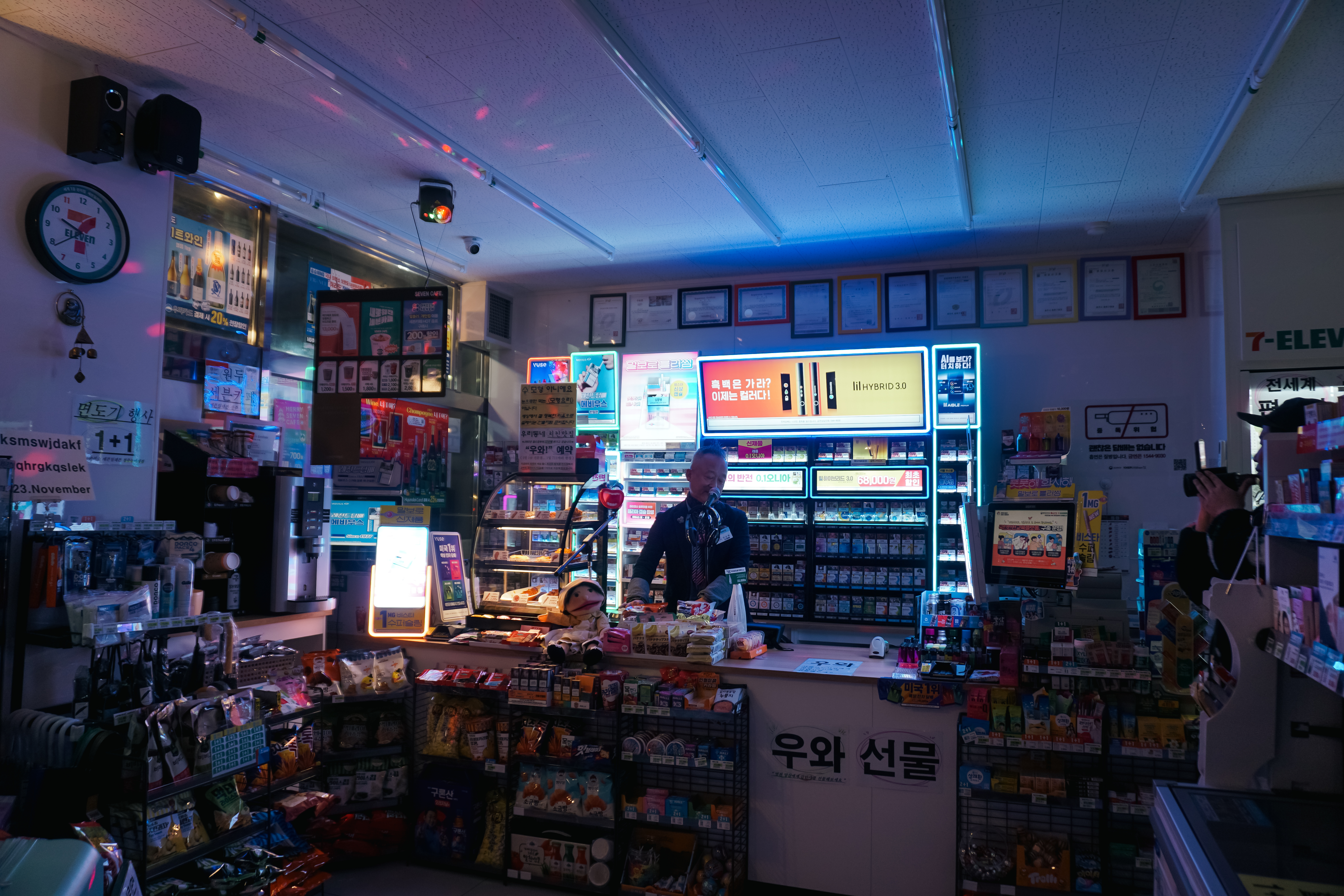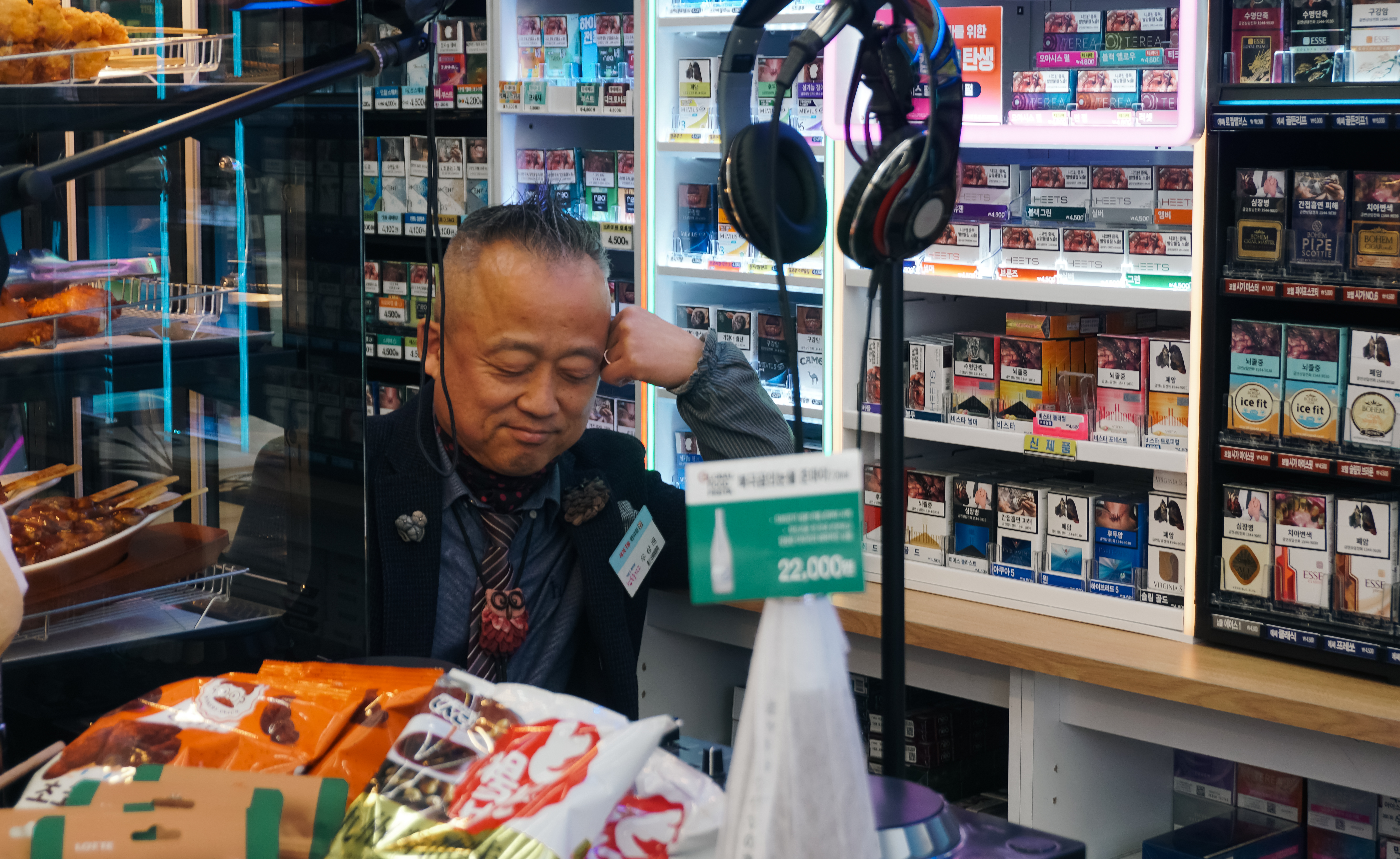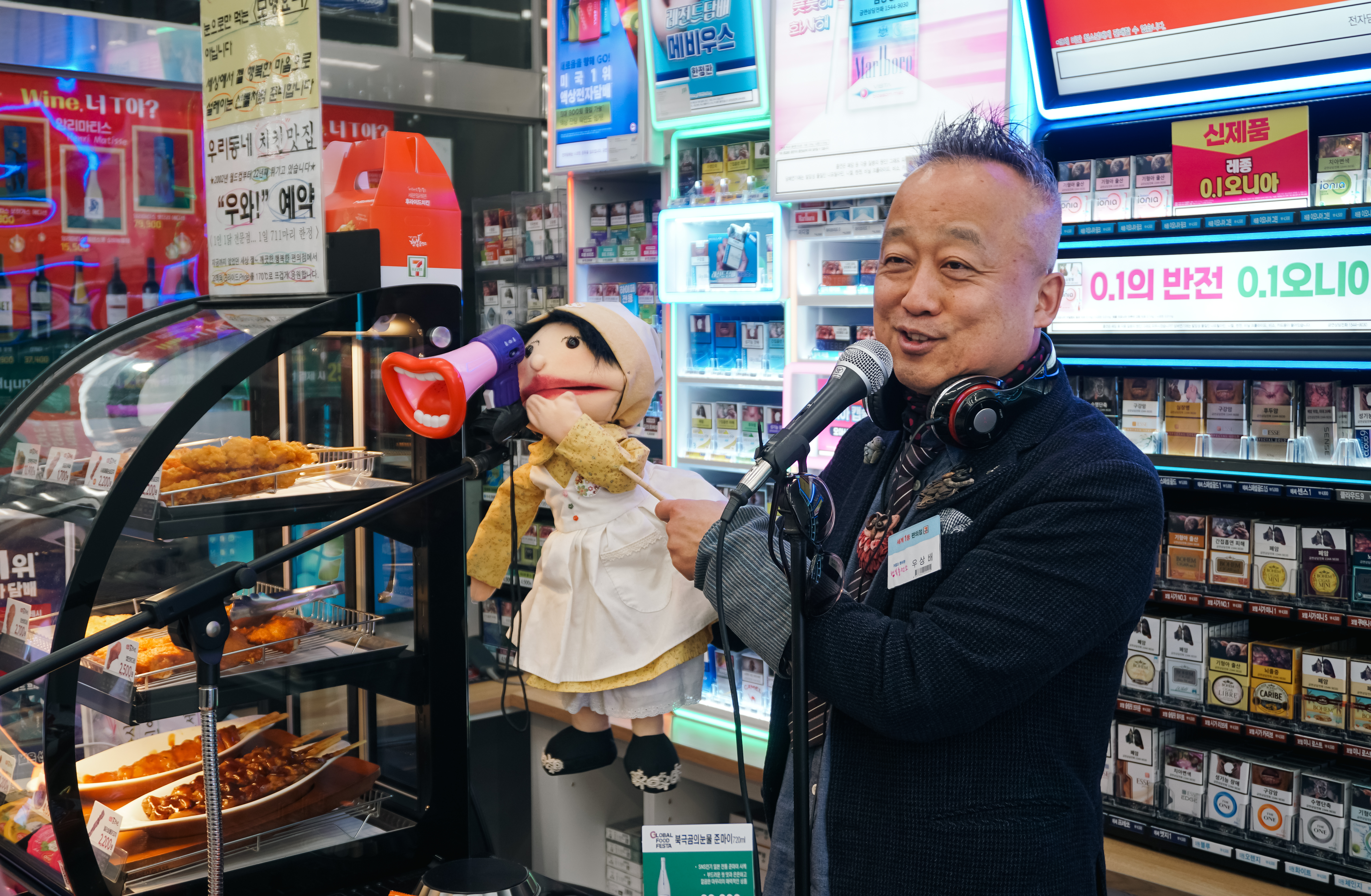 그냥 봤을 때는 일반적인 편의점이었지만, 오가는 손님에게 마이크에 대고 "우와"라는 시그니처 멘트와 함께 인사를 건네시는 모습을 볼 수 있었고, 분위기에 따라 조명까지 바꿔가며 디제잉을 하시는 모습도 볼 수 있었습니다.