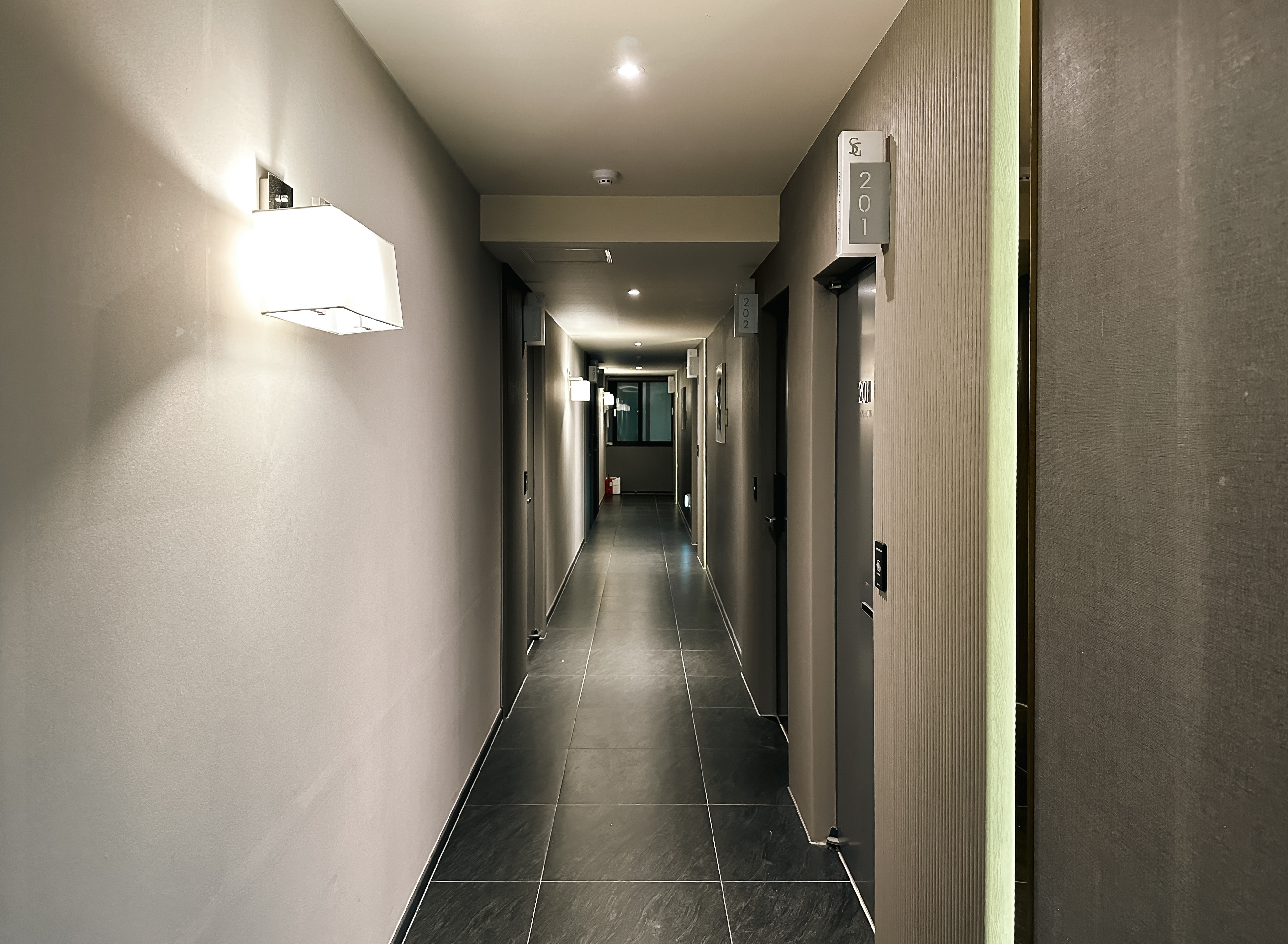 제가 선택한 방은 한실(온돌)이었는데, 전자제품은 냉장고와 에어컨, 공기청정기, PC, TV, 커피포트, 헤어드라이어가 있었습니다. 바닥에 그을린 자국을 보면 알 수 있듯이 처음엔 잘 몰랐는데, 잘 때 보니까 바닥이 너무 뜨거워서 자는 동안 데굴데굴 굴러다녔습니다. 정말 덥고 뜨거웠습니다. 보통은 욕실도 같이 찍는 편인데 이 날은 정신이 없었는지 욕실까지는 찍지 못했습니다.