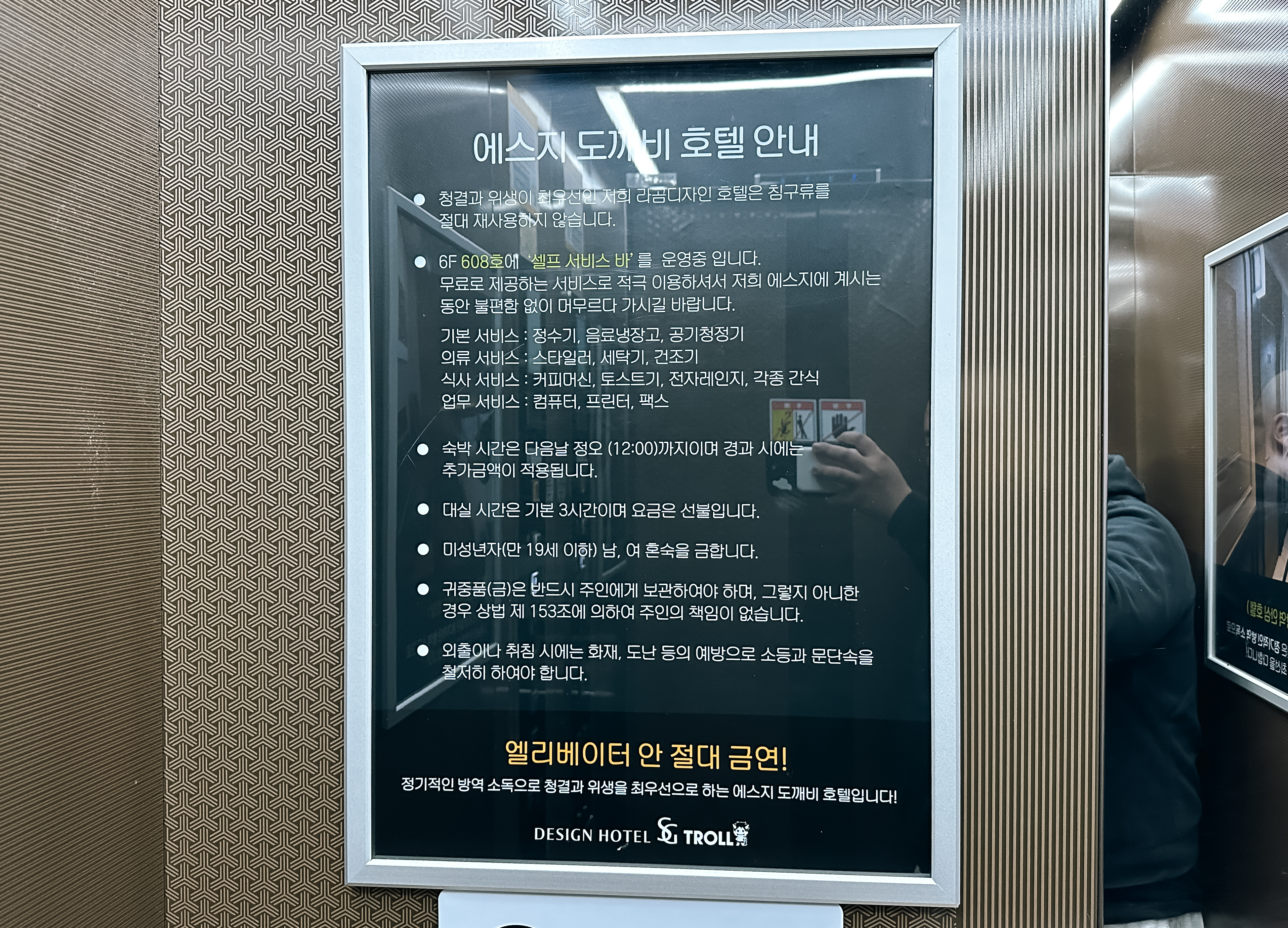 서비스 시설에는 세탁기와 건조기, 의류관리기가 있었고, 토스트와 우유, 커피 같은 간단한 조식은 07:00~09:00까지 운영되고 있다고 하는데, 저는 늦게 일어나서 이용하지는 못했습니다.
