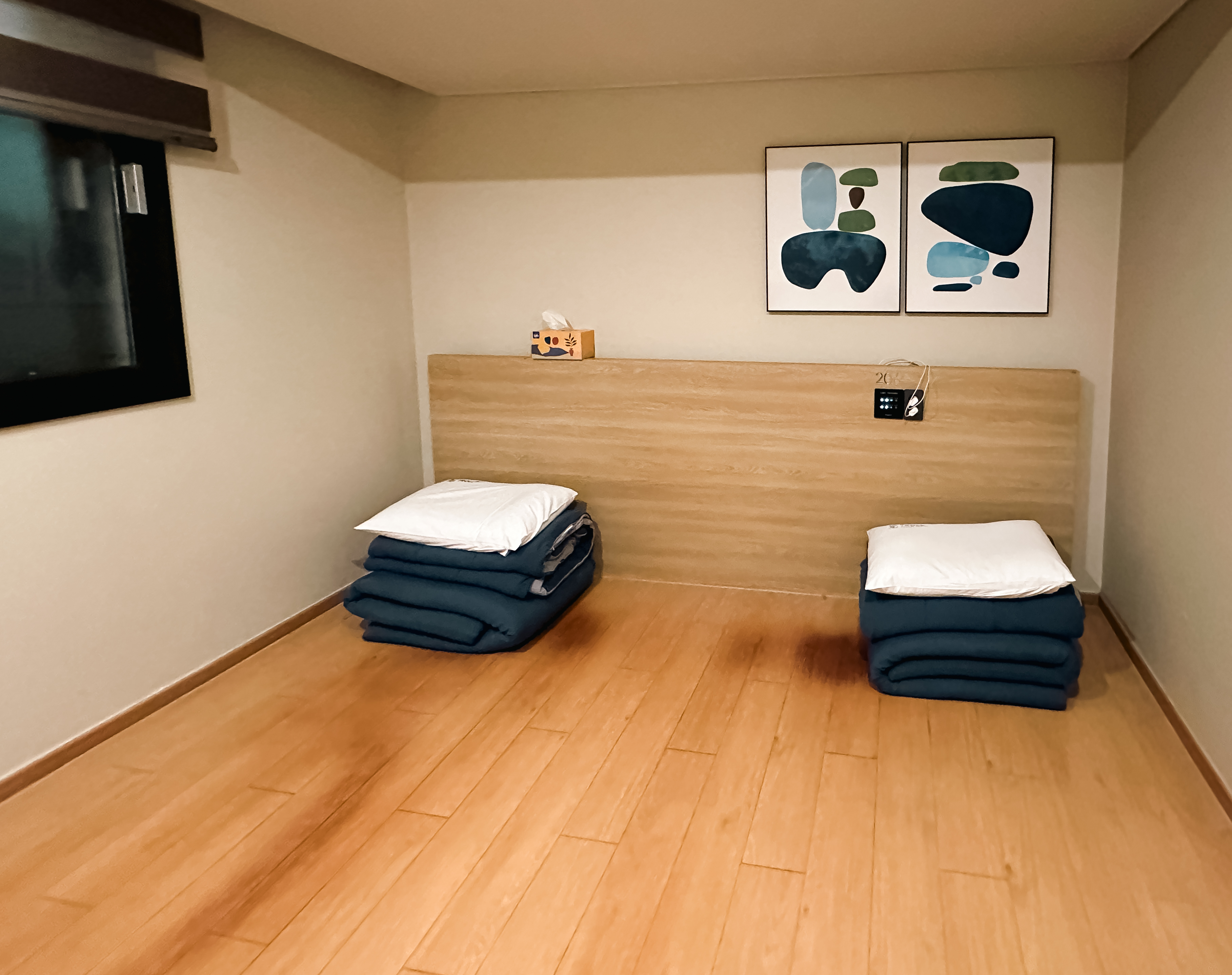 제가 선택한 방은 한실(온돌)이었는데, 전자제품은 냉장고와 에어컨, 공기청정기, PC, TV, 커피포트, 헤어드라이어가 있었습니다. 바닥에 그을린 자국을 보면 알 수 있듯이 처음엔 잘 몰랐는데, 잘 때 보니까 바닥이 너무 뜨거워서 자는 동안 데굴데굴 굴러다녔습니다. 정말 덥고 뜨거웠습니다. 보통은 욕실도 같이 찍는 편인데 이 날은 정신이 없었는지 욕실까지는 찍지 못했습니다.