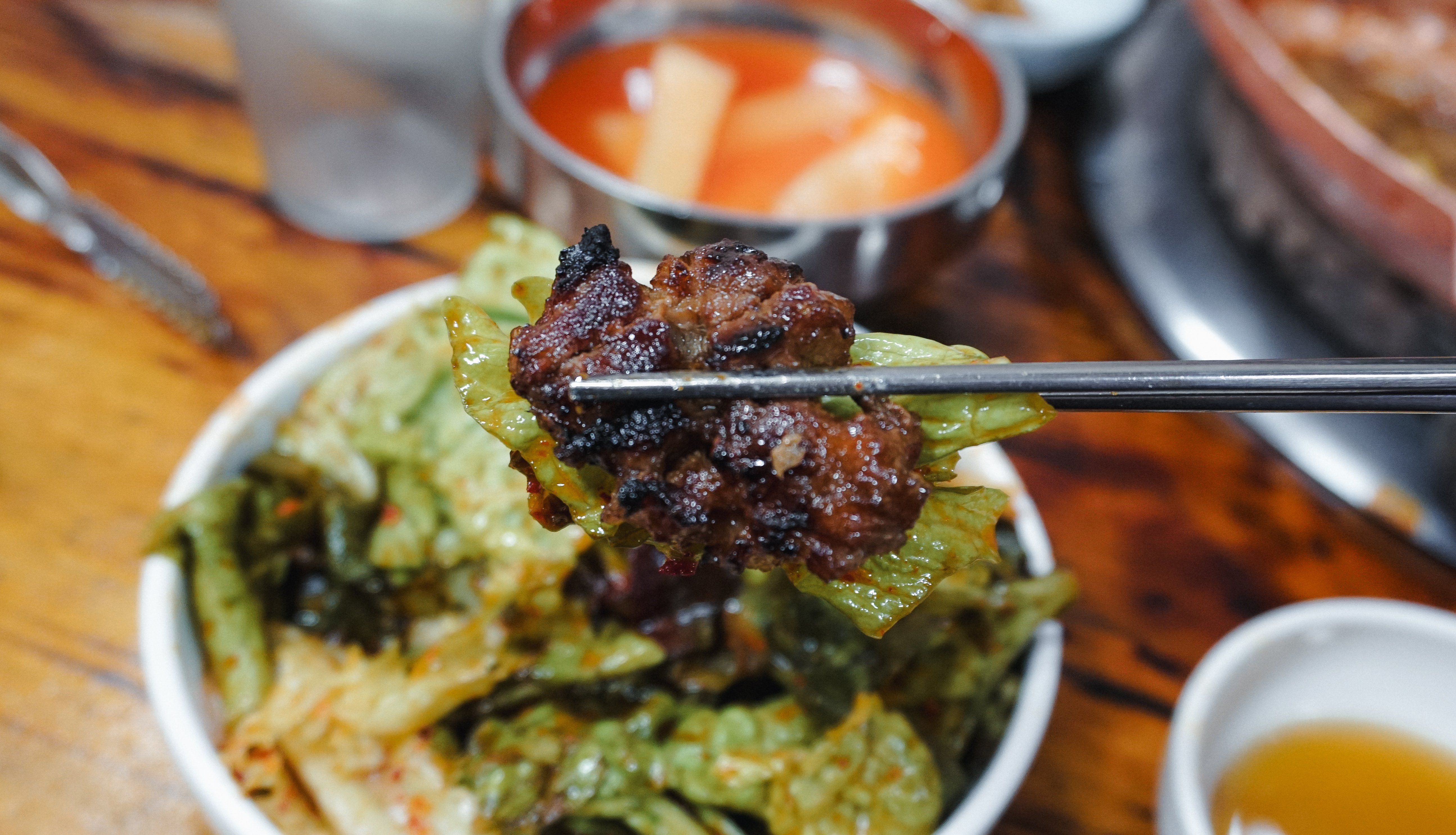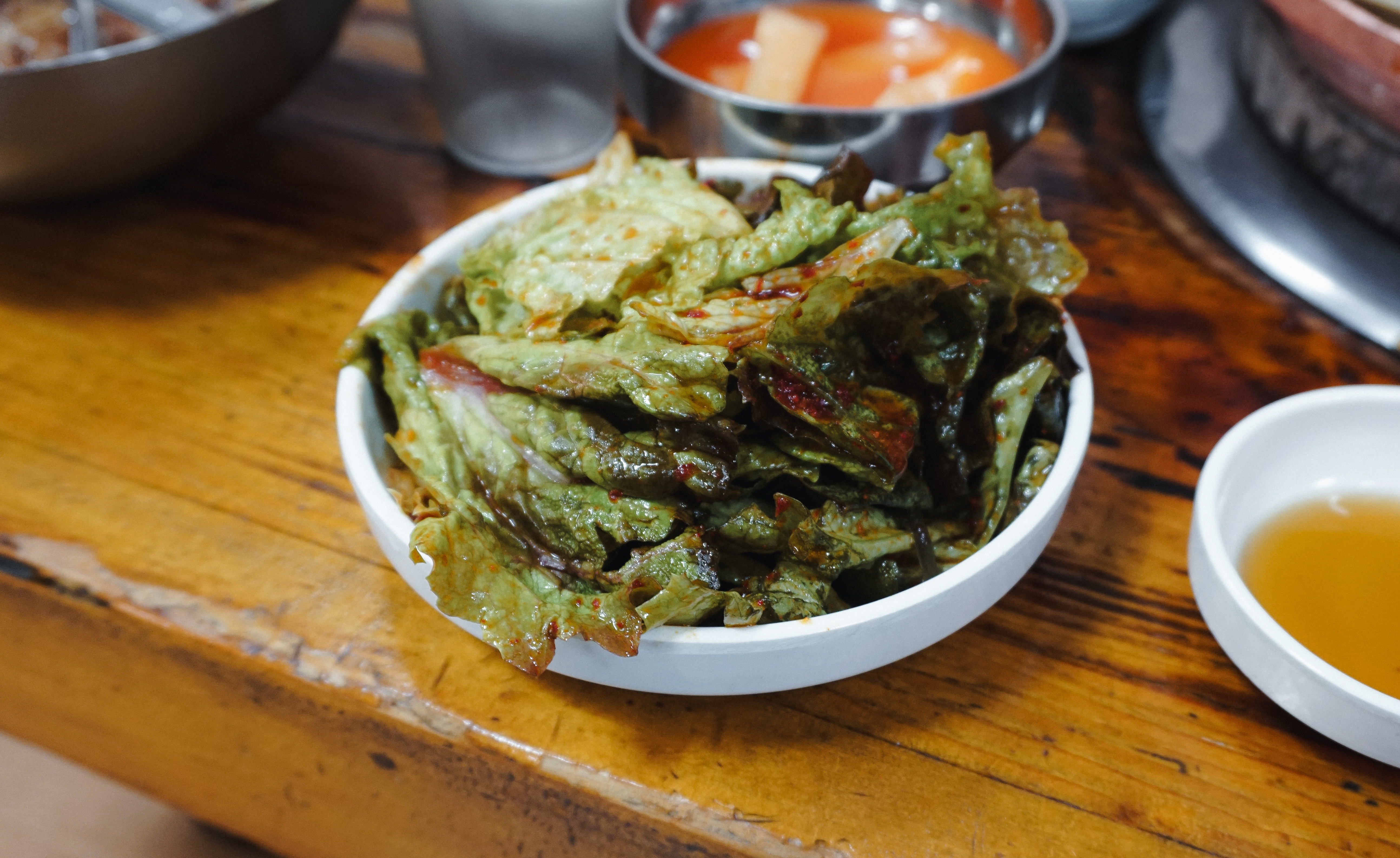 메뉴는 간단한 반찬들과 함께 제공되었습니다. 반찬에는 분홍소시지와 샐러드, 동치미, 마늘종, 콩나물무침, 쌈무 등이 있었습니다. 특히 돼지갈비는 전용 화로에 직접 익혀서 먹도록 되어있었는데, 돼지갈비 양념에 끓여 먹도록 하고 있었습니다.