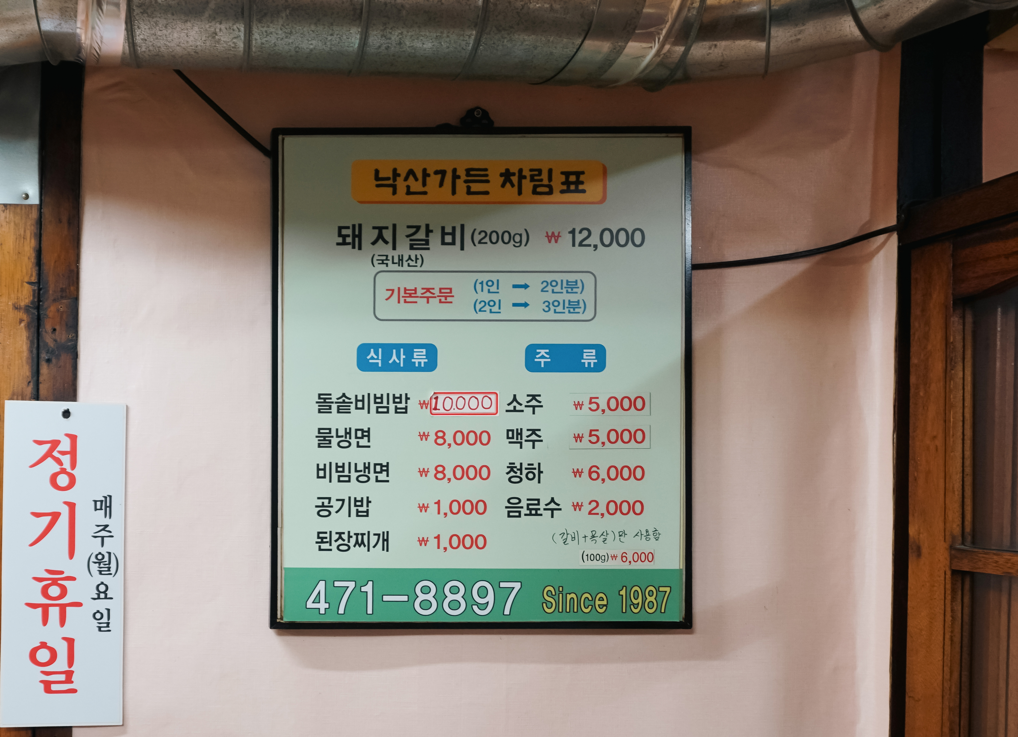 대구 낙산가든의 메뉴는 위와 같습니다. 돼지갈비, 돌솥비빔밥, 물냉면, 비빔냉면, 된장찌개 등이 있었고, 주문은 1인(2인분), 2인(3인분) 식으로 인원수(+1) 해서 주문 하라고 안내하고 있었습니다. 돼지갈비 1인분의 가격은 12,000원으로 크게 부담스럽지는 않았습니다.