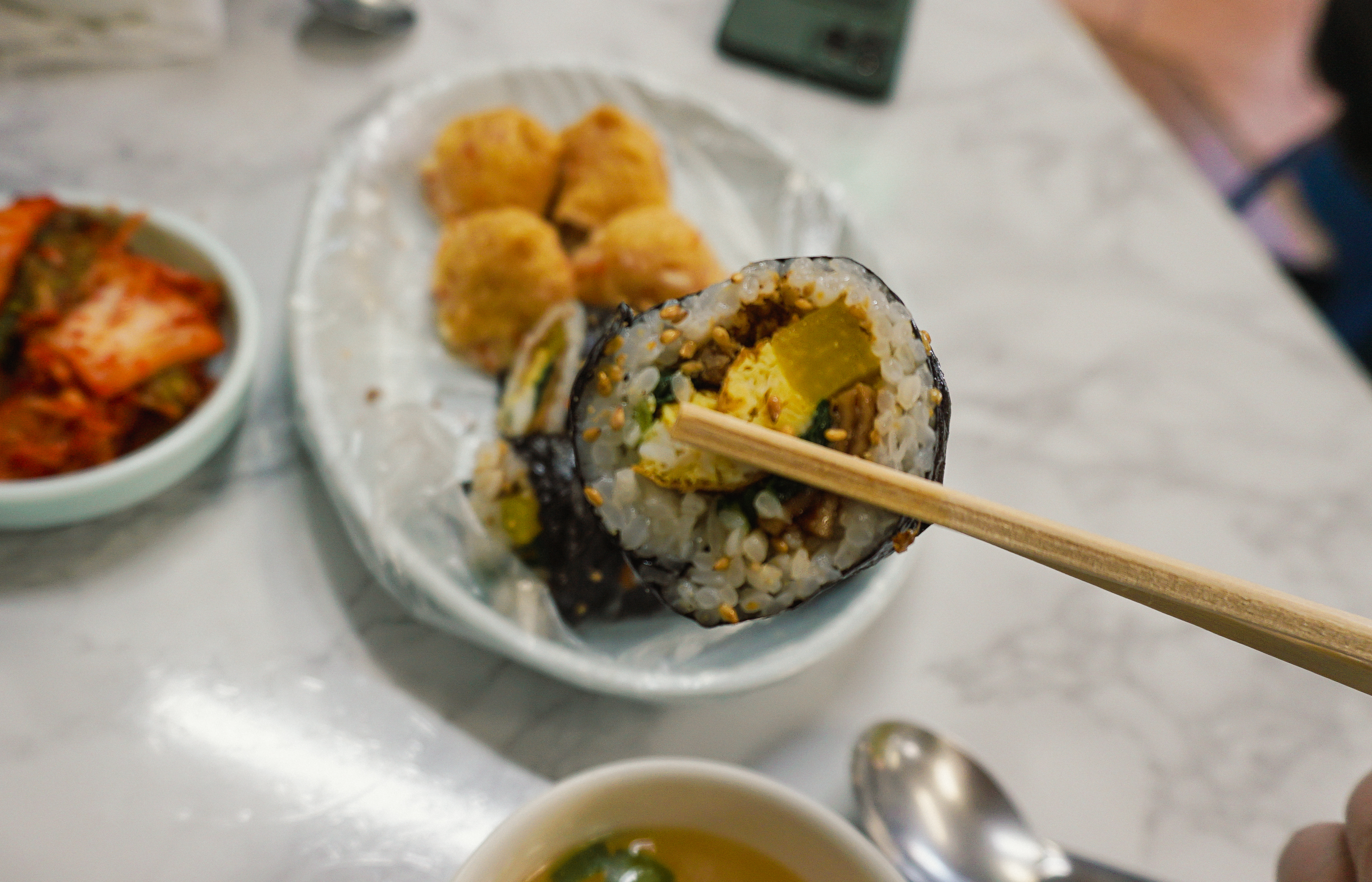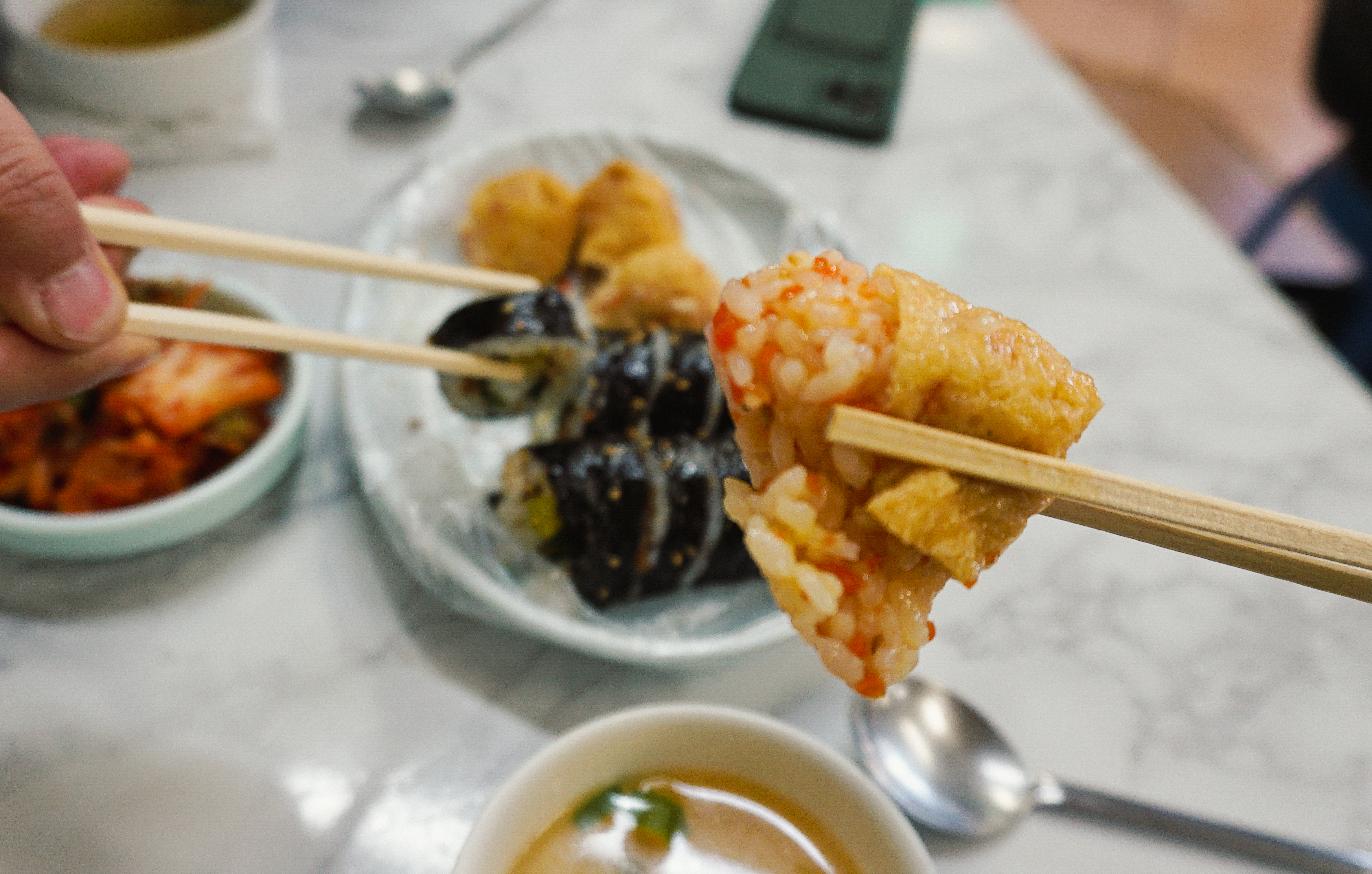 에덴김밥의 계란김밥은 색도 고왔고, 일반적인 김밥보다 따뜻하게 먹을 수 있어서 맛이 좋았고, 같이 나온 김치도 직접 담가서 그런지 김밥과 잘 어울리더라고요. 유부초밥은 쏘쏘, 에덴김밥은 고소하고 맛있었습니다.