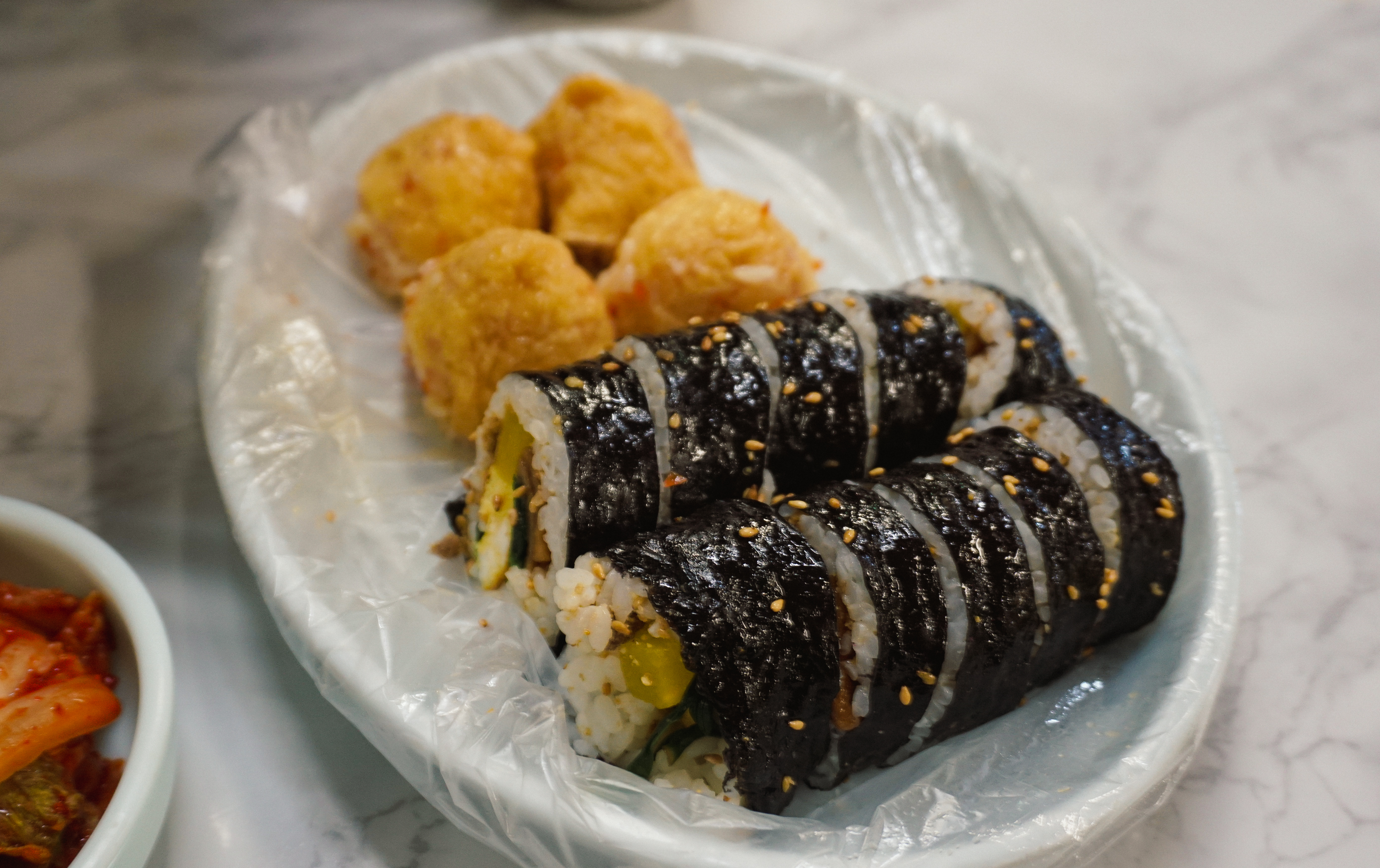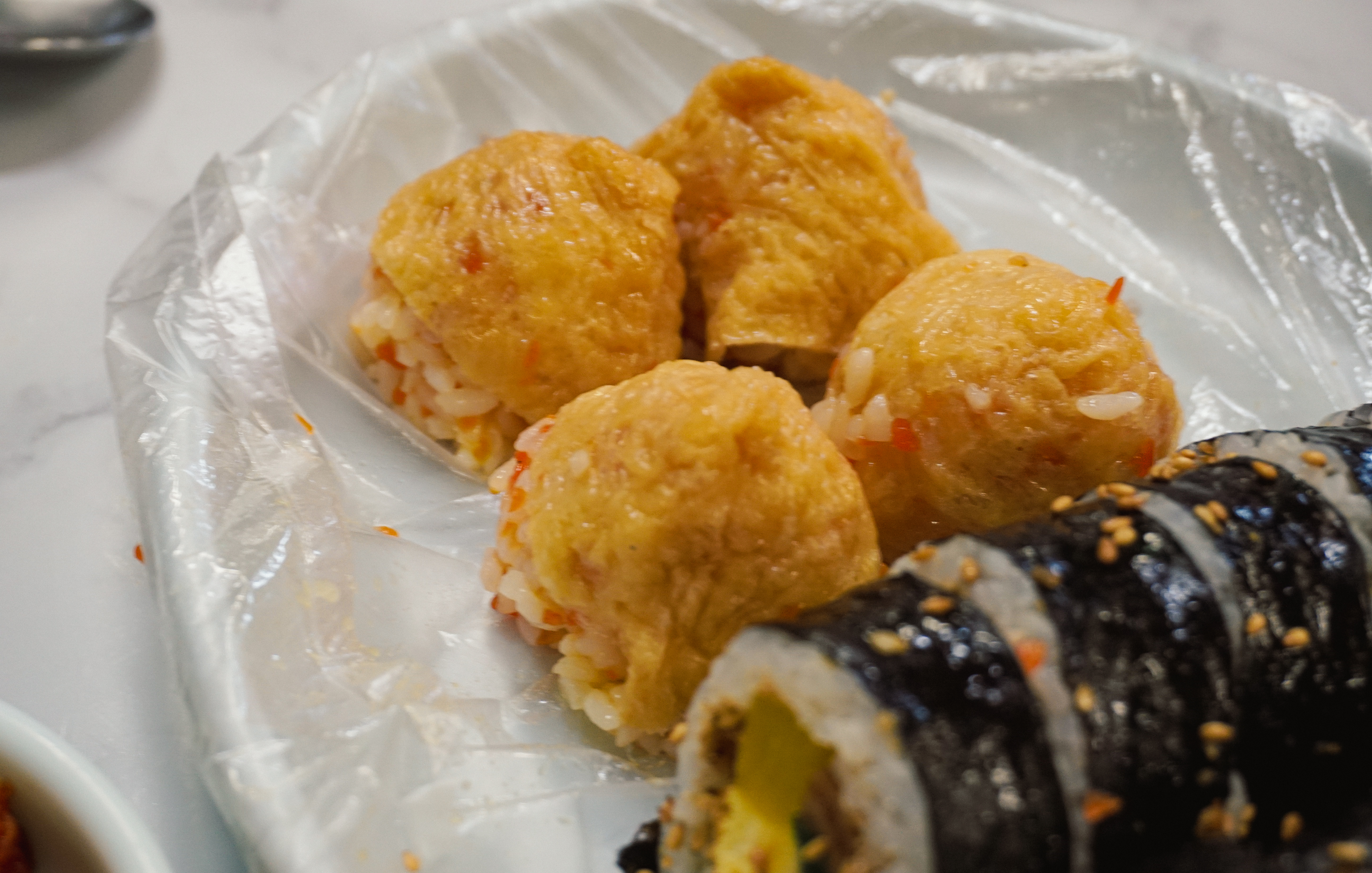 주문한 계란김밥과 초밥김밥이 나왔습니다. 사실 계란김밥은 어떻게 나올지 예상하고 있었지만, 초밥김밥은 일반김밥과 유부초밥을 반반 내어줄 거라고는 전혀 생각하지 못했는데 반반으로 내어주는 김밥이더라고요.
