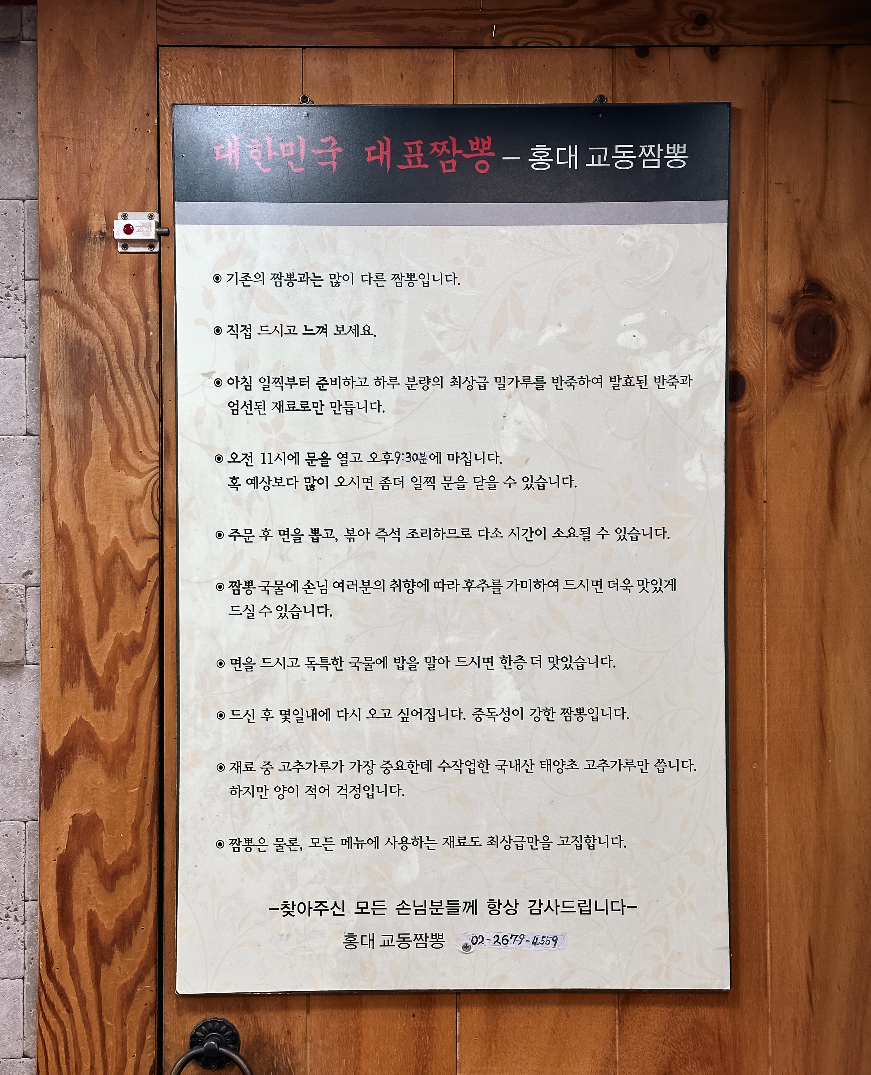 문래동 홍대교동짬뽕은 서울 영등포구 문래동4가 9-1 에 위치한 가게였습니다. 이 가게는 매주 토요일은 휴무로 운영중이었고, 11:00~21:30 까지 영업한다고 합니다. 특히 가게에서는 면을 먹은 다음 밥을 말아먹으면 한층 더 맛있다는 안내를 하고 있었습니다.