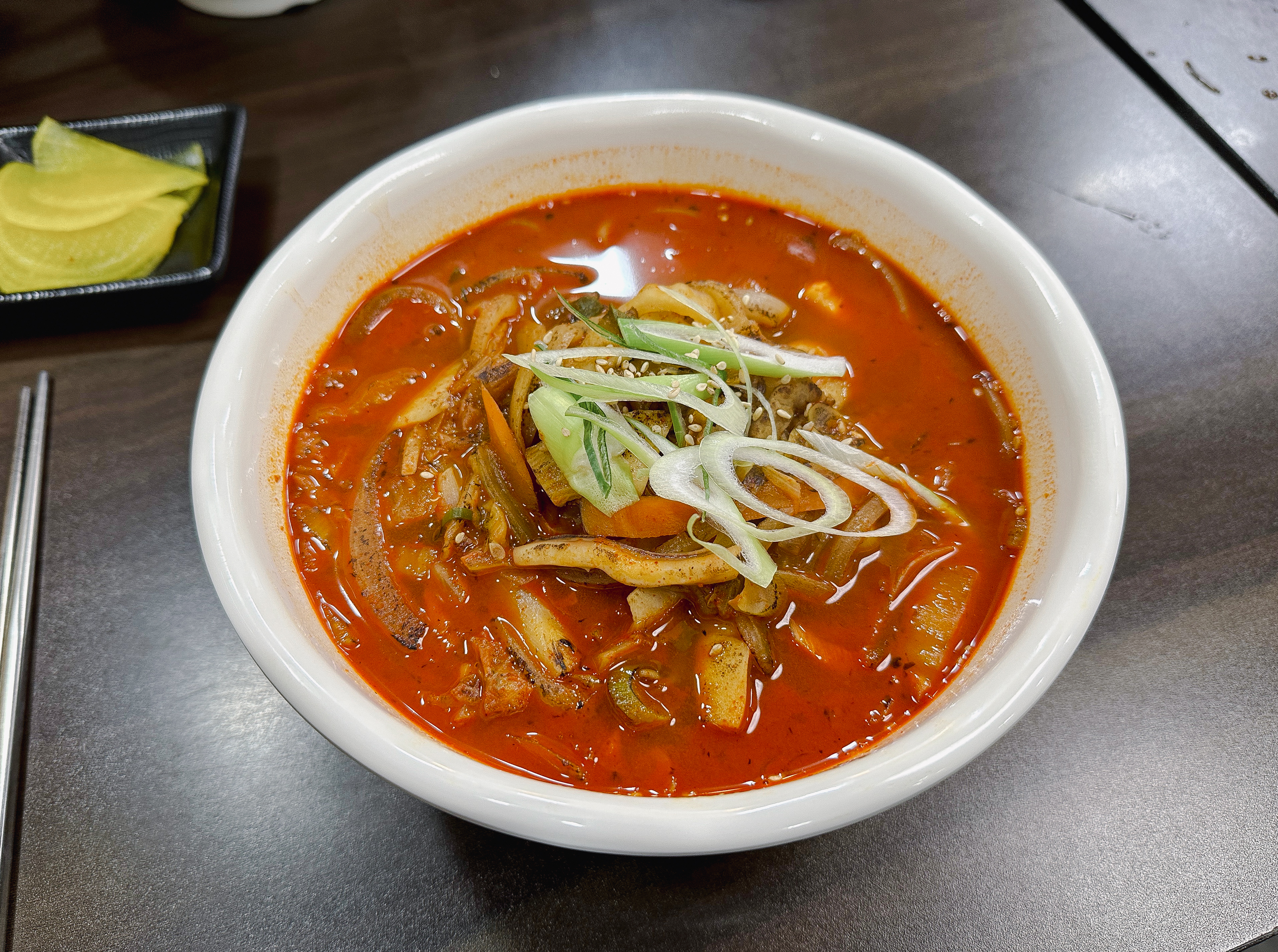 메뉴는 위와 같이 돼지고기와 해산물이 함께 들어간 짬뽕이었습니다. 해산물은 보통의 짬뽕과는 다르게 홍합이나 어패류는 들어있지 않고, 오징어와 위소라가 들어있었고 국물엔 고운 분말의 고춧가루가 들어가 부드러우면서도 깔끔한 맛이 좋았습니다. 특히 불맛 나는 짬뽕의 국물은 밥을 말아서 먹으면 좋았습니다.