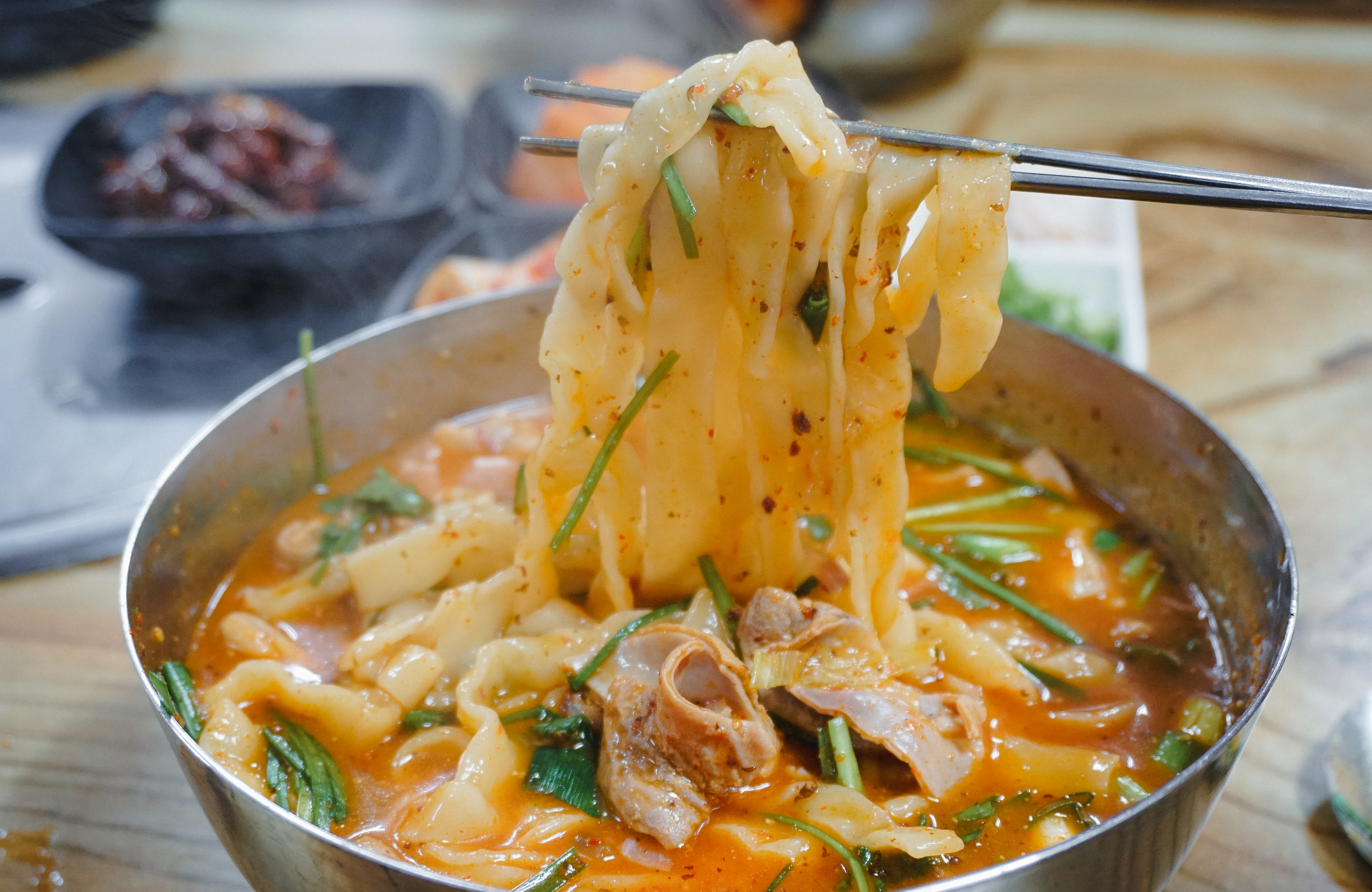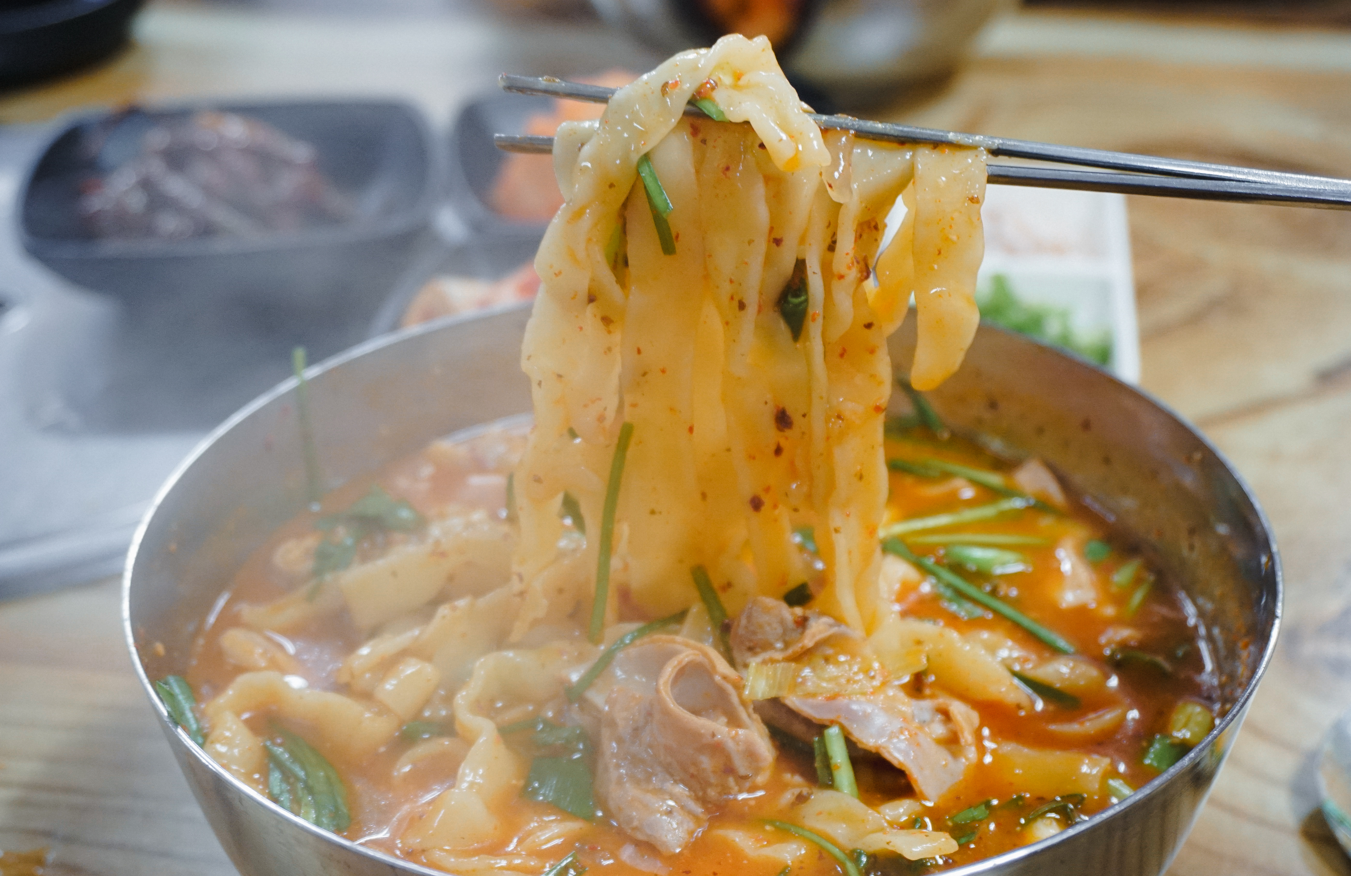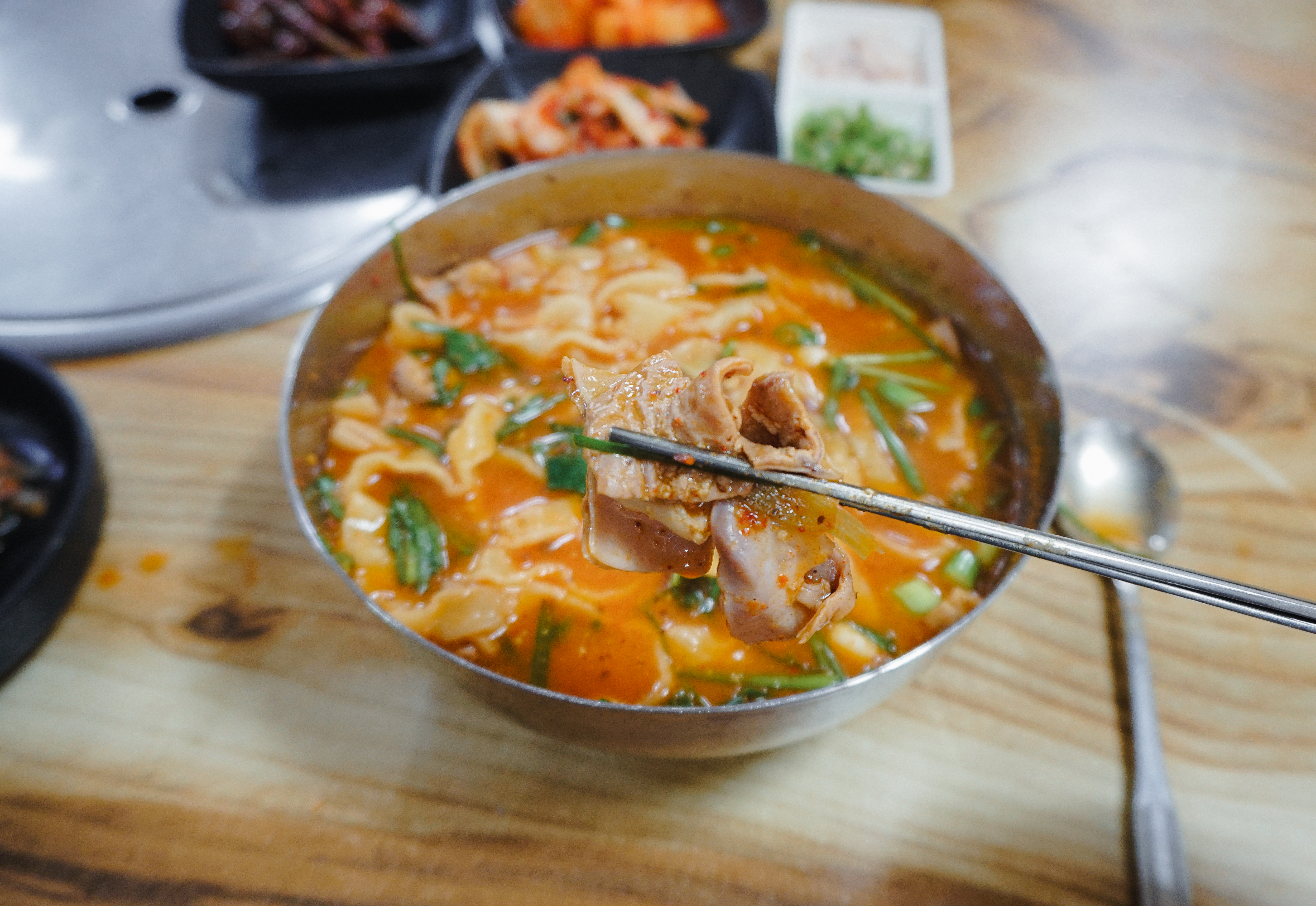 저는 순대를 먹지 않아서 그릇에 덜어내고 곱창칼국수만 먹었습니다. 팔복순대의 곱창칼국수는 곱창전골을 먹는 것처럼 얼큰한 국물이 좋았고, 칼국수의 면발도 쫄깃탱글한 식감이 좋았습니다. 다른 곳에도 곱창칼국수를 더러 파는 곳이 있는 걸로 보이는데, 이렇게 전문적으로 곱창칼국수의 맛을 낸 곳은 아마 소개해드리는 팔복순대가 유일하지 않을까 생각합니다.