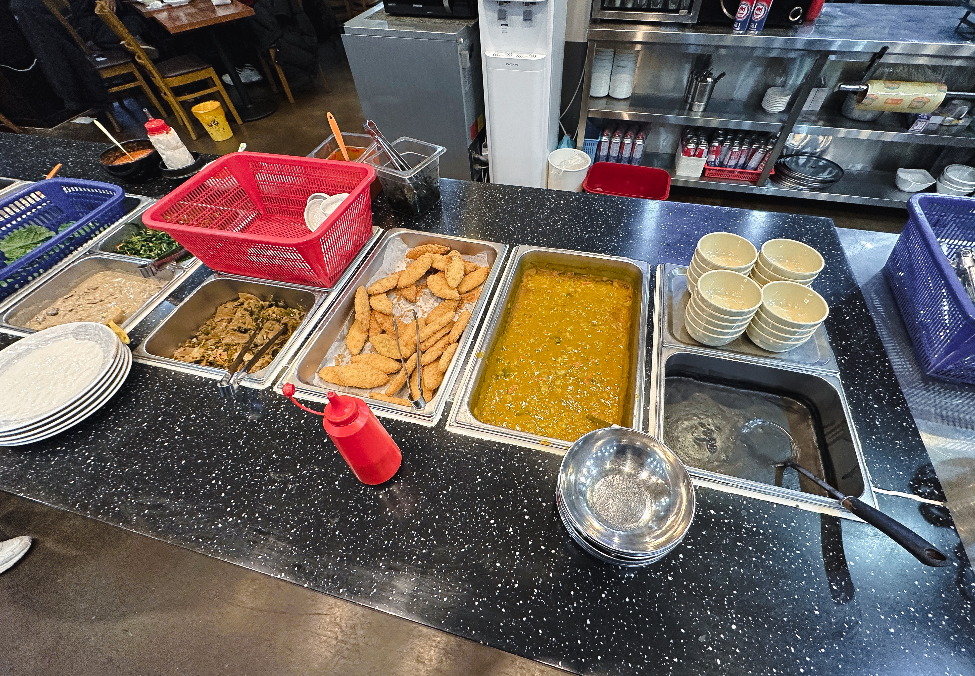 영아네밥상은 한식뷔페 겸 대패삼겹살 무한리필을 하고 있기 때문에, 다양한 반찬들과 함께 대패삼겹살을 먹을 수 있었습니다. 입맛에 맞는 반찬들을 골라 담아올 수 있었고, 대패삼겹살과 함께 먹을 쌈채소, 파절이, 김치, 상추, 묵은지 등을 가져와 먹을 수도 있었습니다. 대패삼겹살은 직원분들 눈치 안 보고 냉동고에서 직접 담아 올 수 있어서 편리했습니다.