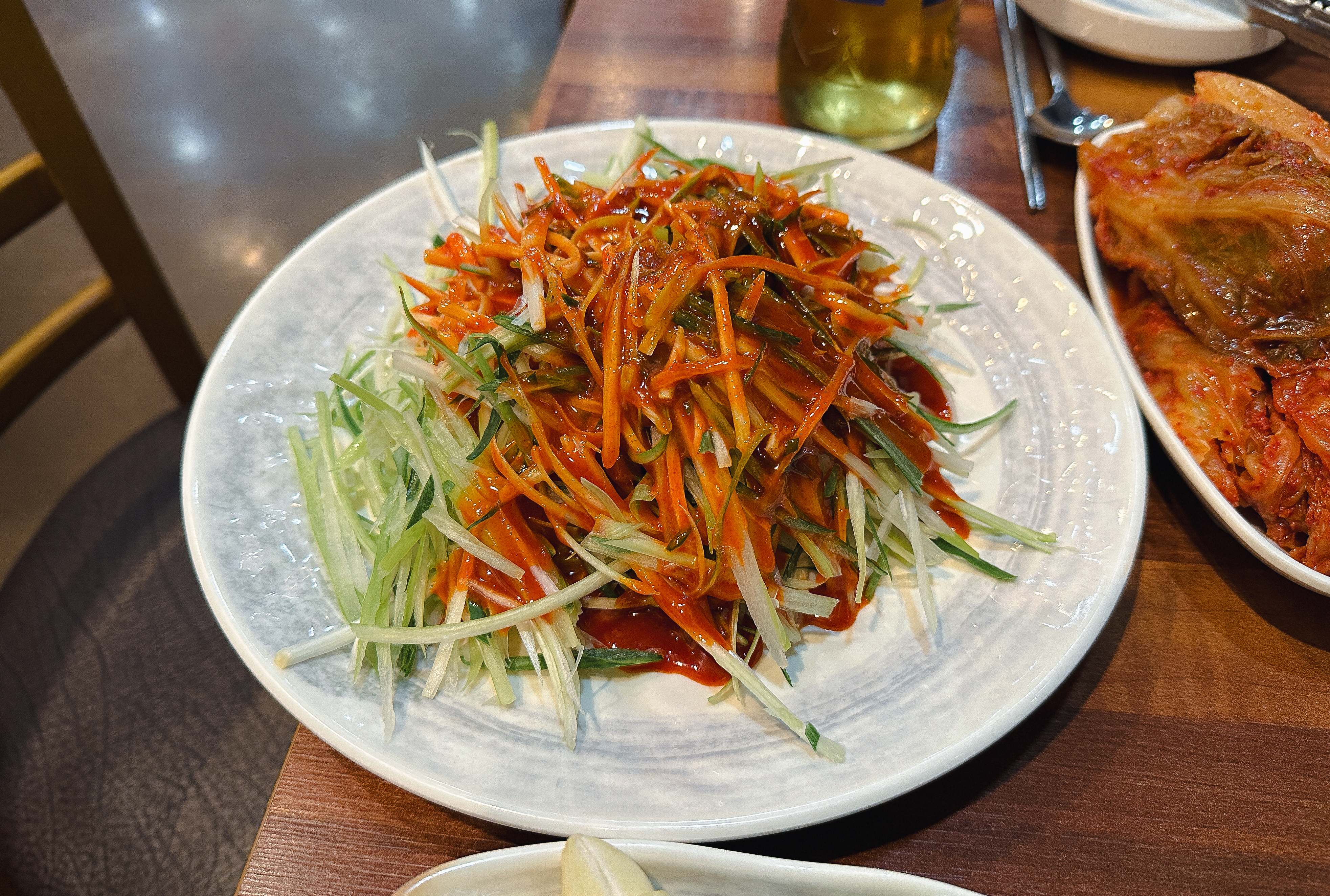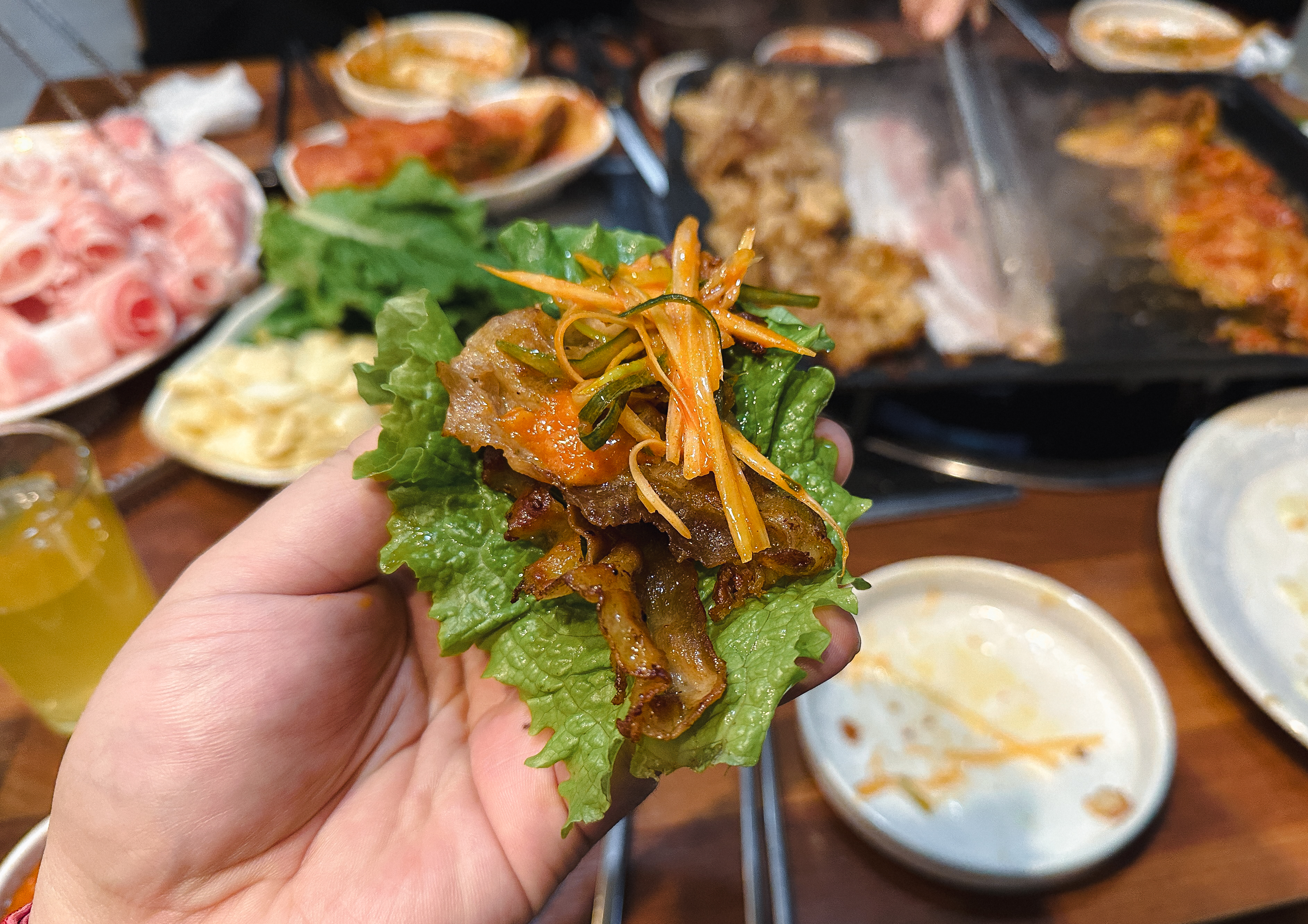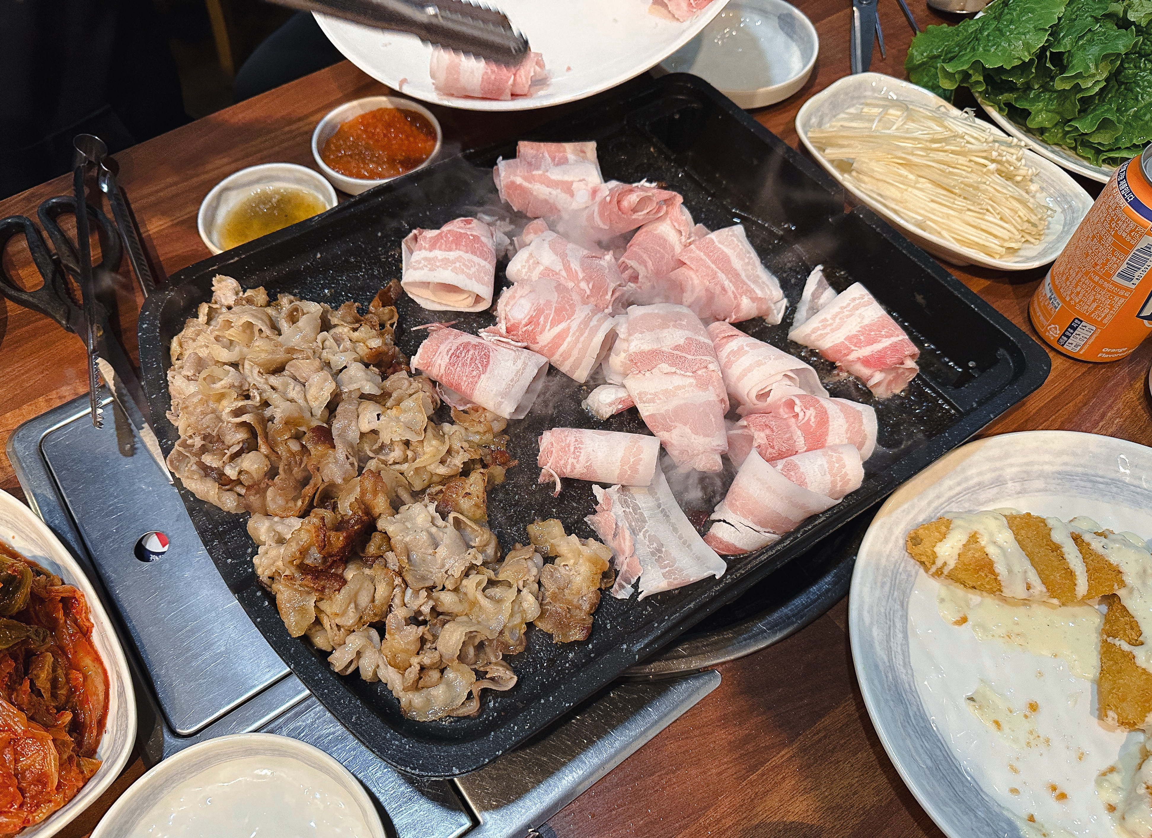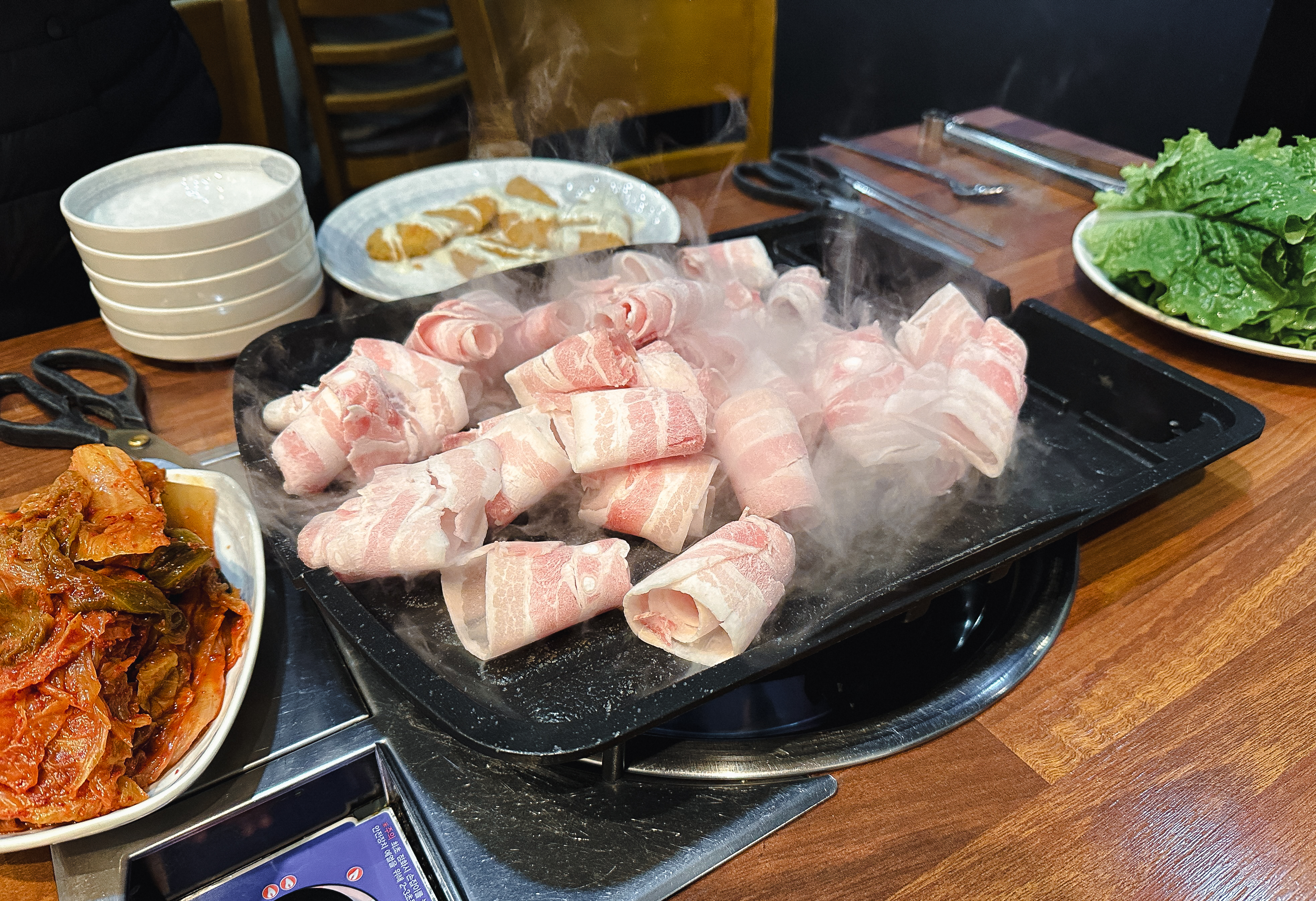 고기는 우리가 익히 알고 있는 대패삼겹살이었고, 특별할 것은 없었지만 대패삼겹살을 원하는 만큼 먹을 수 있다는 것이 참 좋았습니다. 파절이와 함께 대패삼겹살을 상추에 싸 먹었는데 고기가 얇아서 많이 먹을 수 있을 것 같았습니다.