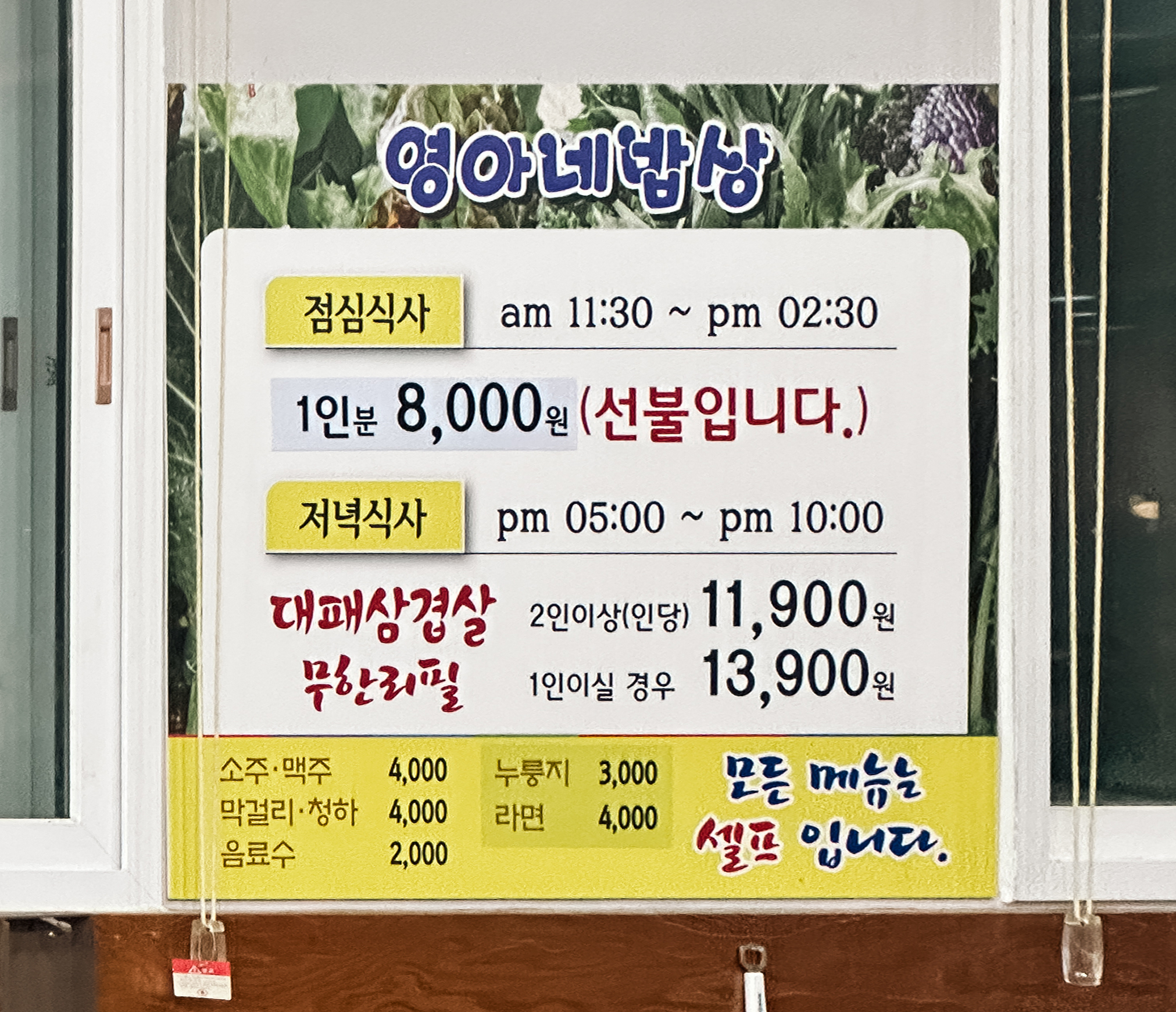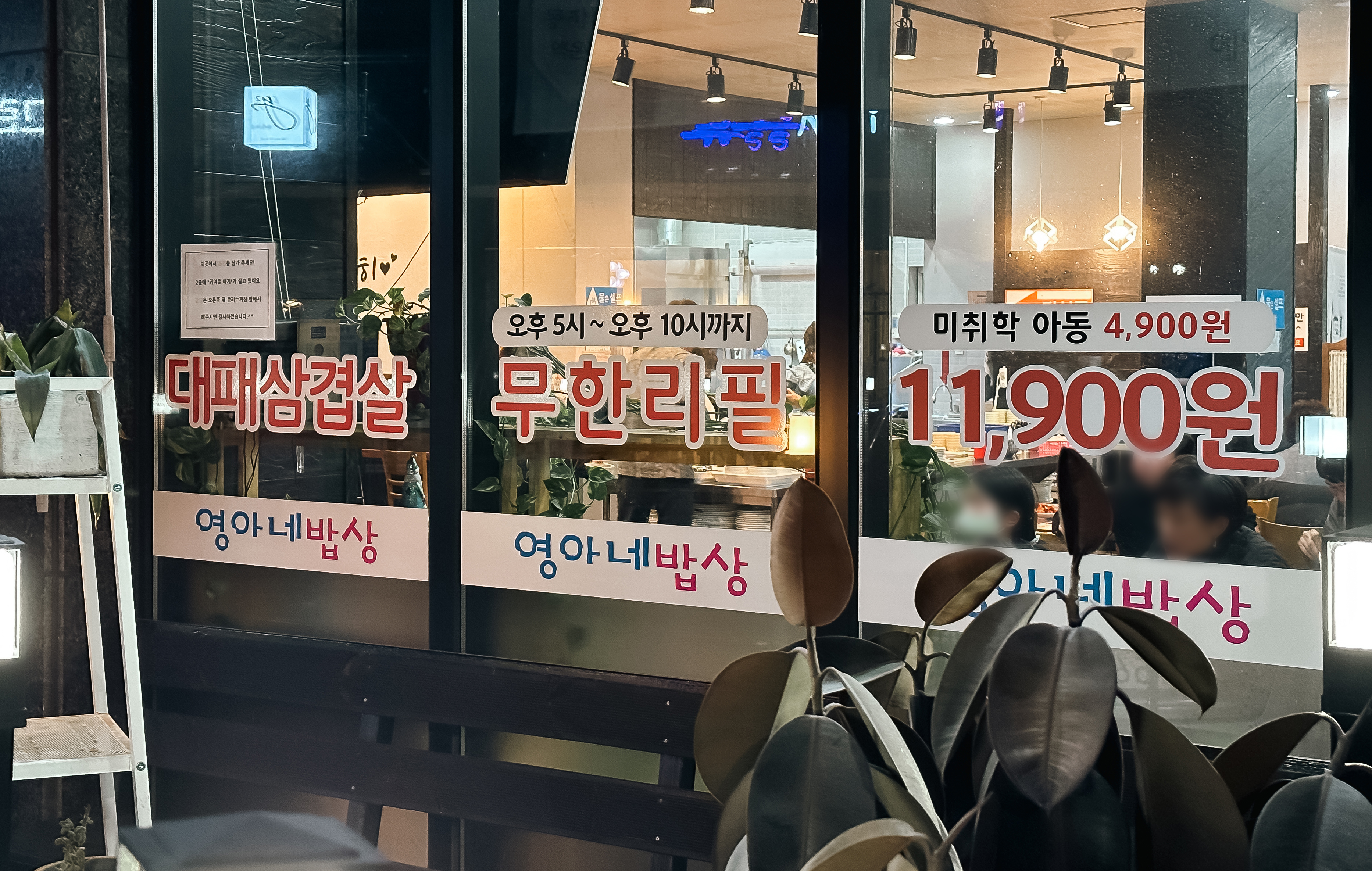 영아네밥상은 전북특별자치도 전주시 덕진구 송천동1가 332-1, 1층에 위치해 있었습니다. 이곳의 영업시간은 11:30~22:00 까지였으며, 매주 일요일은 휴무라고 합니다. 이곳은 대패 삼겹살을 11,900원에 무한리필로 식사할 수 있는 가게였습니다.