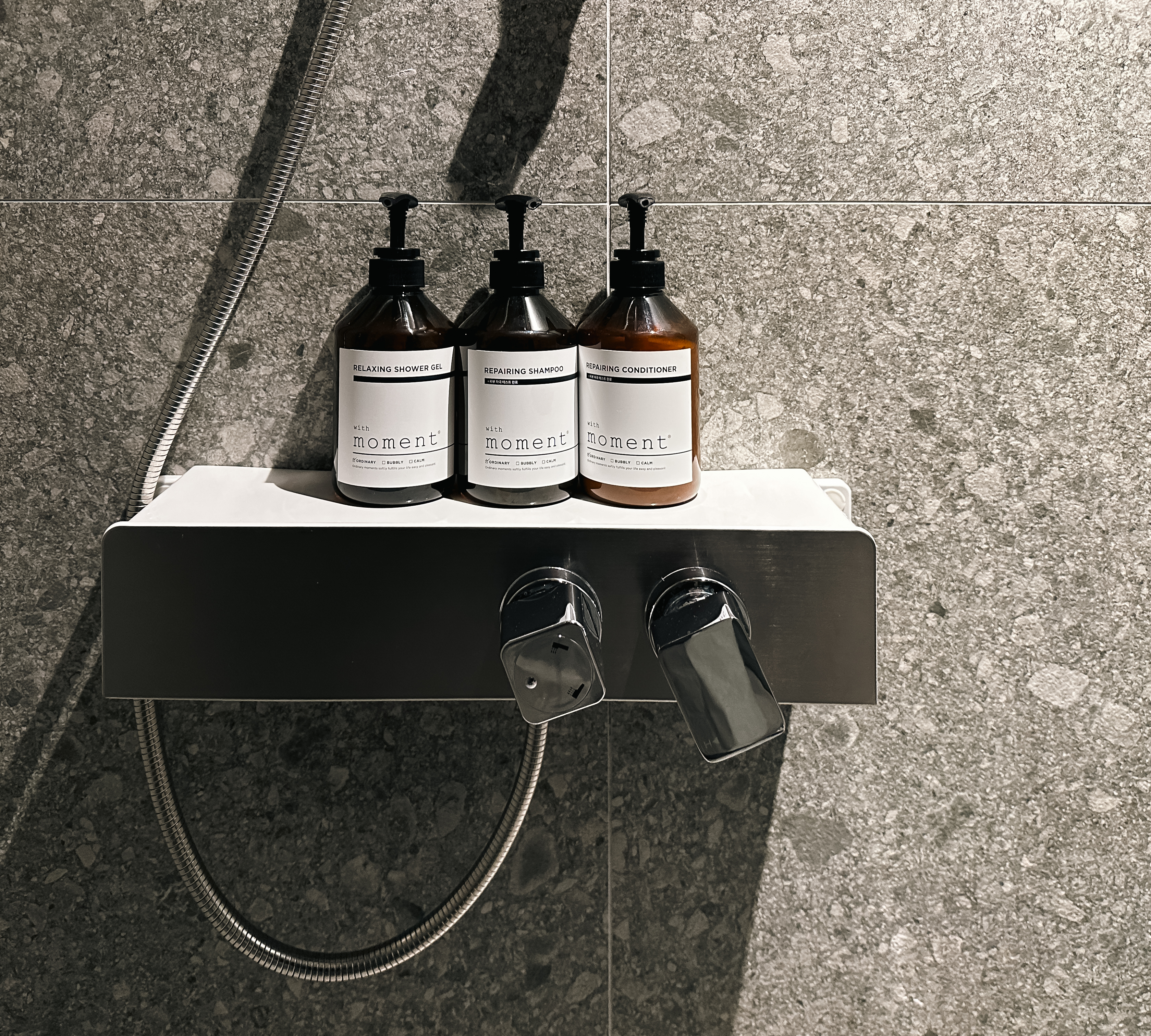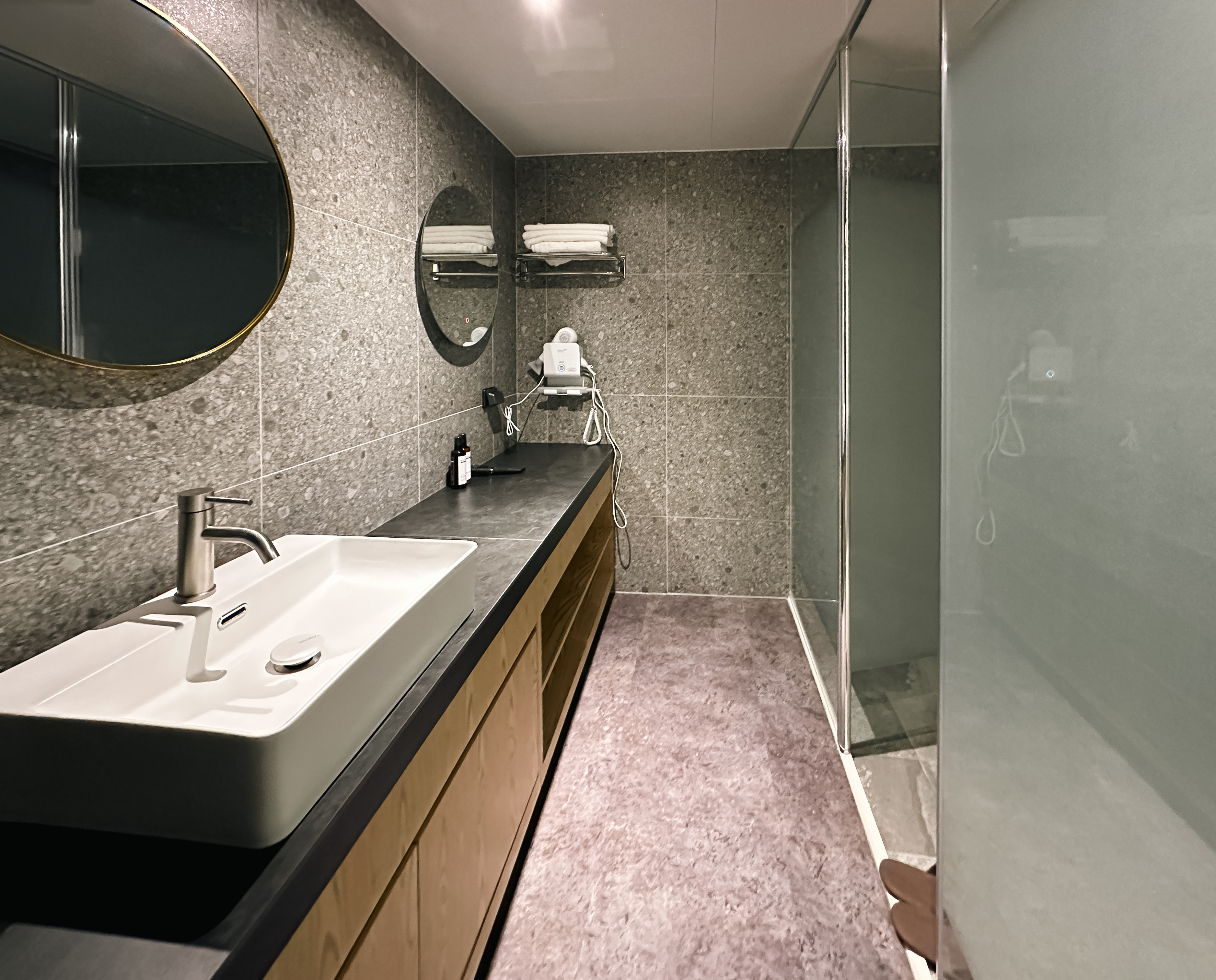 이곳은 화장실과 욕실이 구분되어 있었습니다. 욕실은 세면대와 샤워부스가 분리되어 있었고, 수건도 도톰하고 화장거울이랑 헤어드라이어, 로션, 스킨까지 고급스러운 느낌이었습니다. 물론 샤워부스에 있는 샴푸, 컨디셔너, 바디워시도 별도의 병에 담겨 있었습니다.