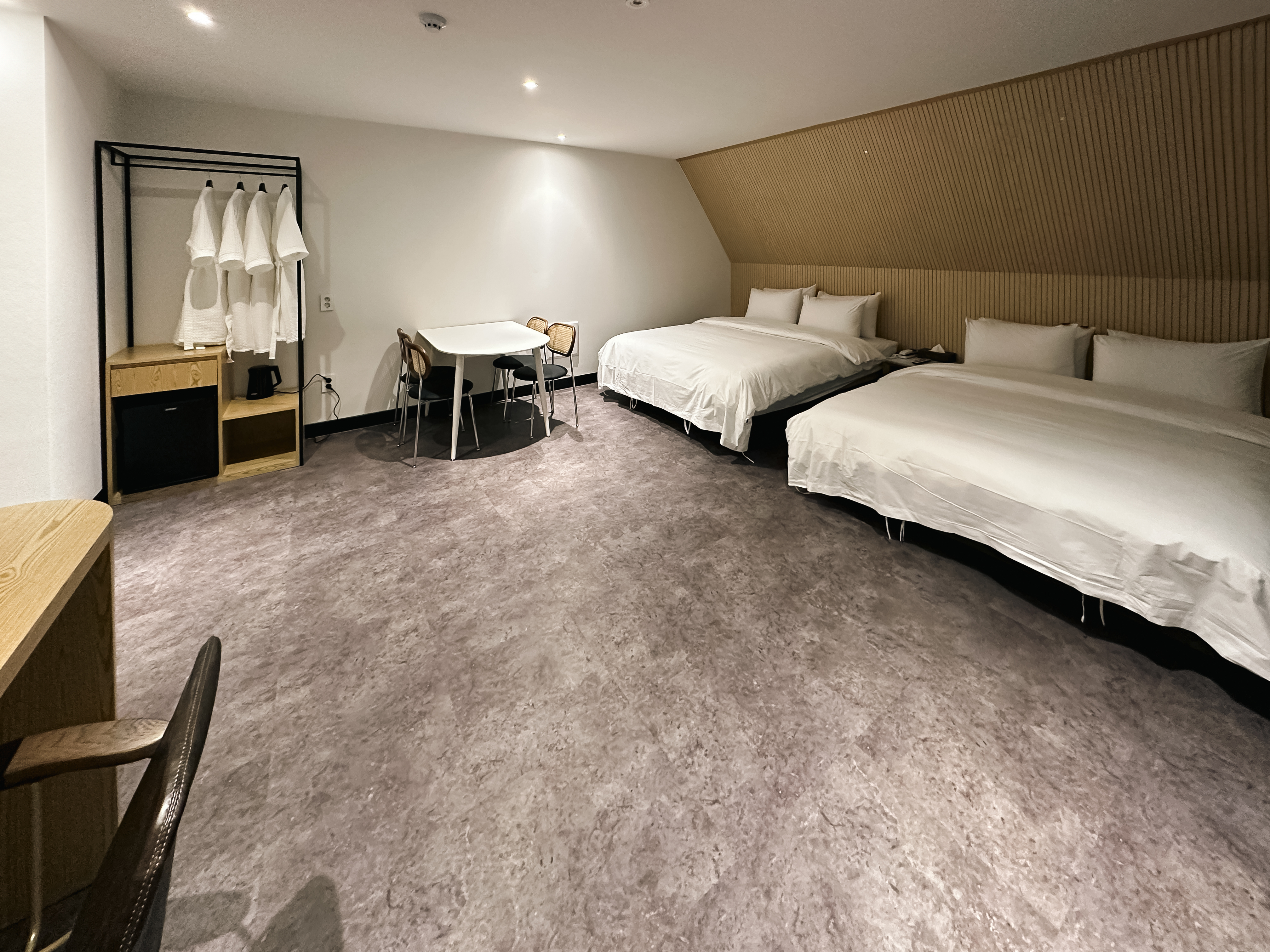 제가 이용한 객실은 프리미엄 트윈실로 방의 크기도 컸지만, 인테리어도 웬만한 호텔에 버금가는 깔끔하고 좋은 실내를 보여주었습니다. 침대도 물론 편하고 침구류도 적당히 묵직한 것이 고급스러운 느낌이었습니다. 다만 베개는 조금 높았는데 그럭저럭 이용할 만했습니다. 객실에는 큼직한 TV도 있었고, 4인용 테이블과 가운이 있었습니다.