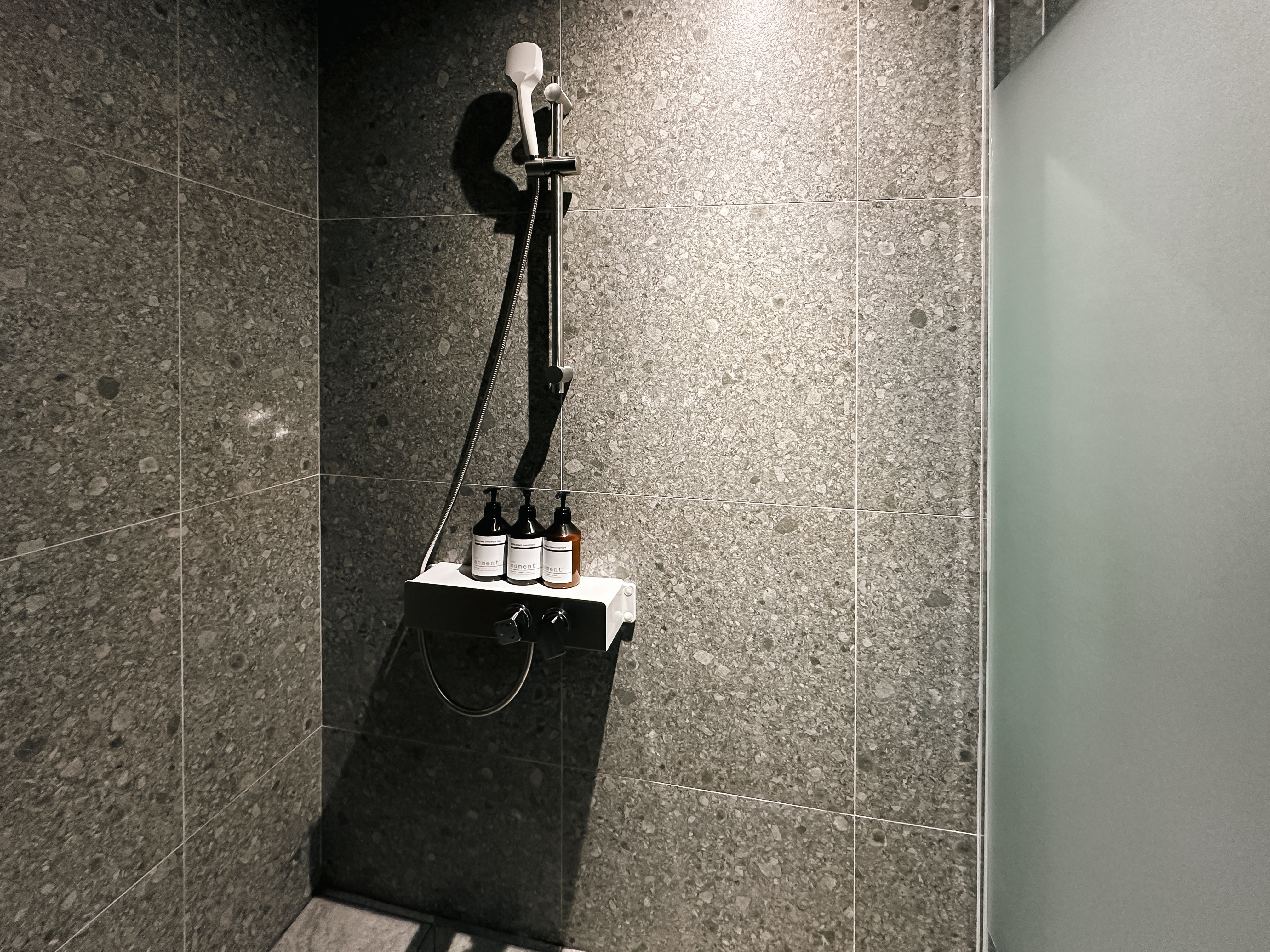 이곳은 화장실과 욕실이 구분되어 있었습니다. 욕실은 세면대와 샤워부스가 분리되어 있었고, 수건도 도톰하고 화장거울이랑 헤어드라이어, 로션, 스킨까지 고급스러운 느낌이었습니다. 물론 샤워부스에 있는 샴푸, 컨디셔너, 바디워시도 별도의 병에 담겨 있었습니다.