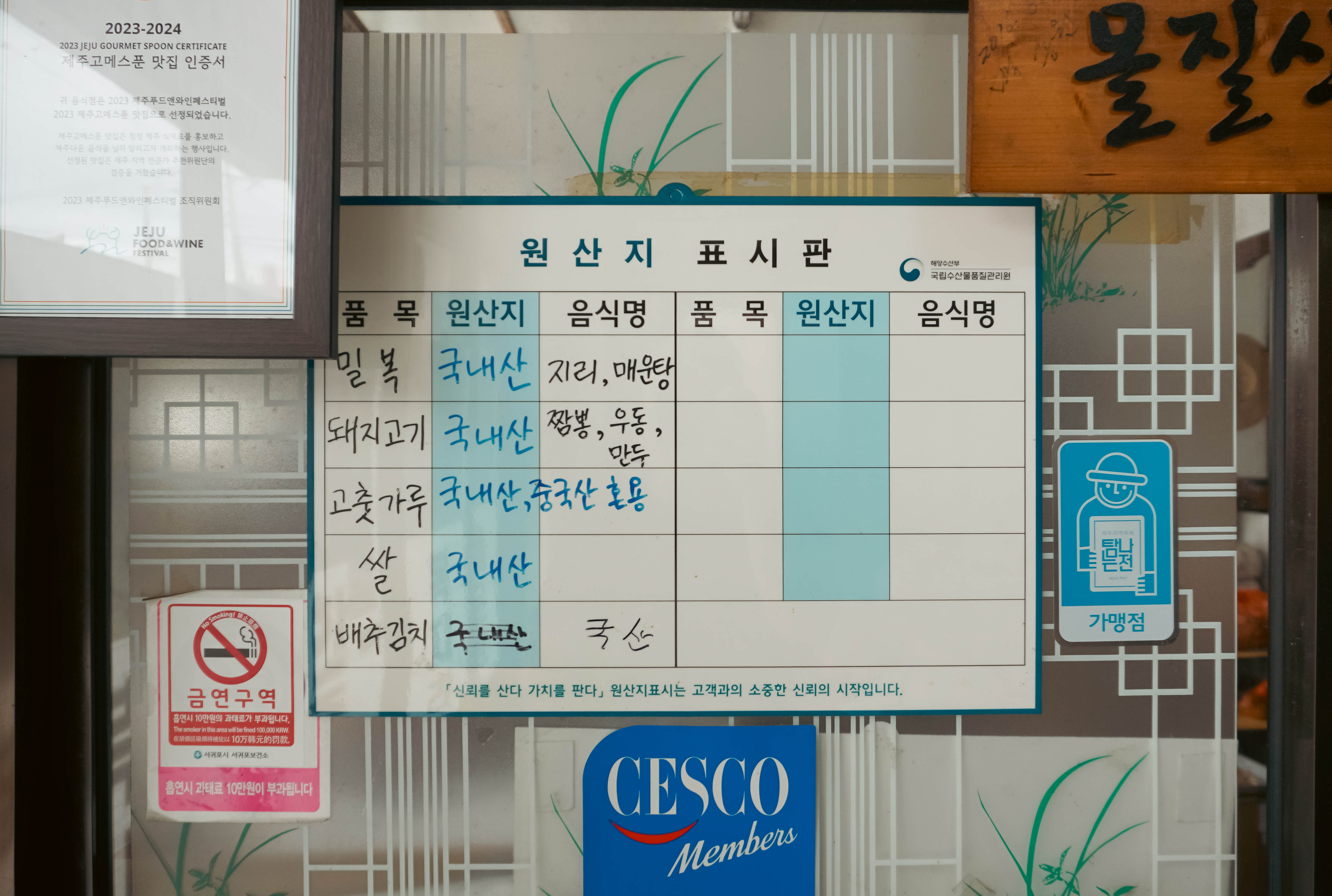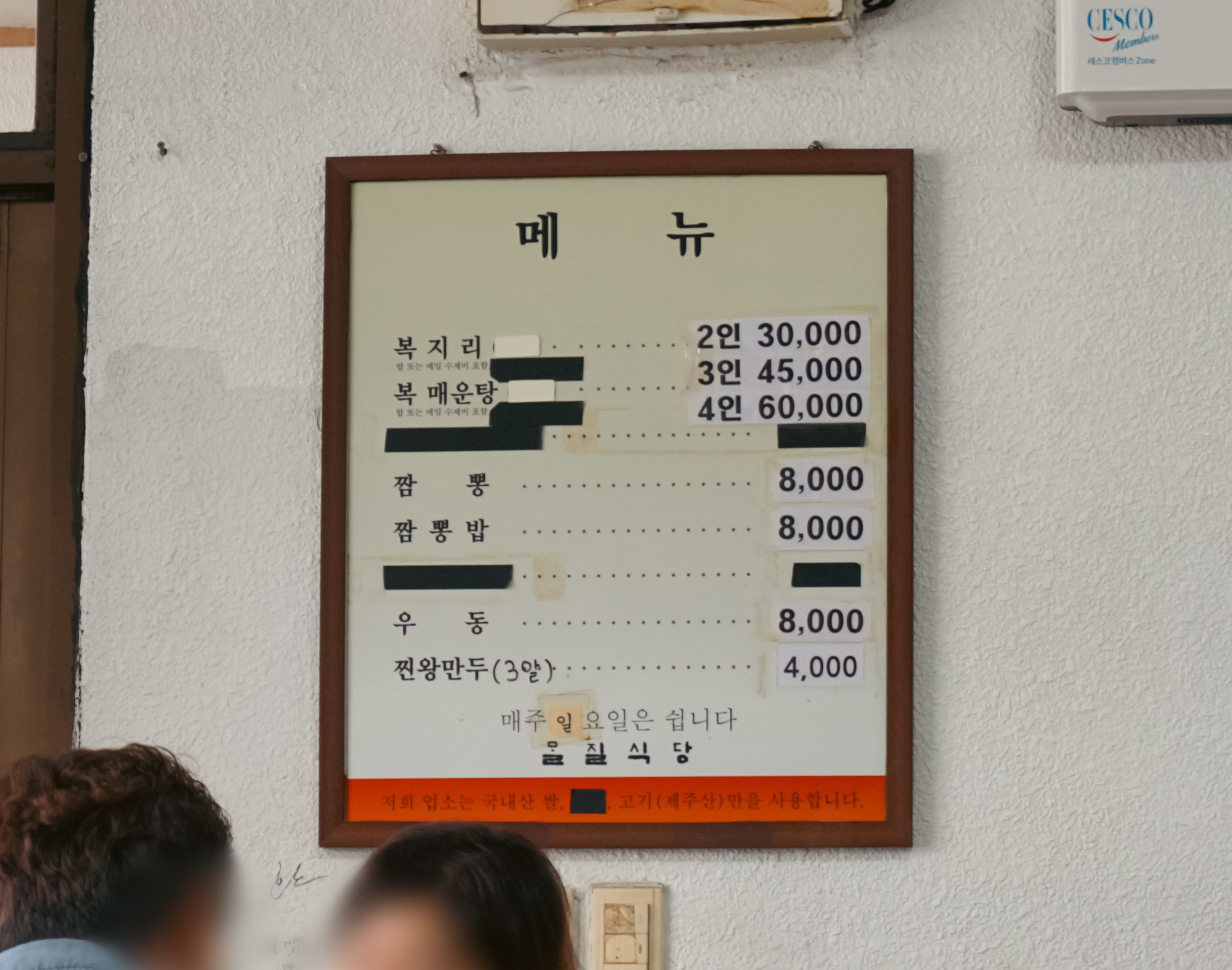 서귀포 몰질식육식당의 메뉴는 복지리, 복매운탕, 짬뽕, 짬뽕밥, 우동, 찐왕만두가 있었습니다. 저희는 짬뽕을 먹으러 방문했기 때문에, 짬뽕을 2그릇 주문했습니다. 참고로 짬뽕의 가격은 1인 8,000원 입니다. 몰질식육식당의 재료 원산지는 고춧가루를 제외하면 대부분 국내산 재료를 사용하고 있었습니다.