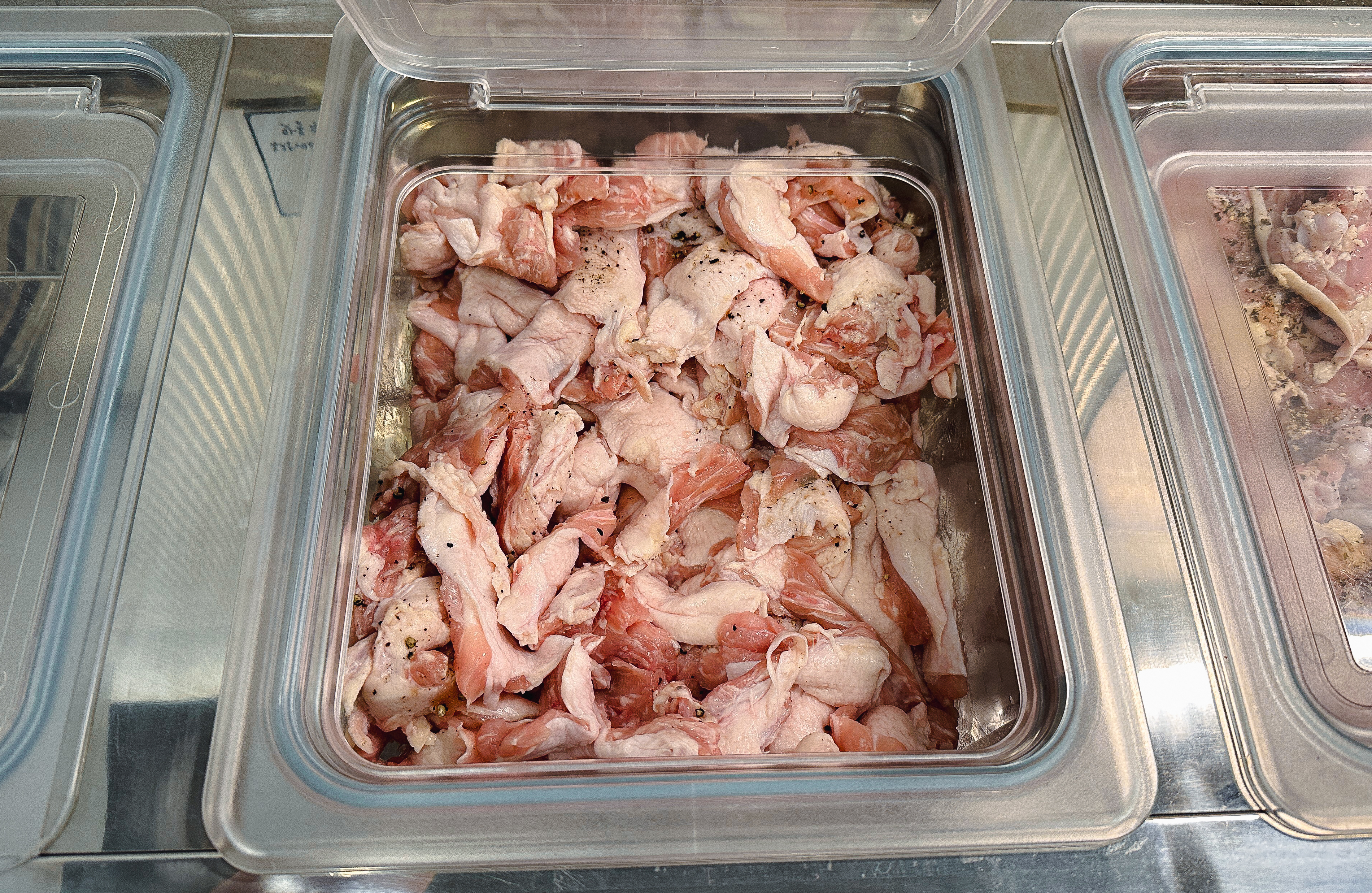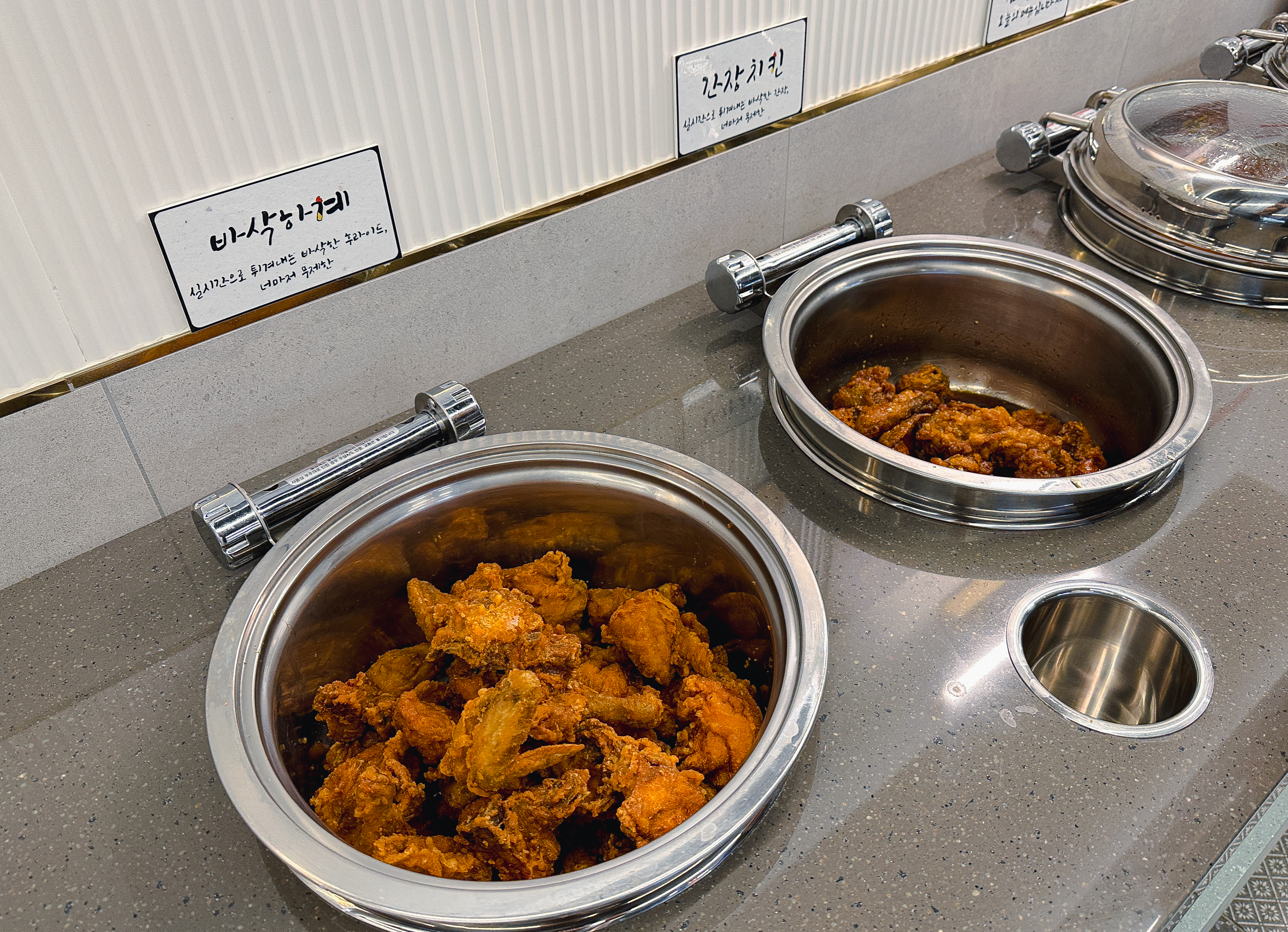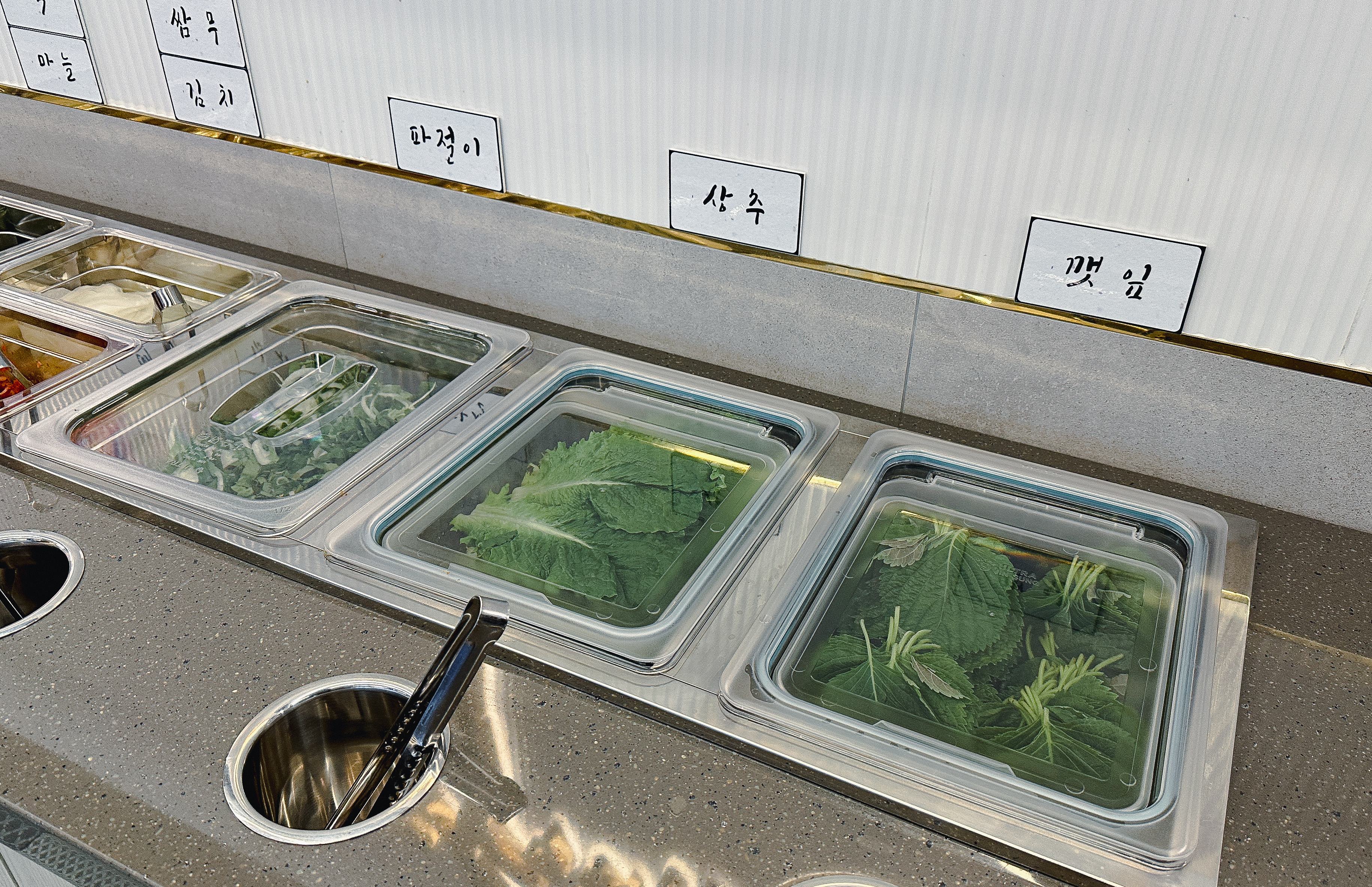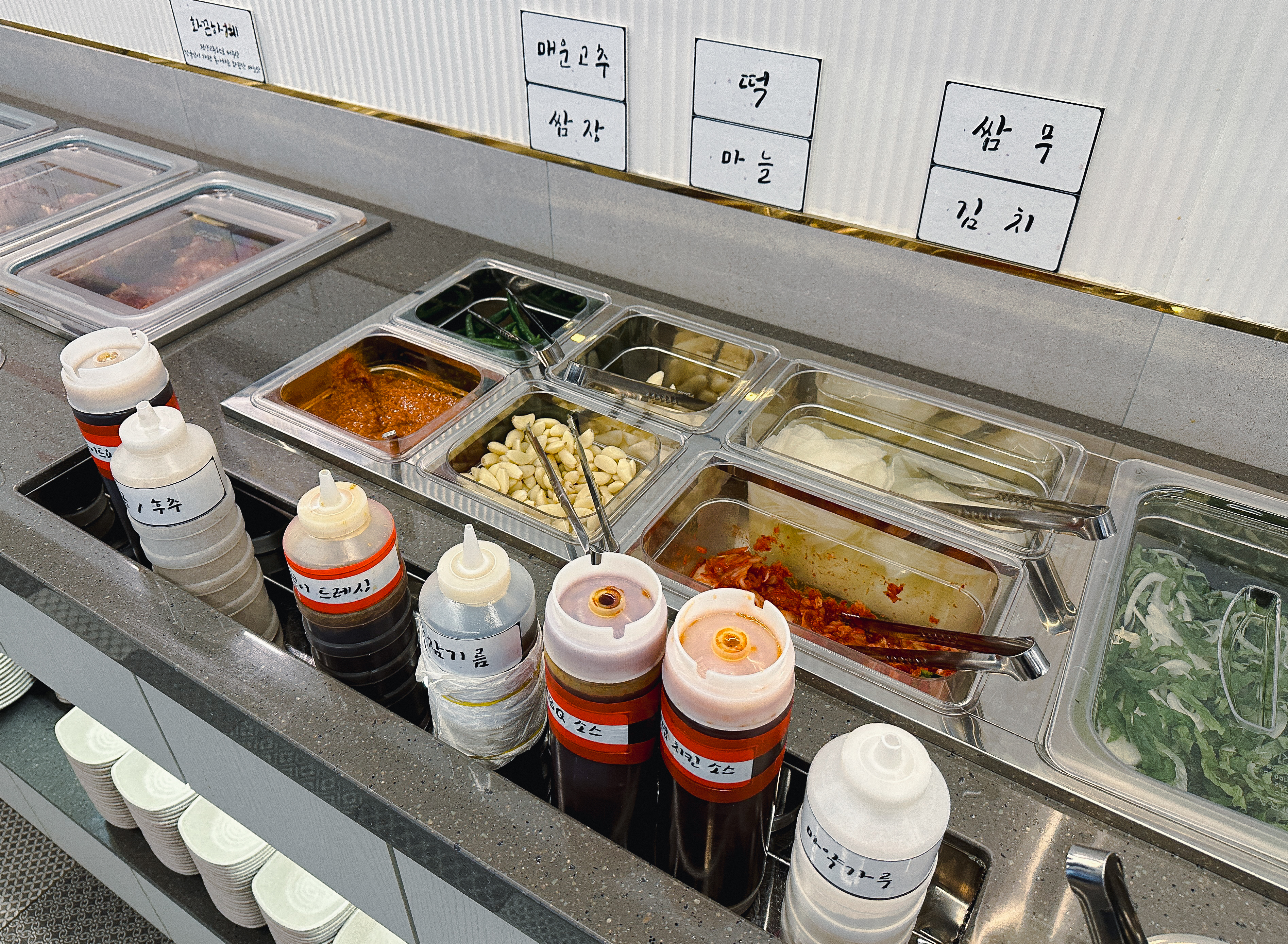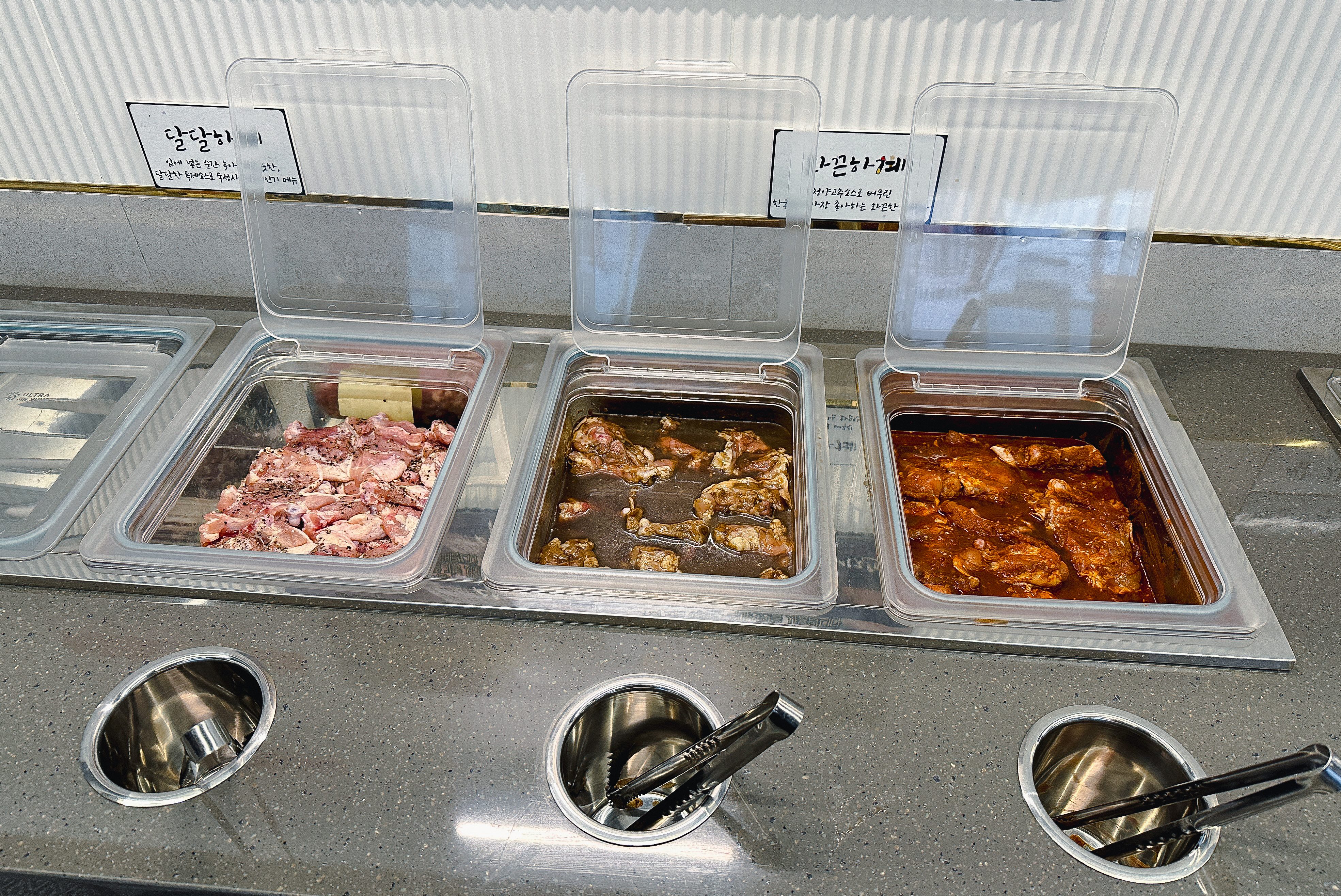 사계진미의 닭갈비는 담백하계, 달달하계, 화끈하계 이렇게 세 가지 종류가 있었고, 최근에는 닭목살도 같이 고를 수 있게 되어있더라고요. 바삭하계, 간장치킨, 쌈빡하계, 닭곰탕 등 사이드 메뉴도 입맛에 맞게 골라 담을 수 있었습니다. 그밖에 쌈채소로 상추, 깻잎, 쌈무, 고추, 마늘과 종류별로 양념장이 있었습니다.