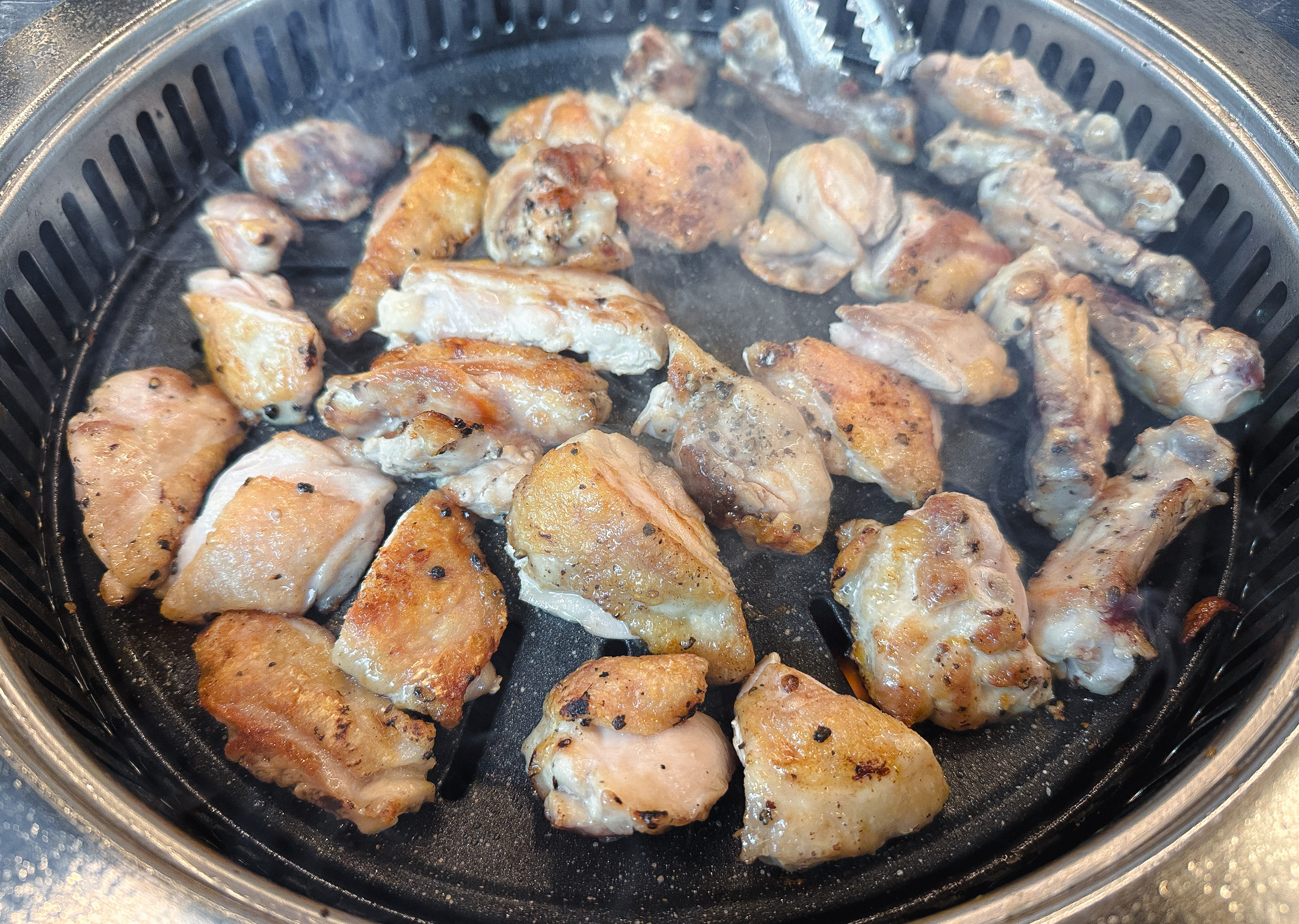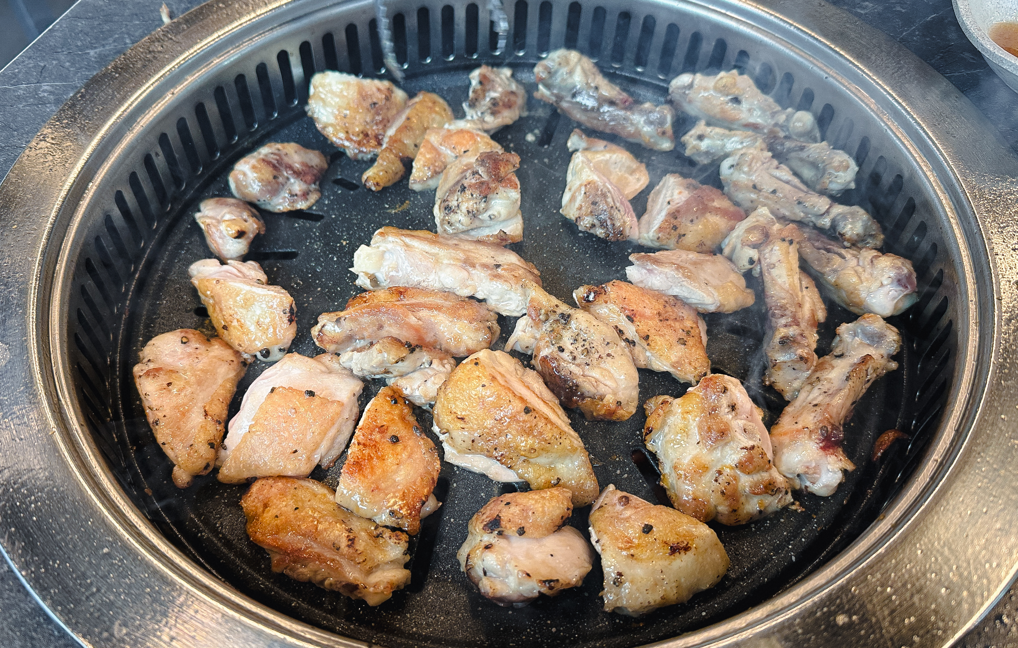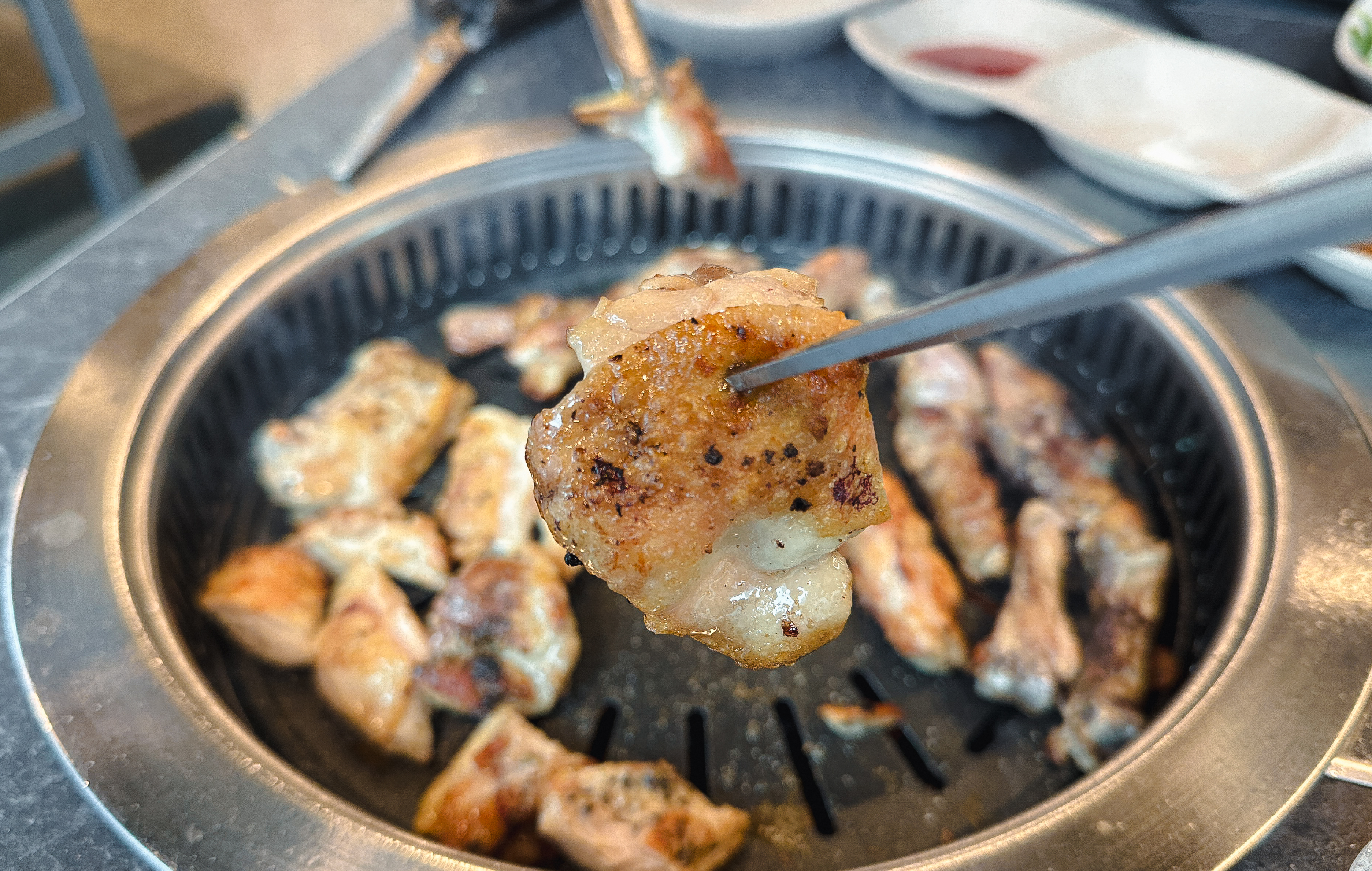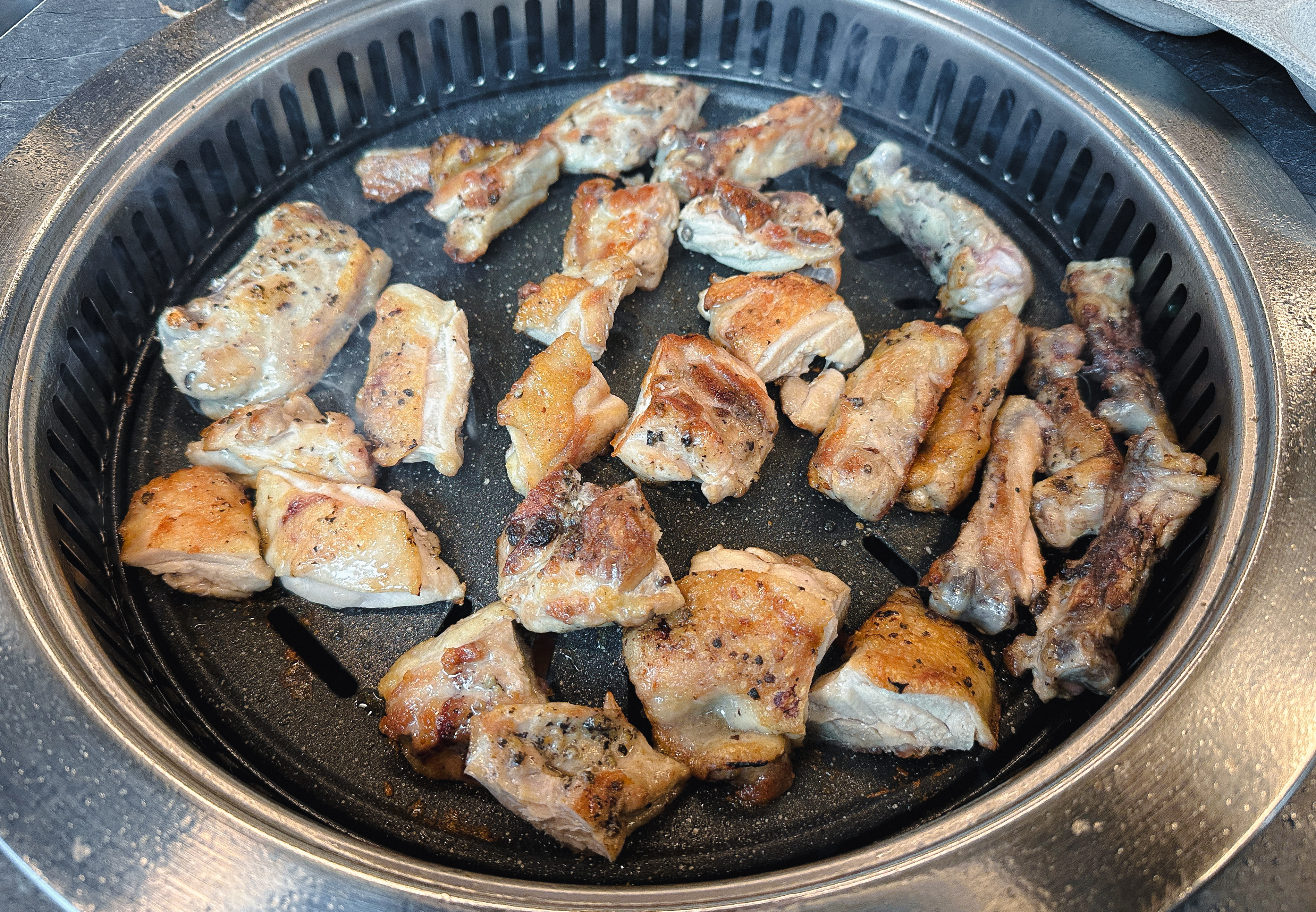 닭갈비를 어느 정도 먹은 다음 닭목살도 같이 구워 먹었습니다. 닭갈비의 닭다리살은 부드러운 식감이 있는데 반해 닭목살은 약간 식감이 있는 꼬들한 느낌의 부위여서 특유의 식감을 즐기시는 분이라면 닭목살도 괜찮은 선택이 될 것 같더라고요. 큰 기대 없이 오랜만에 사계진미라는 숯불 닭갈비 무한리필 가게에 방문했는데, 무난하게 만족스러운 경험을 주었던 것 같습니다.