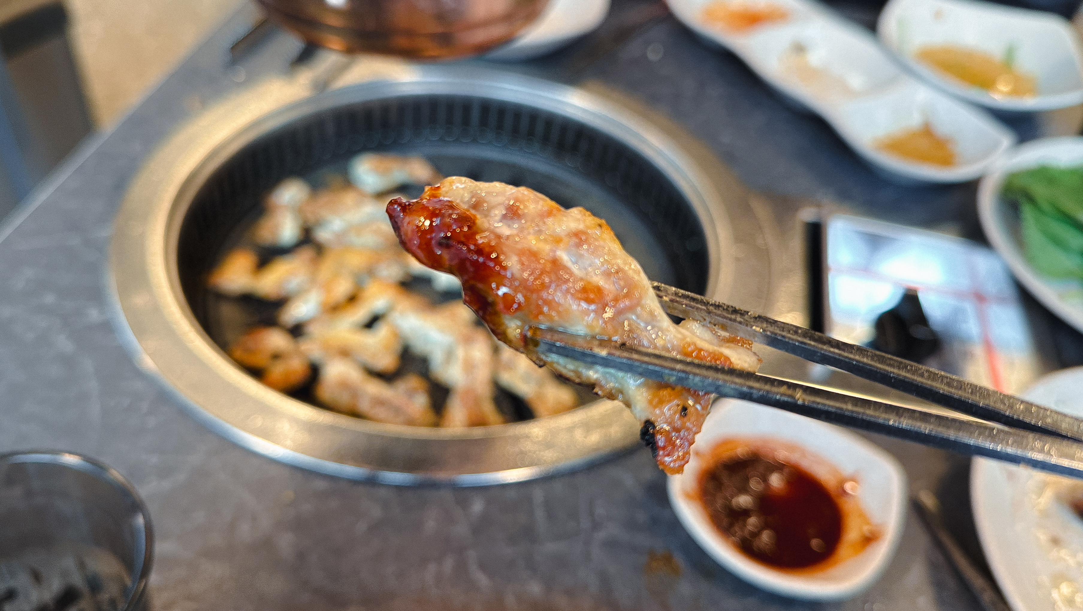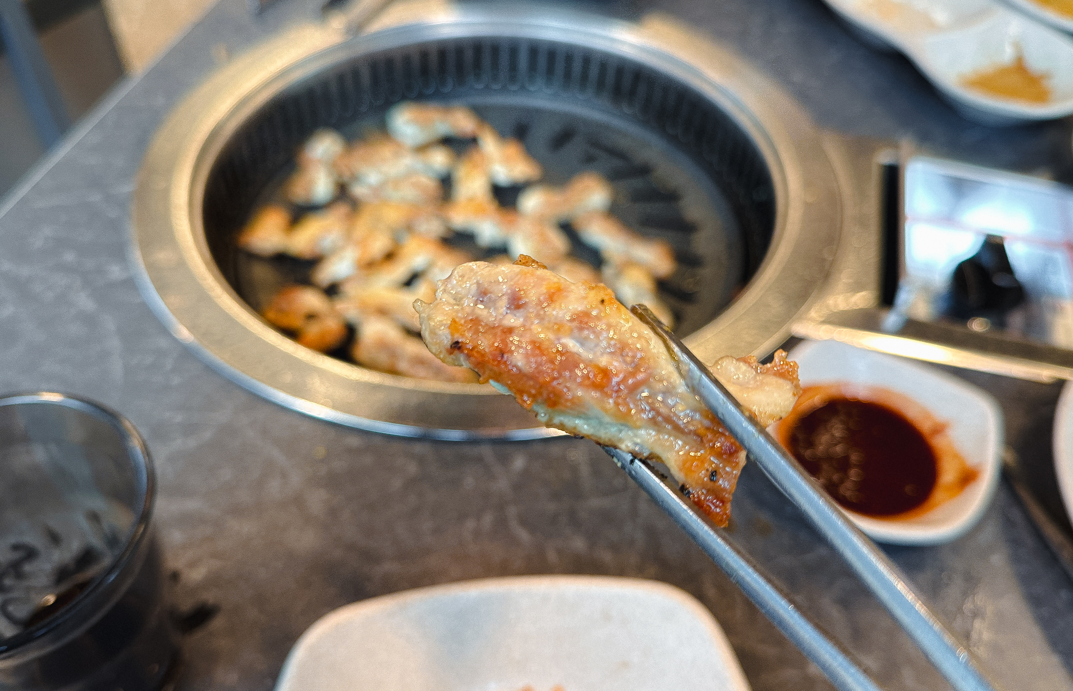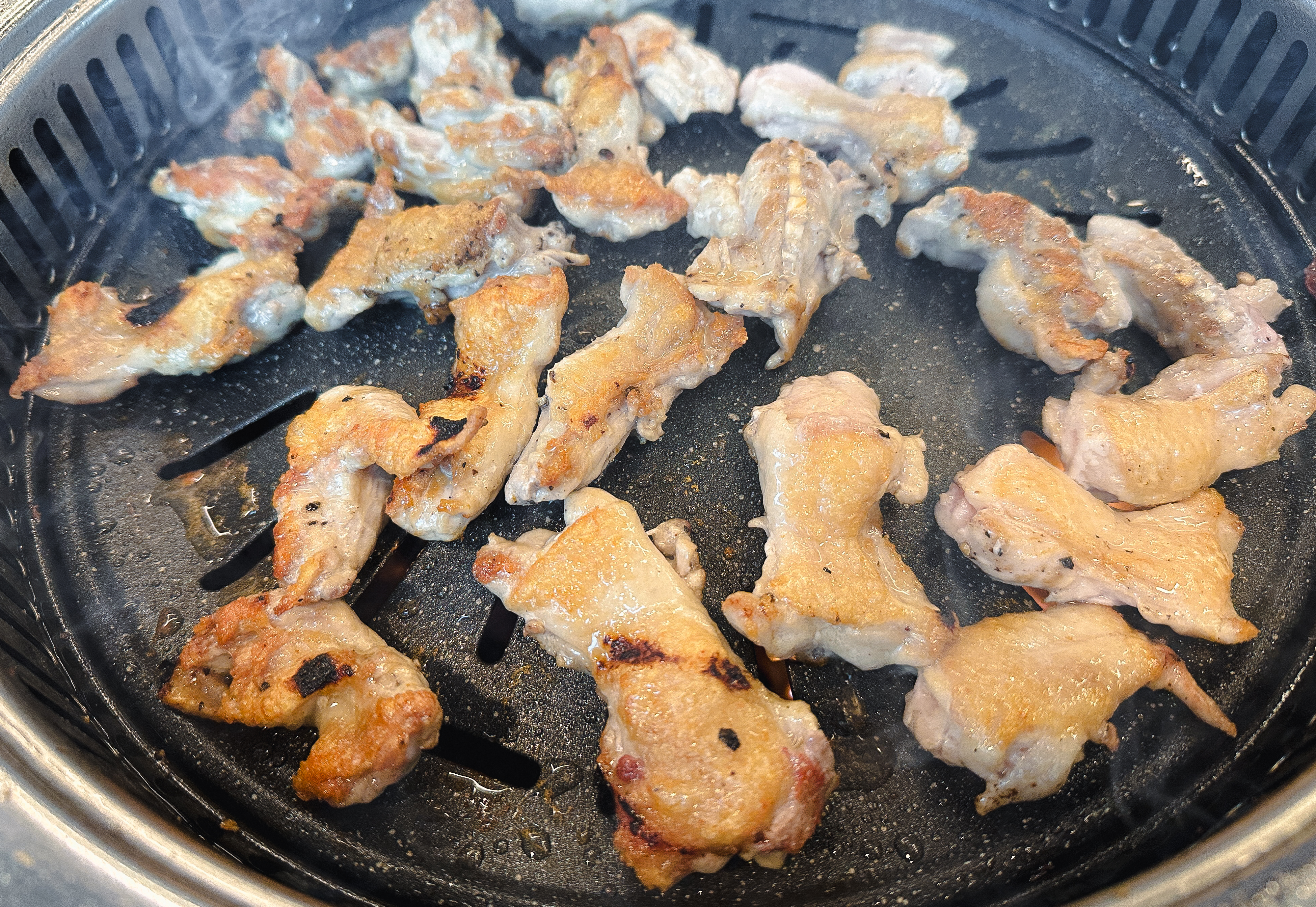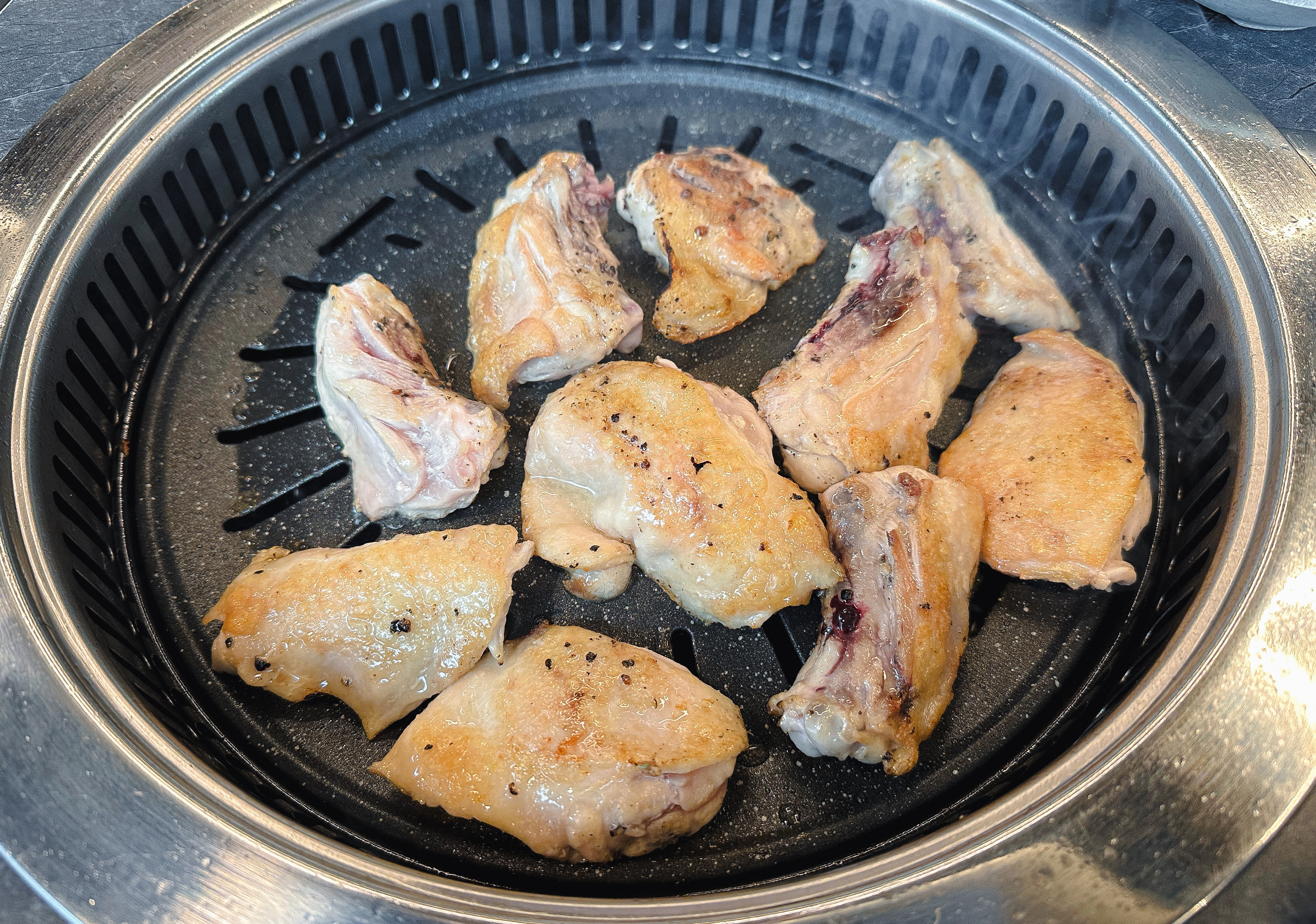 닭갈비를 어느 정도 먹은 다음 닭목살도 같이 구워 먹었습니다. 닭갈비의 닭다리살은 부드러운 식감이 있는데 반해 닭목살은 약간 식감이 있는 꼬들한 느낌의 부위여서 특유의 식감을 즐기시는 분이라면 닭목살도 괜찮은 선택이 될 것 같더라고요. 큰 기대 없이 오랜만에 사계진미라는 숯불 닭갈비 무한리필 가게에 방문했는데, 무난하게 만족스러운 경험을 주었던 것 같습니다.