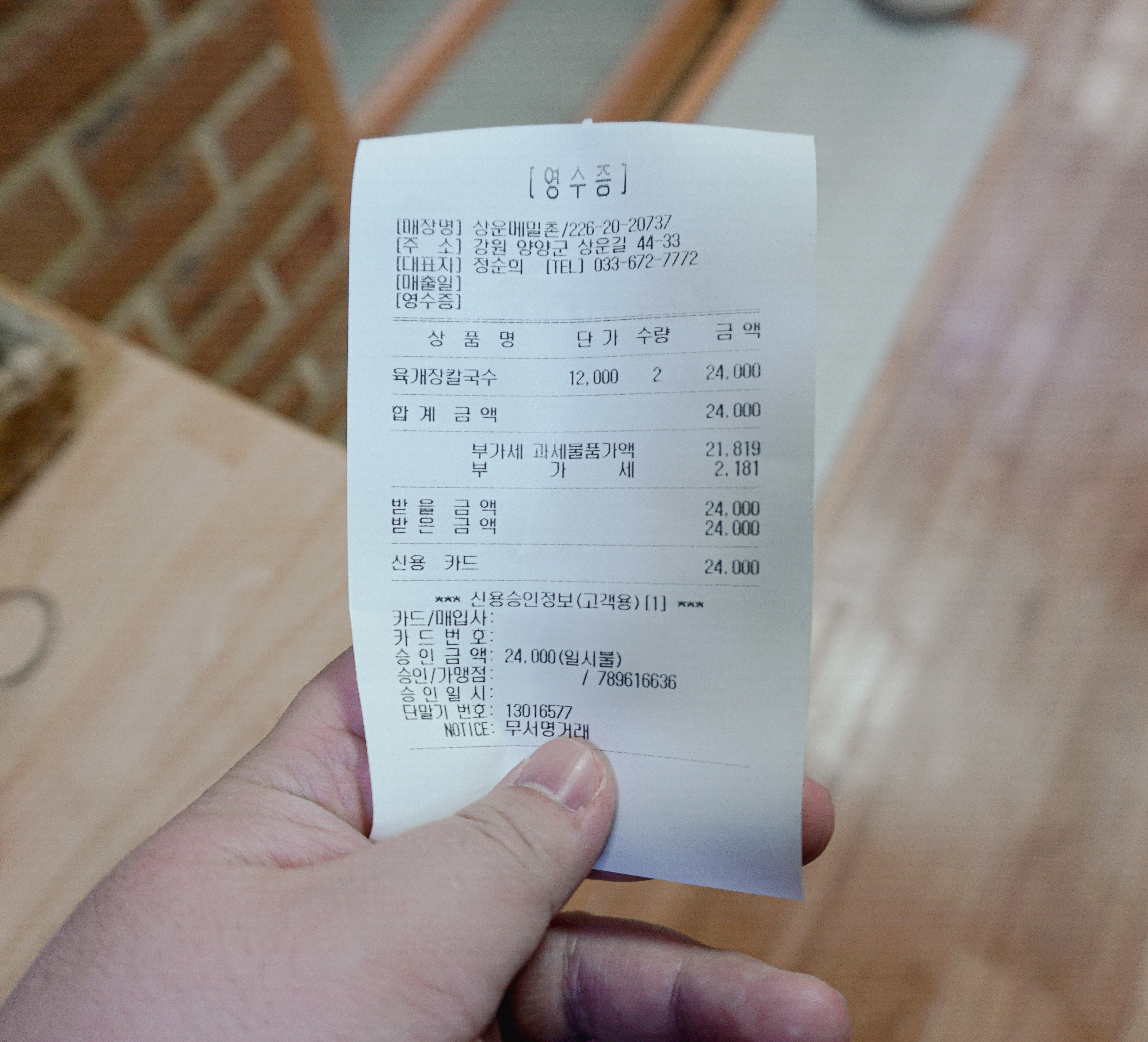 상운메밀촌의 메밀육개장칼국수는 진한 국물의 육개장 칼국수였습니다. 사실 육개장칼국수는 이곳에서 처음 접해보았는데, 생각보다 맛있게 잘 먹었습니다. 가격은 2인 24,000원이 나왔고, 사장님도 음식장사를 하시면서 자부심이 꽤 있으시더라고요. 관심 있는 분들은 한 번 이용해 보셔도 괜찮을 것 같습니다.