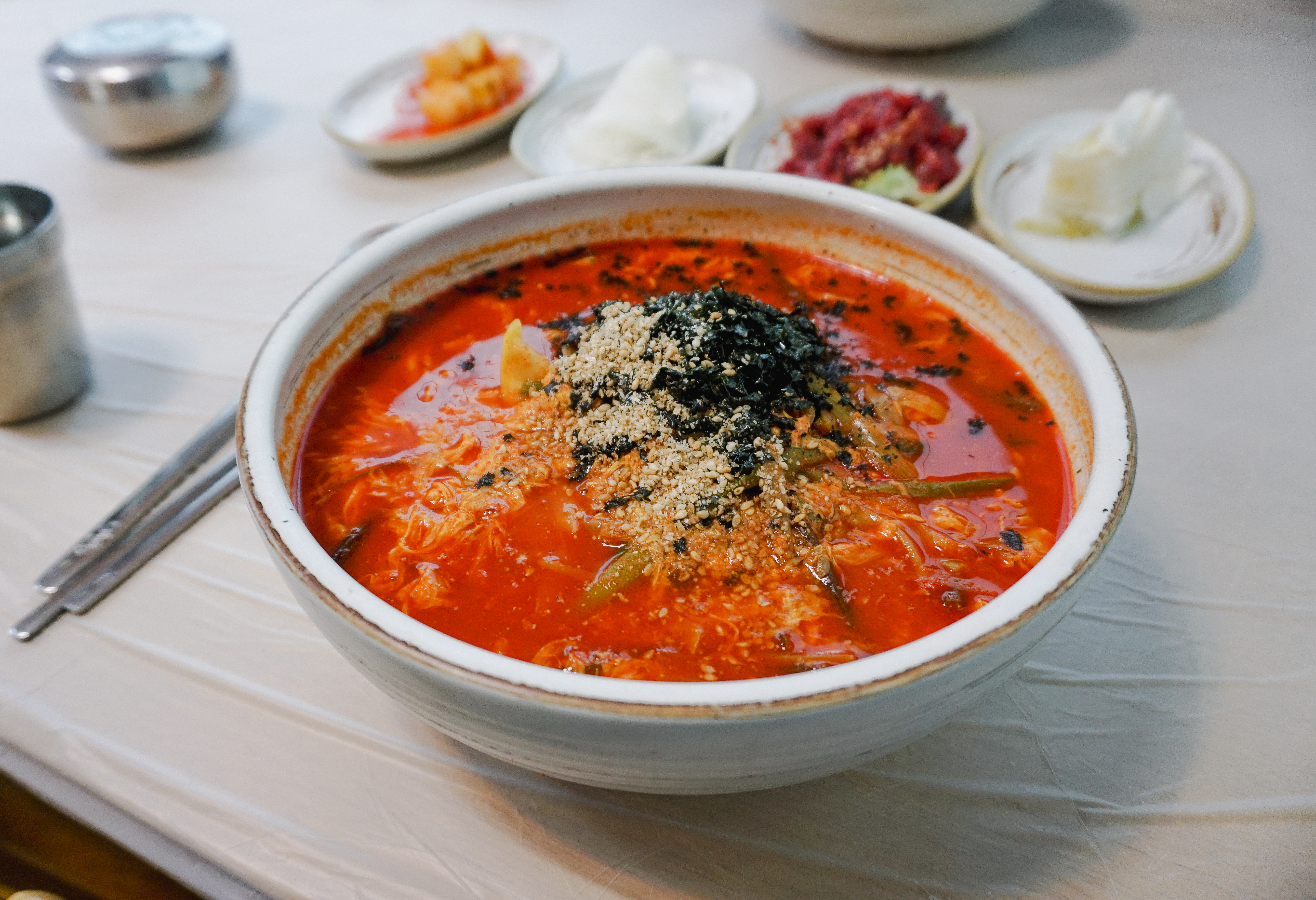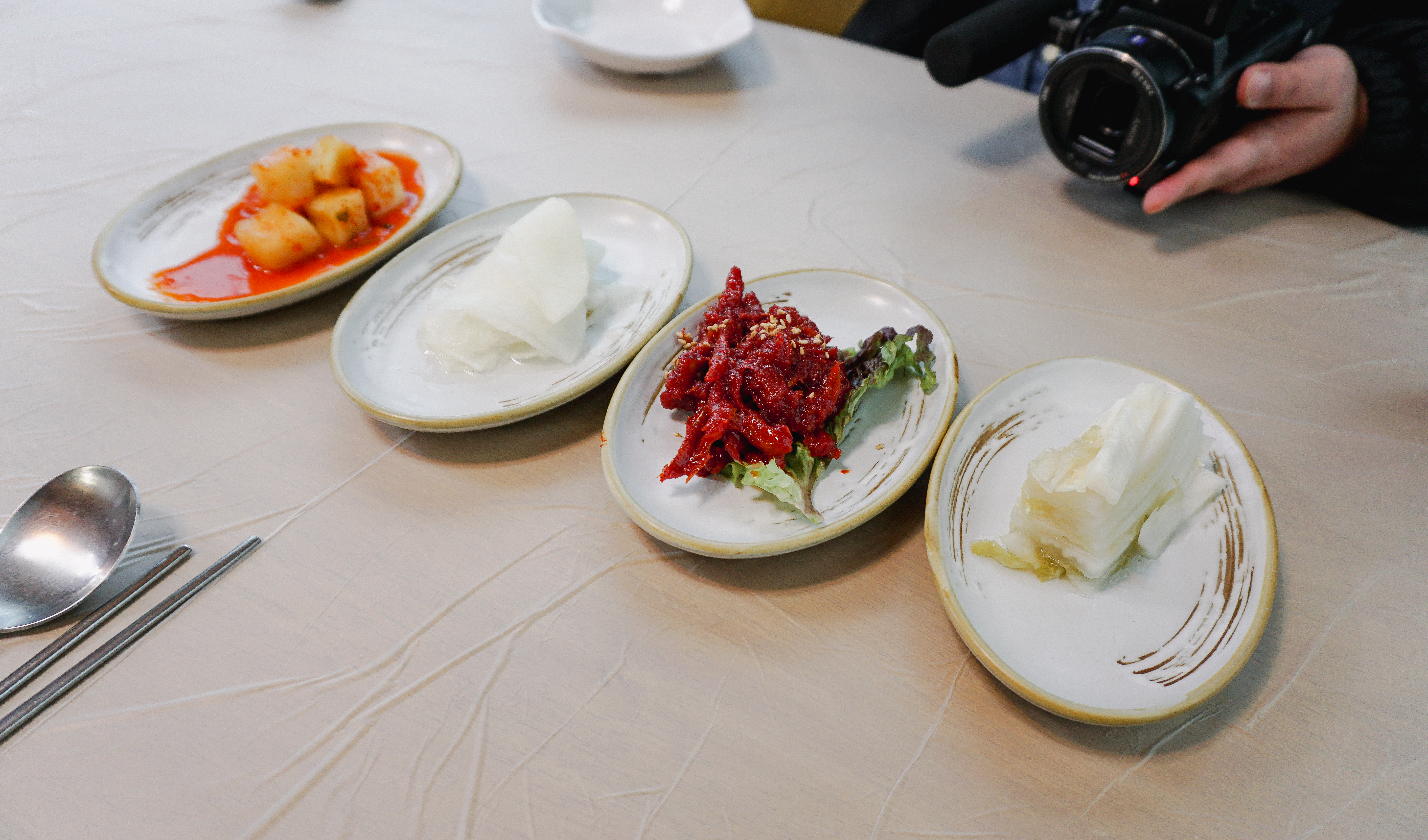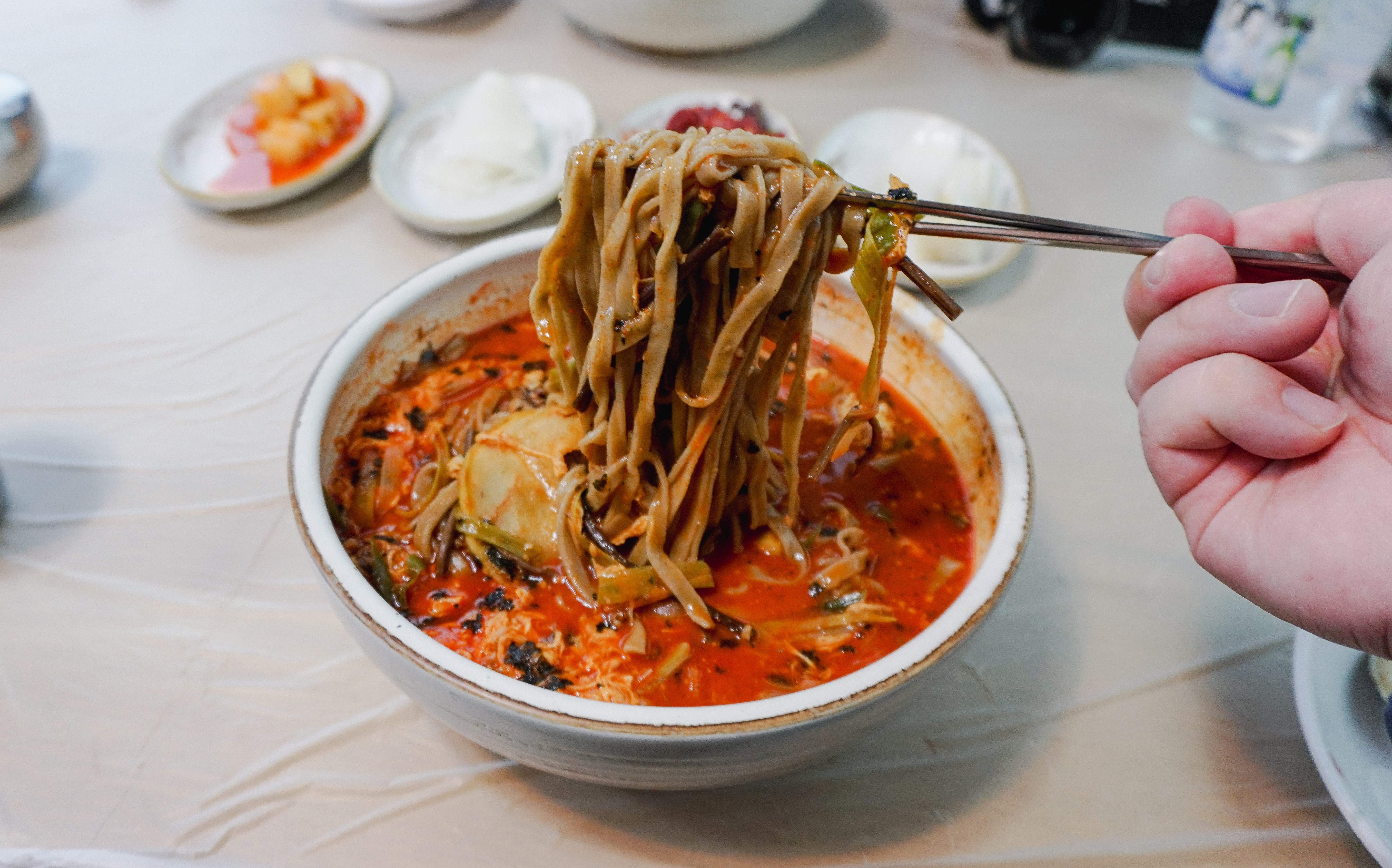 원조메밀육개장칼국수는 위와 같이 반찬 4종류와 함께 제공되었습니다. 반찬들이 전체적으로 정갈하고 맛있었는데, 특히 명태식해가 쫀득하고 맛있었습니다. 계속 손이 가는 반찬이었죠.