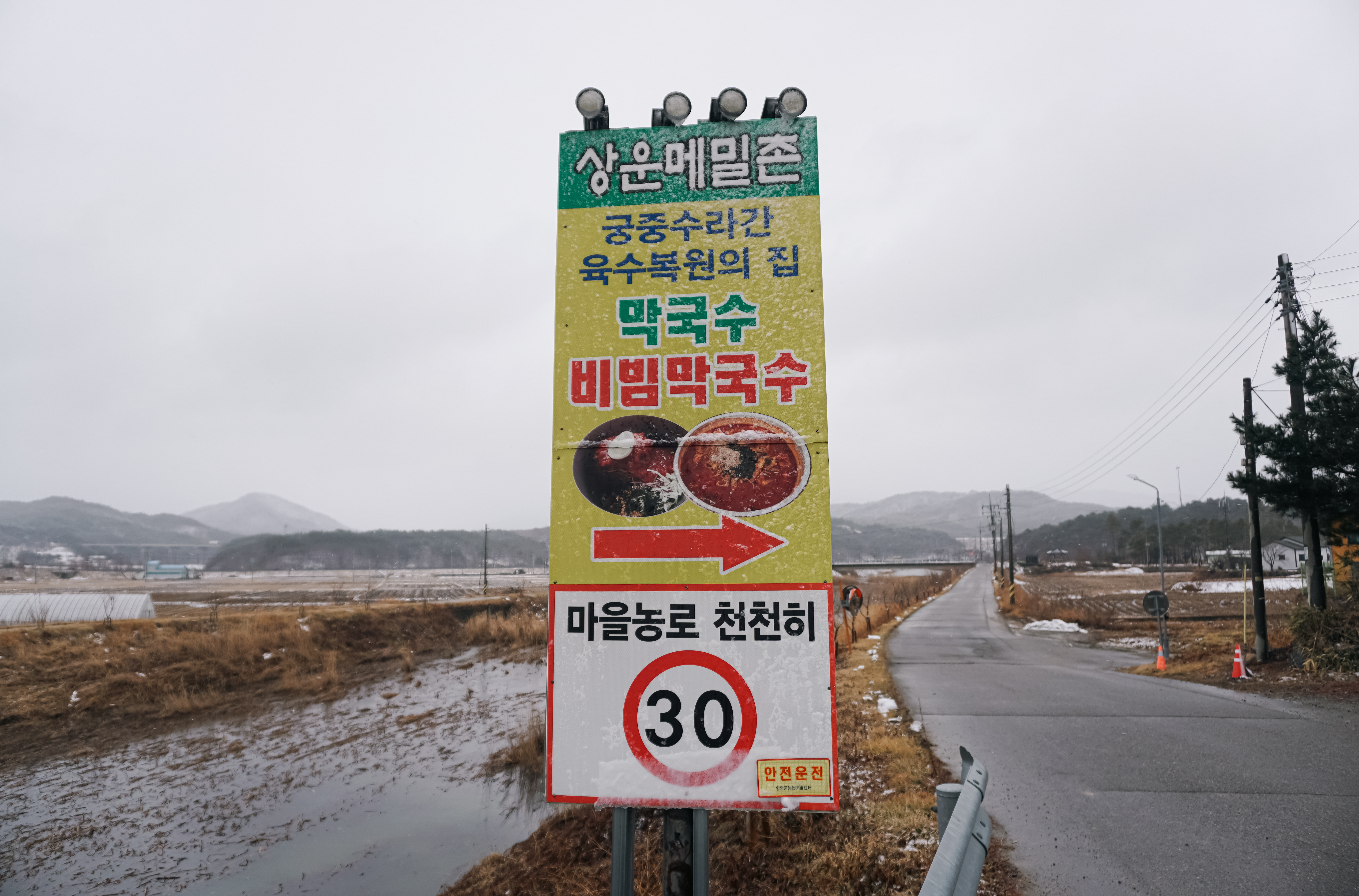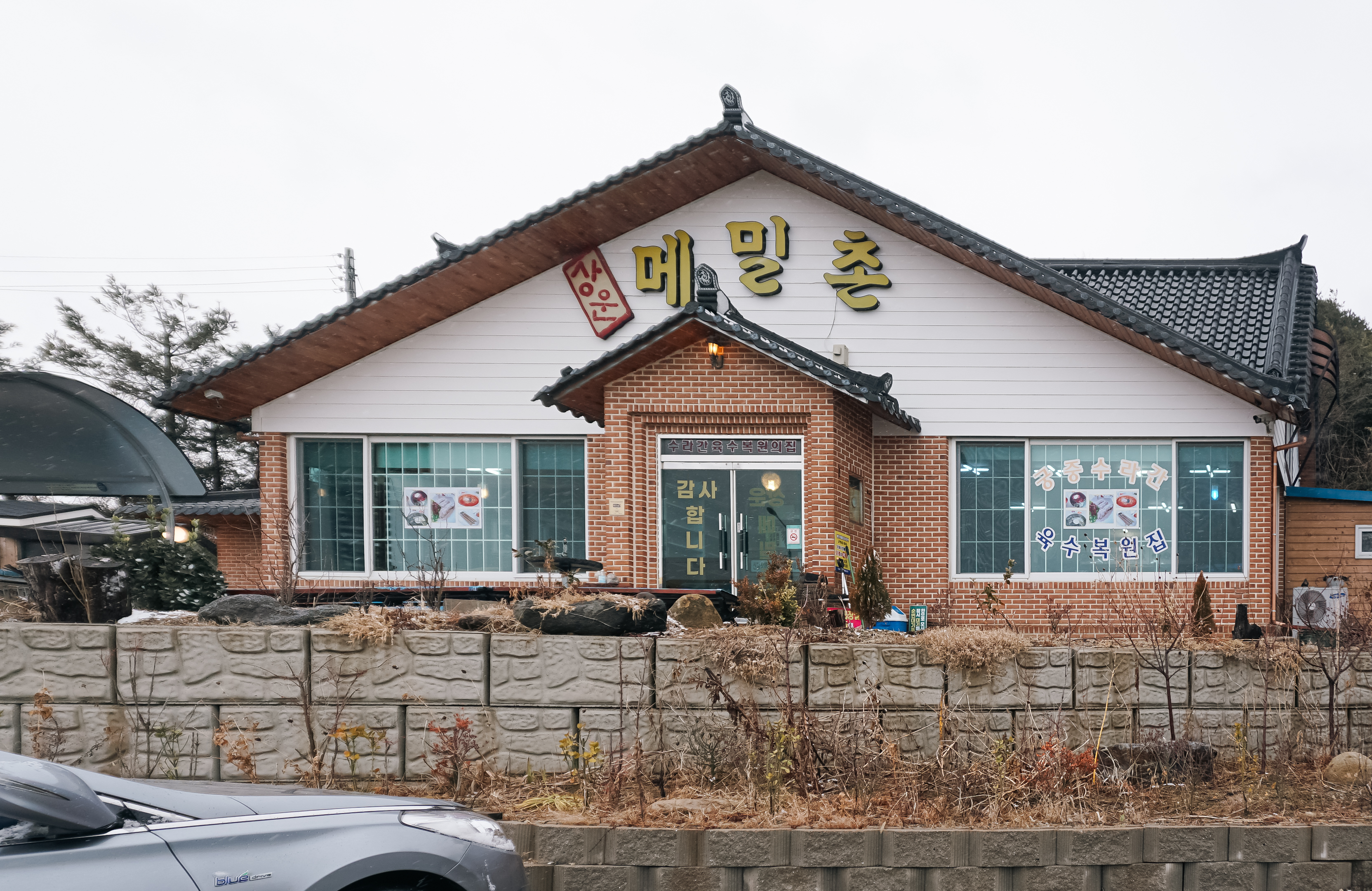 양양 상운메밀촌은 1% 리뷰(링크) 채널을 운영하고 있는 유튜버 형이랑 방문한 가게로, 이곳에서 파는 진한 국물의 메밀 육개장칼국수를 먹기 위해 방문하게 되었습니다. 마침 제가 방문한 날은 비와 눈 동시에 내리다 보니 쌀쌀한 날씨에 몸을 녹이기 위해 따뜻한 국물이 있는 메뉴를 먹었죠.