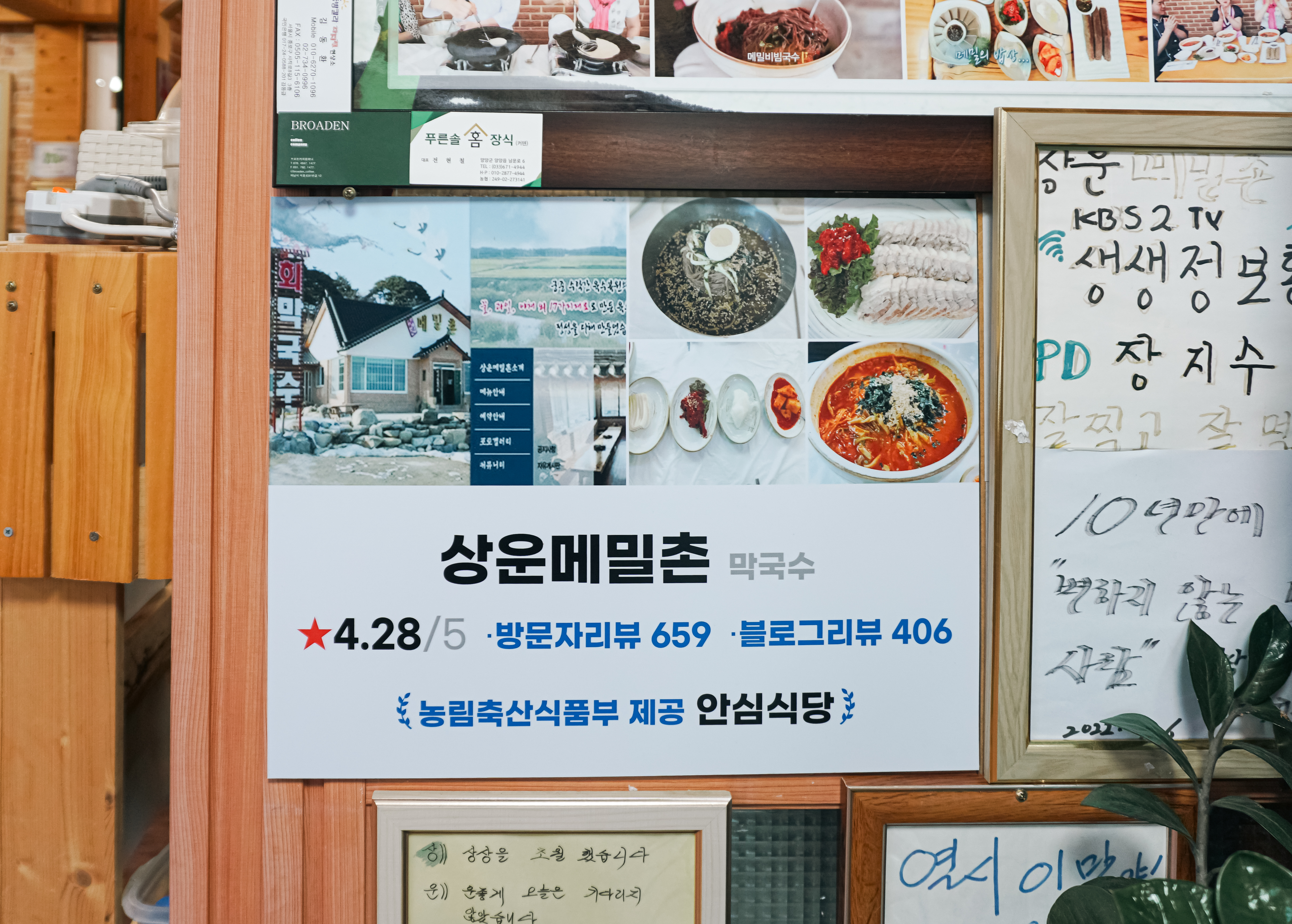 상운메밀촌은 강원특별자치도 양양군 손양면 상운리 382-2 에 위치한 가게로, 이곳은 '궁중수라간 육수복원의 집'이라고 하더라고요. 영업시간은 10:00~20:00 까지이며, 화요일은 휴무라고 합니다. 이곳은 방송에도 소개된 적이 있는 가게로, 블로그에도 여러 차례 알려진 가게인 것 같았습니다.