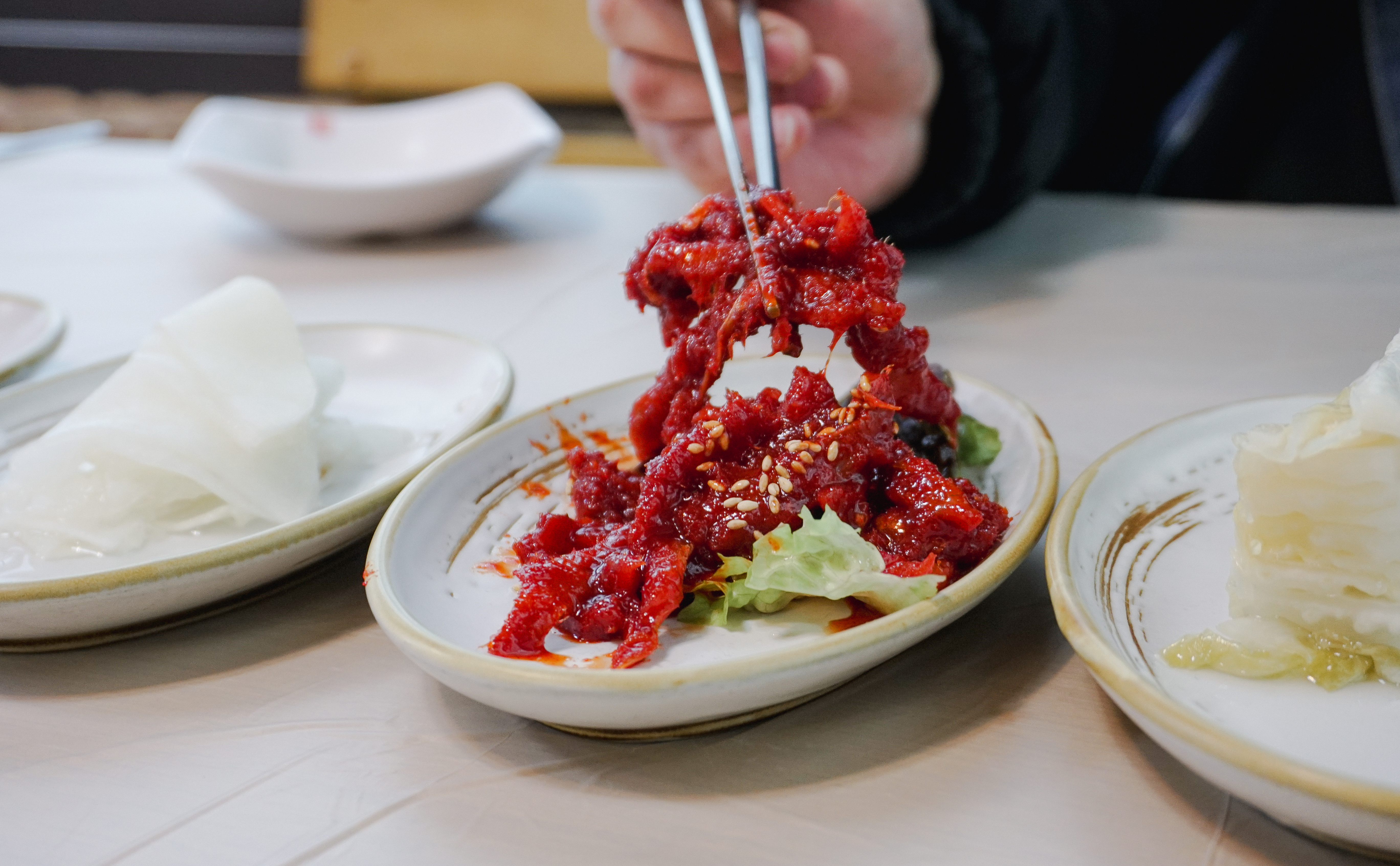 원조메밀육개장칼국수는 위와 같이 반찬 4종류와 함께 제공되었습니다. 반찬들이 전체적으로 정갈하고 맛있었는데, 특히 명태식해가 쫀득하고 맛있었습니다. 계속 손이 가는 반찬이었죠.