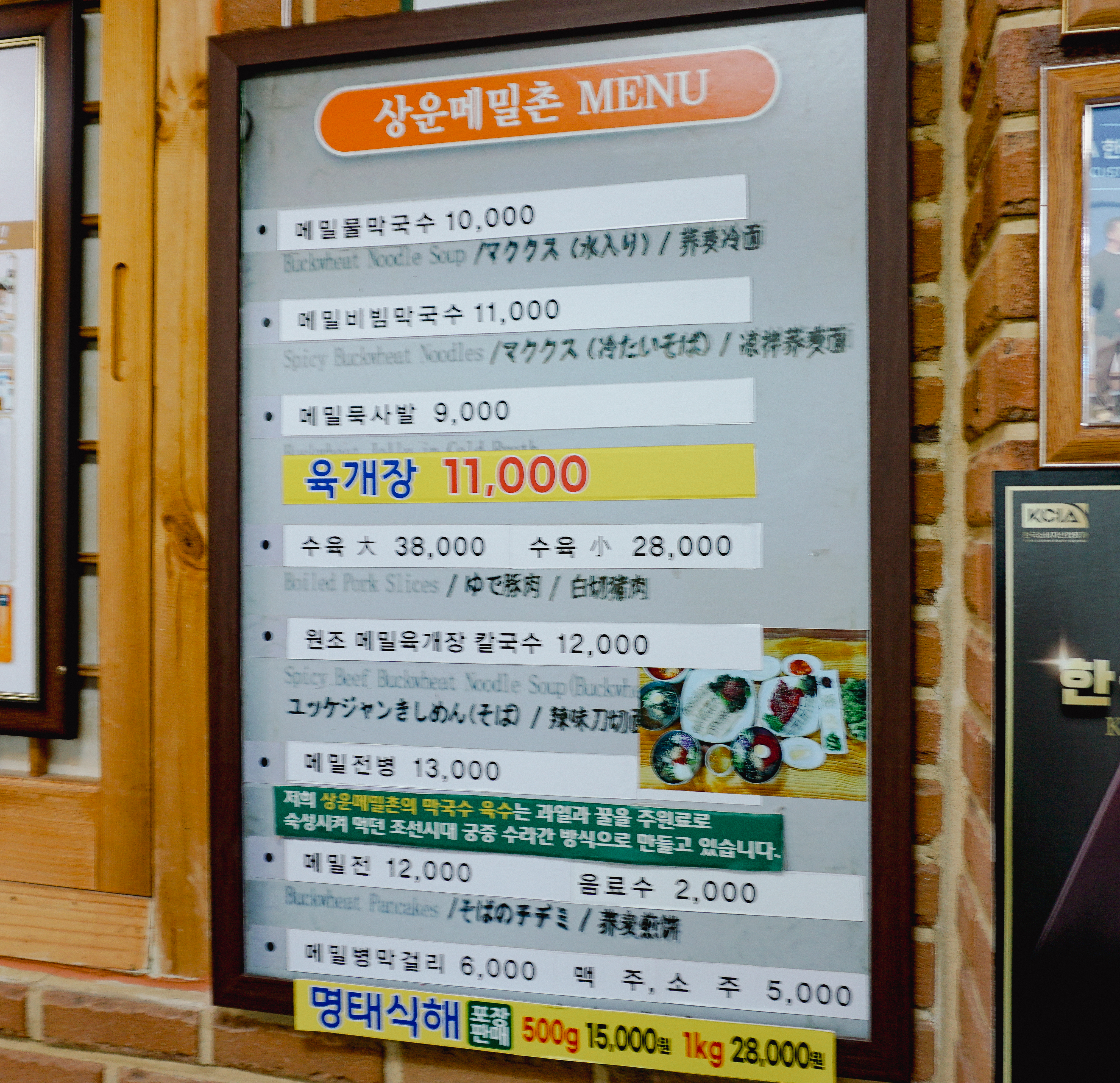 양양 상운메밀촌의 메뉴는 메밀물막국수, 메밀비빔막국수, 메밀묵사발, 육개장, 수육, 원조메밀육개장칼국수, 메밀전병, 명태식해 등이 있었습니다. 저희는 따뜻한 국물의 원조메밀육개장칼국수를 주문했습니다.