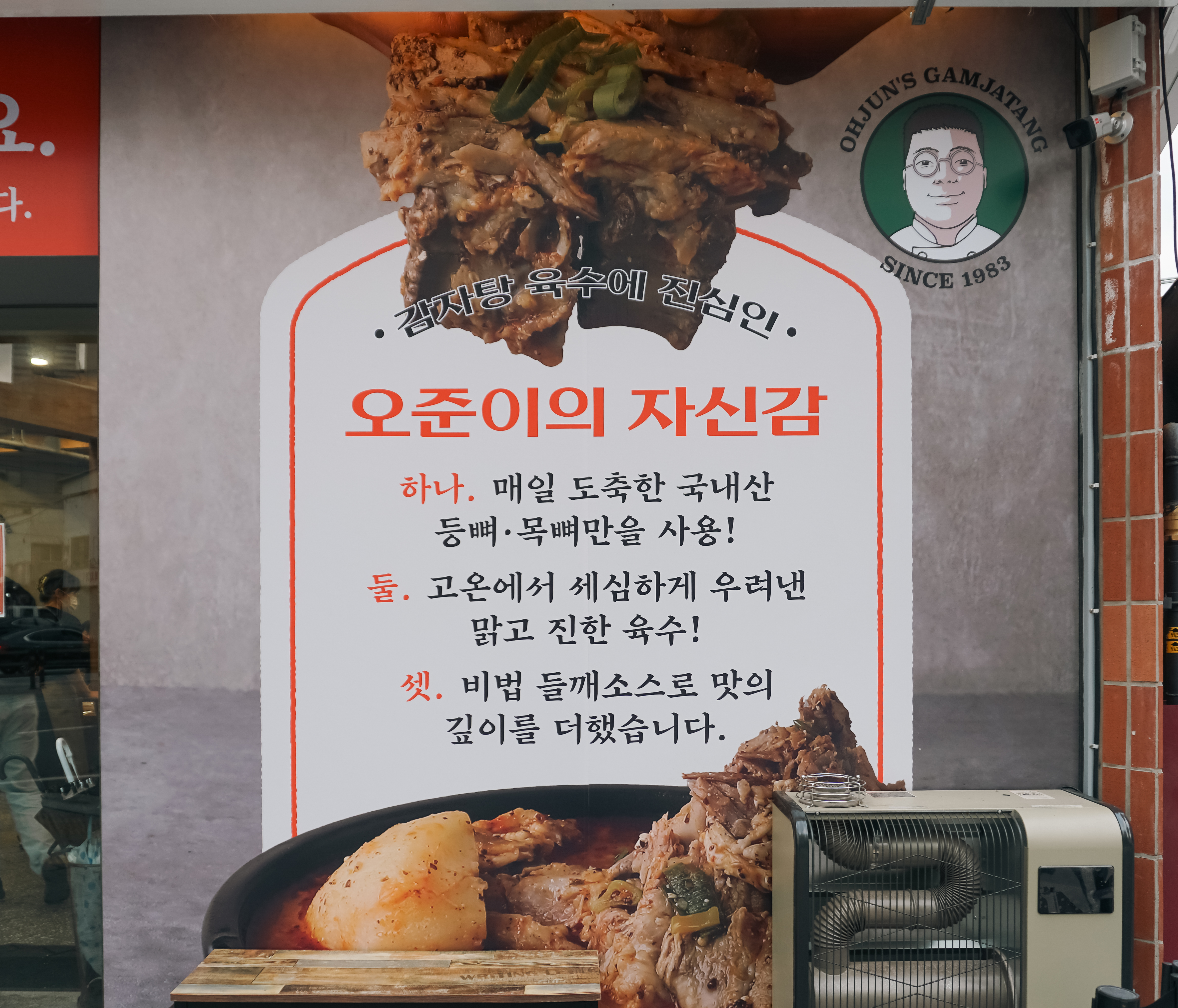 오준이네감자탕 신용산점은 서울 용산구 한강로2가 140, 1~ 2층에 위치한 가게였습니다. 이곳은 감자탕 육수에 진심이라고 하면서, ➊ 매일 도축한 등뼈・목뼈를 사용하고, ➋ 고온에서 세심하고 우려낸 맑고 진한 육수, ➌ 비법 들깨소스로 맛의 깊이를 더했다고 합니다.