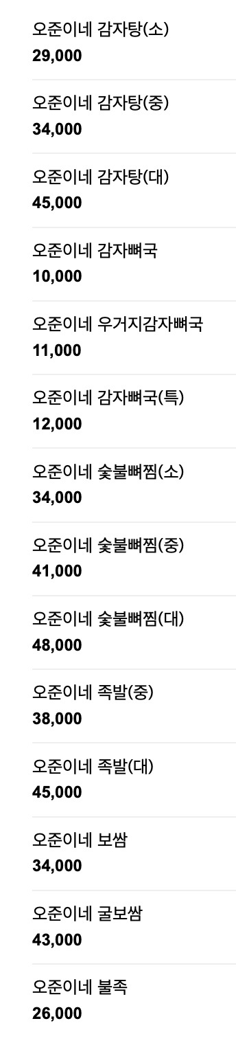 오준이네감자탕의 메뉴는 우거지감자뼈국, 감자뼈국, 숯불뼈찜, 족발, 보쌈, 굴보쌈, 불족이 있었습니다. 요즘은 메뉴판을 대체하는 태블릿을 두고 있어서, 메뉴판 이미지를 찍기 힘들더라고요. 저는 개인적으로 리뷰하는 입장에서 태블릿으로의 교체는 썩 마음에 들지 않더라고요.