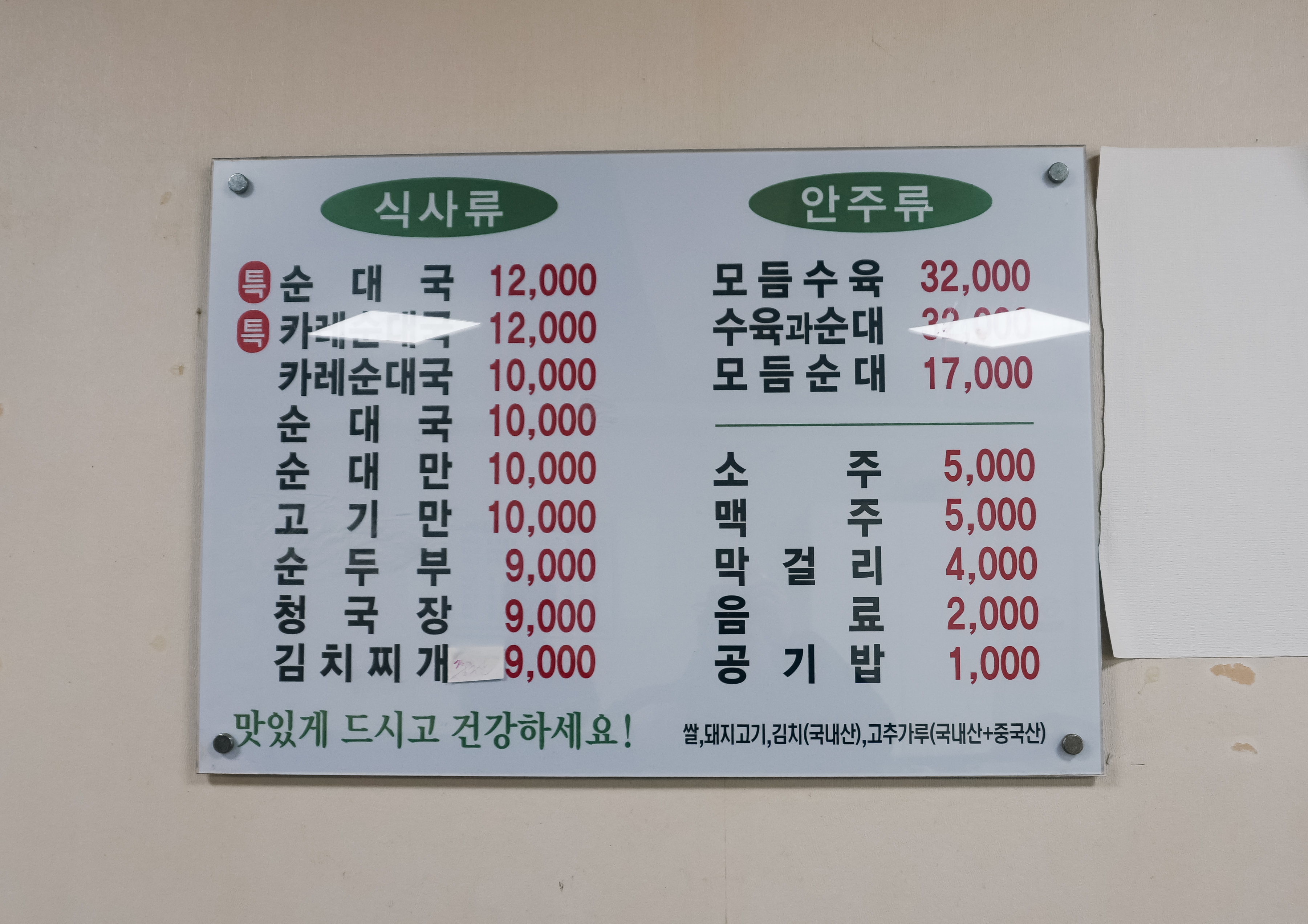 메뉴는 순대국, 카레순대국, 순대만, 고기만, 순두부, 청국장, 김치찌개, 모듬수육, 수육과순대, 모듬순대 등이 있었습니다. 저희는 가장 궁금했던 메뉴인 카레순대국을 주문했습니다.
