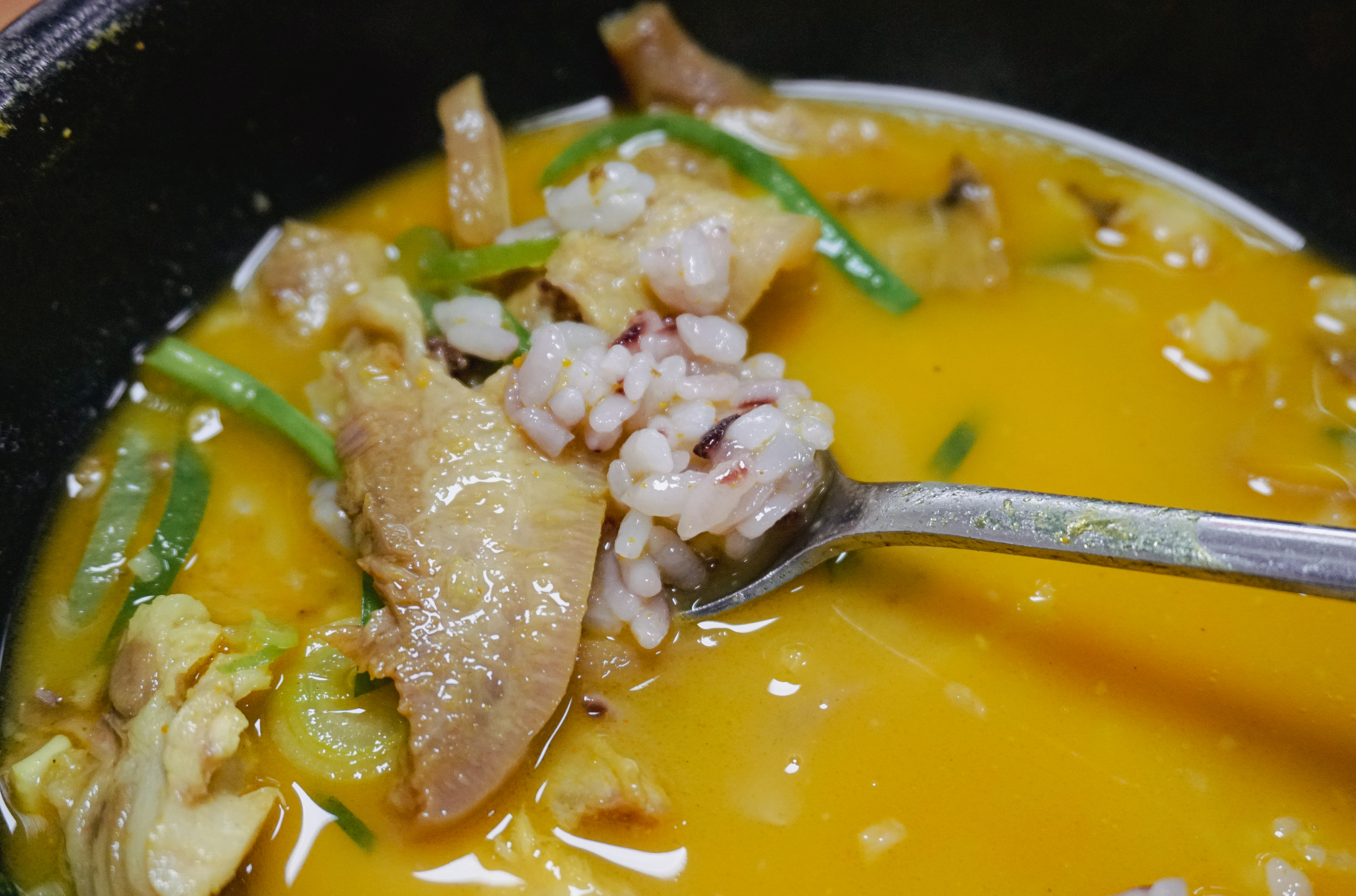 고향순대국의 카레순대국은 어느 곳에서도 본 적 없는 생소한 모습을 하고 있었고, 반찬은 무생채, 섞박지, 청양고추, 쌈장, 양파와 함께 제공되고 있었습니다. 그럼 이제 카레순대국을 더 면밀히 살펴보실까요?