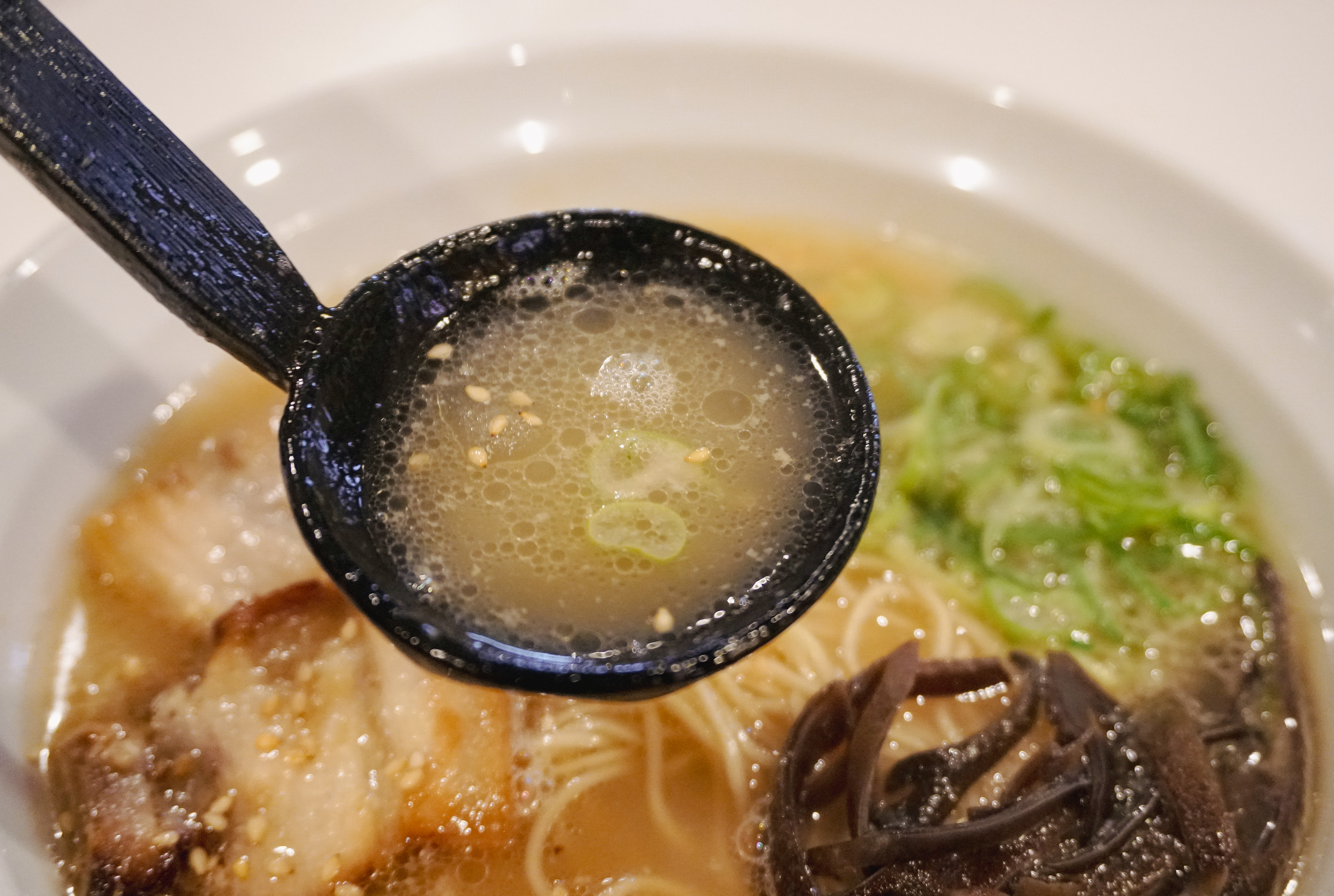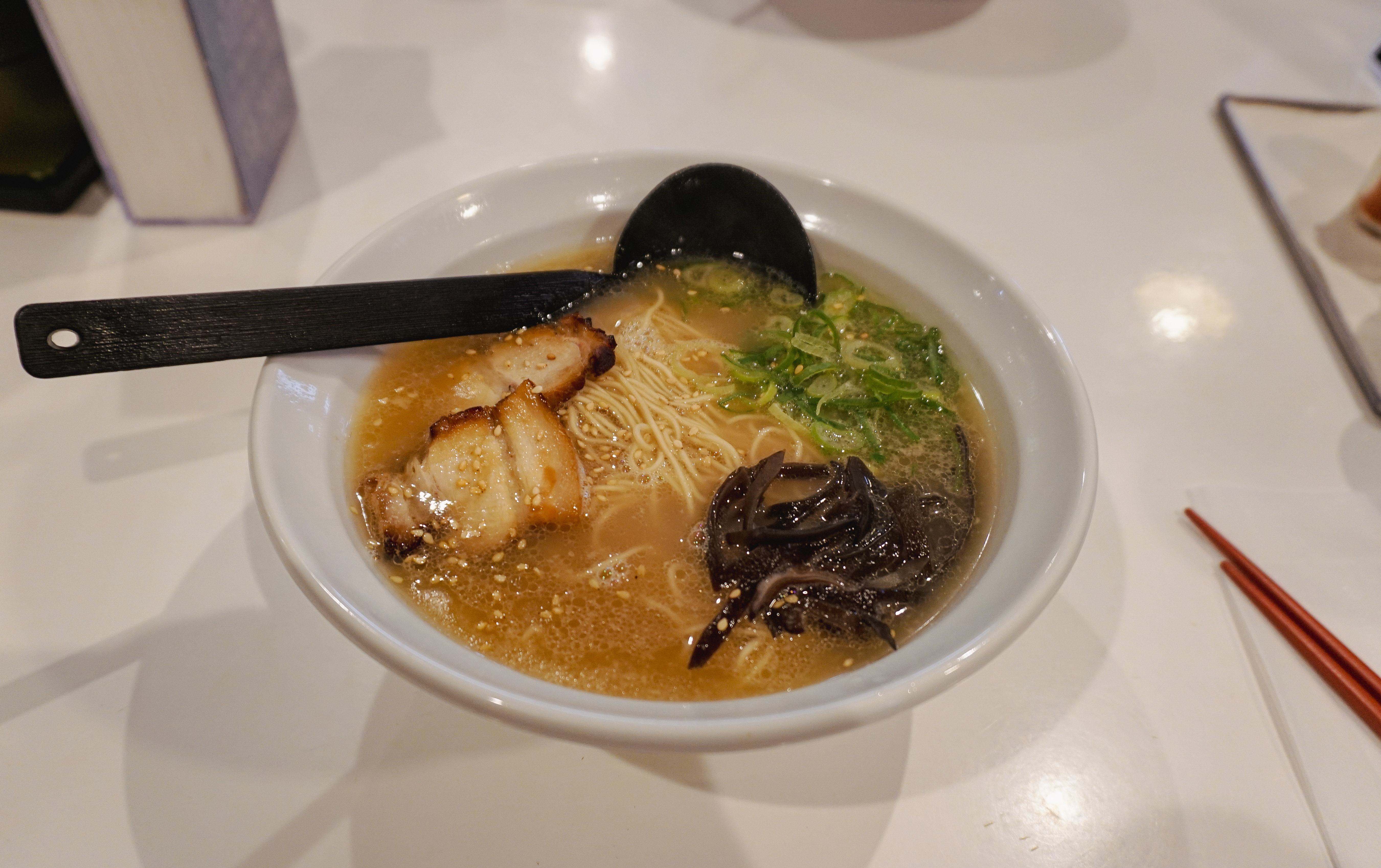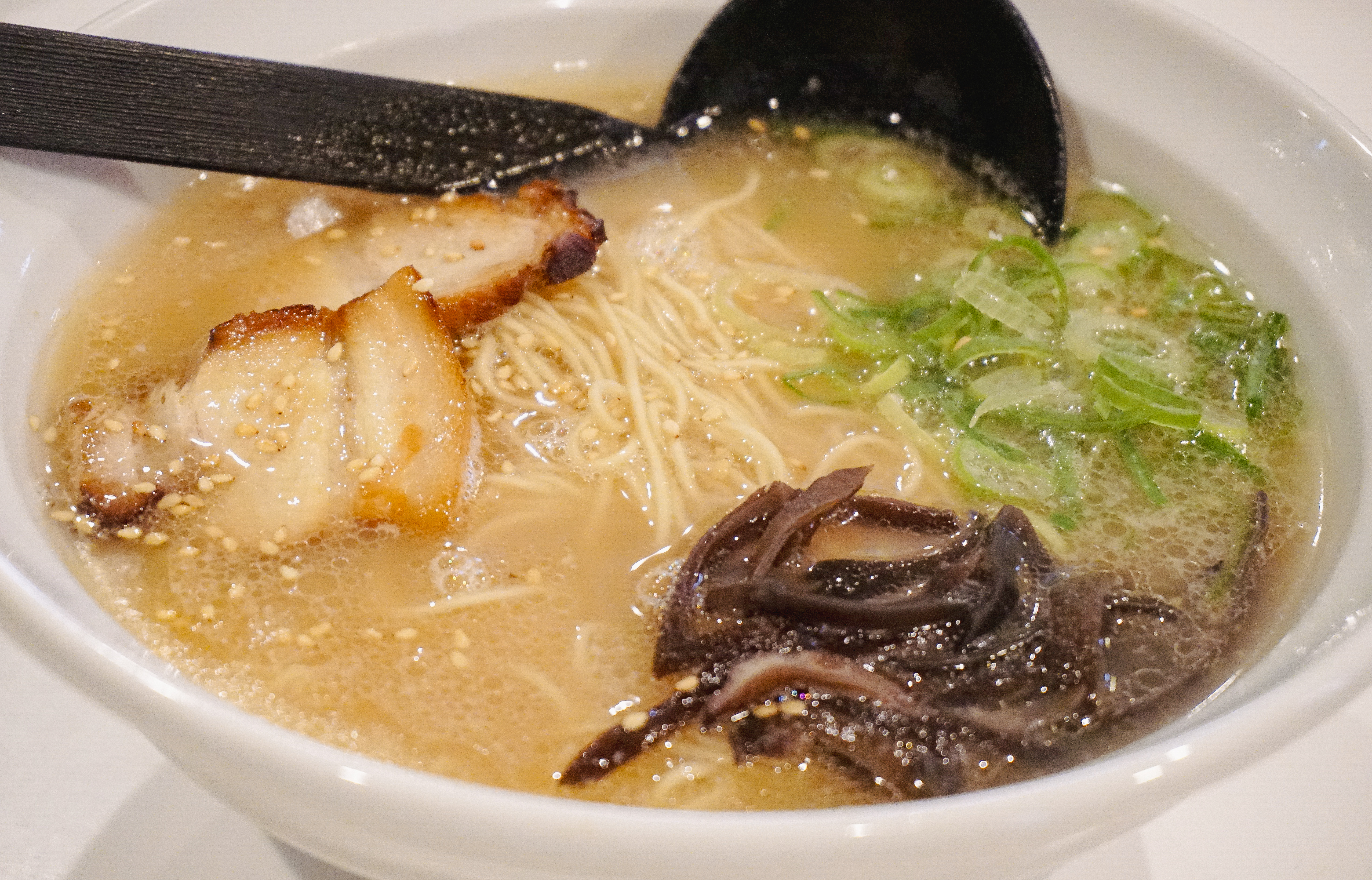 후쿠오카 멘야잇세이의 오리지널 돈코츠라멘과 소금레몬라멘이 나왔습니다. 저는 기본 돈코츠라멘을 주문했는데, 국물이 일단 진했고, 기본에 충실한 메뉴였습니다. 레몬라멘은 새콤한 맛이 강한 라멘이라고 하더라고요.