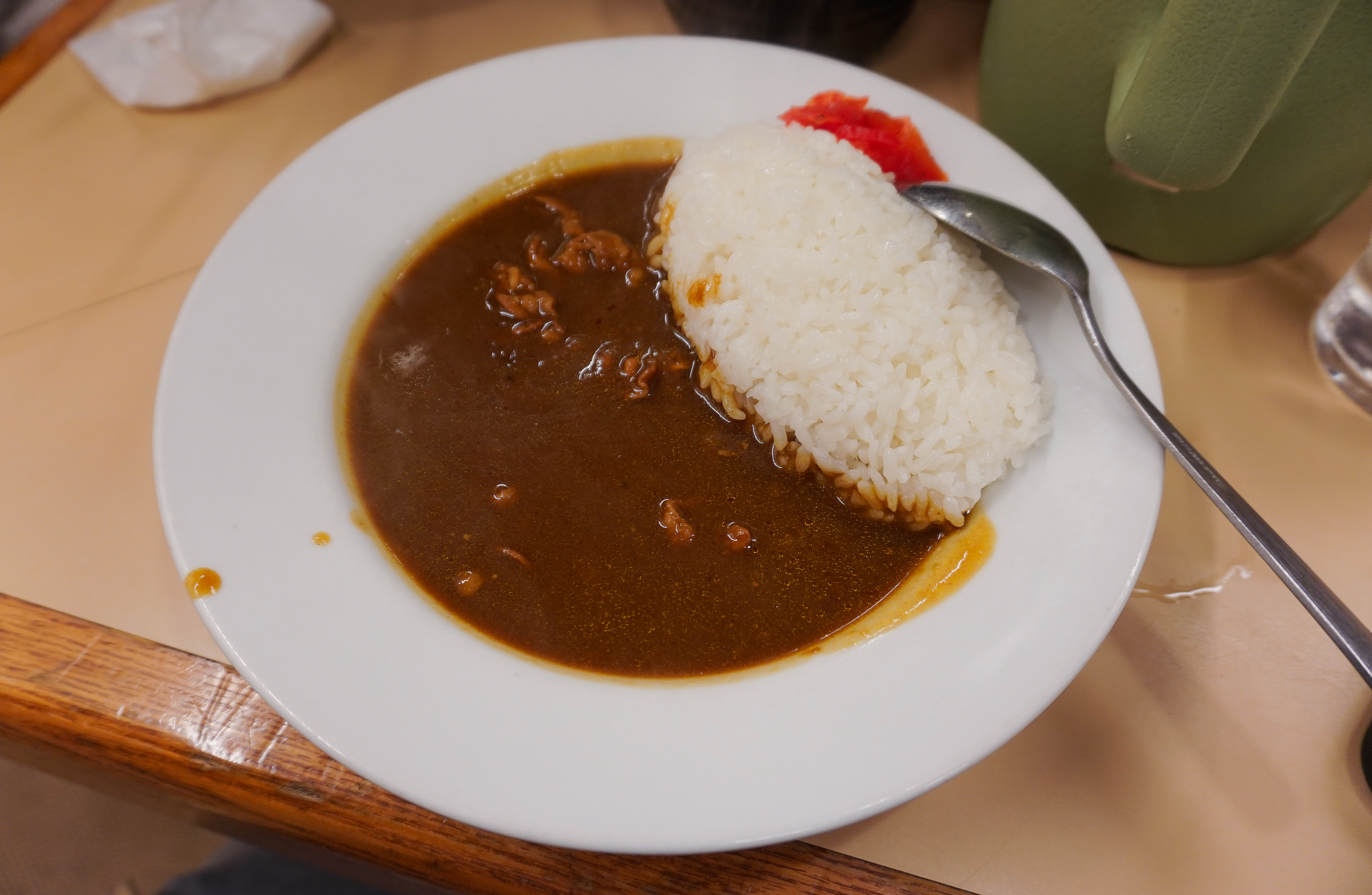 후쿠오카 텐진의 라쿠쇼라멘에서 주문한 소고기 카레는 진하고 약간 매운듯한 맛의 카레였습니다. 소고기는 얇게 썰어진 형태였고, 양은 많지는 않았습니다. 밥이랑 같이 먹기에 좋았고, 밥은 약간 고두밥 형태라 카레가 잘 스며들어 맛있었습니다. 참고로 라쿠쇼라멘은 매운 라멘을 파는 가게였는데, 단지에 담겨있던 다진 양념을 넣으니 혀가 아릴 정도로 매운맛이 확 살아나더라고요. 기본적인 메뉴를 우선 맛보시고, 매운 양념을 기호에 따라 추가하시는 것을 추천드립니다.