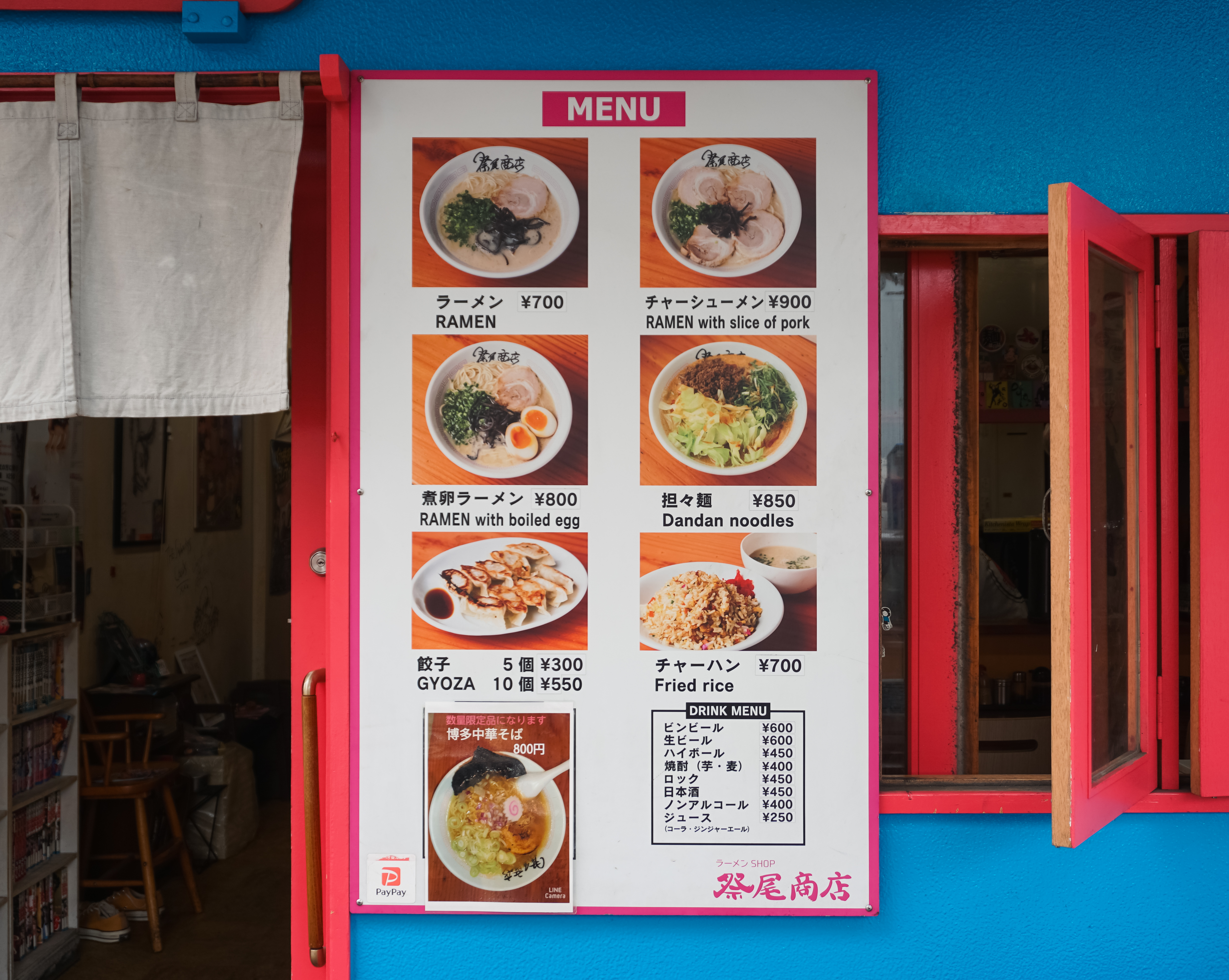 라멘샵(ラーメンSHOP 祭尾商店)은 1 Chome-4-21 Arato, Chuo Ward, Fukuoka, 810-0062 에 위치한 가게로, 옥외 메뉴판을 통해 가격을 미리 확인할 수 있었고, 영업시간은 11:30~22:00 까지이며, 브레이크타임은 15:00~17:00 까지였습니다. 휴무일은 화요일입니다.