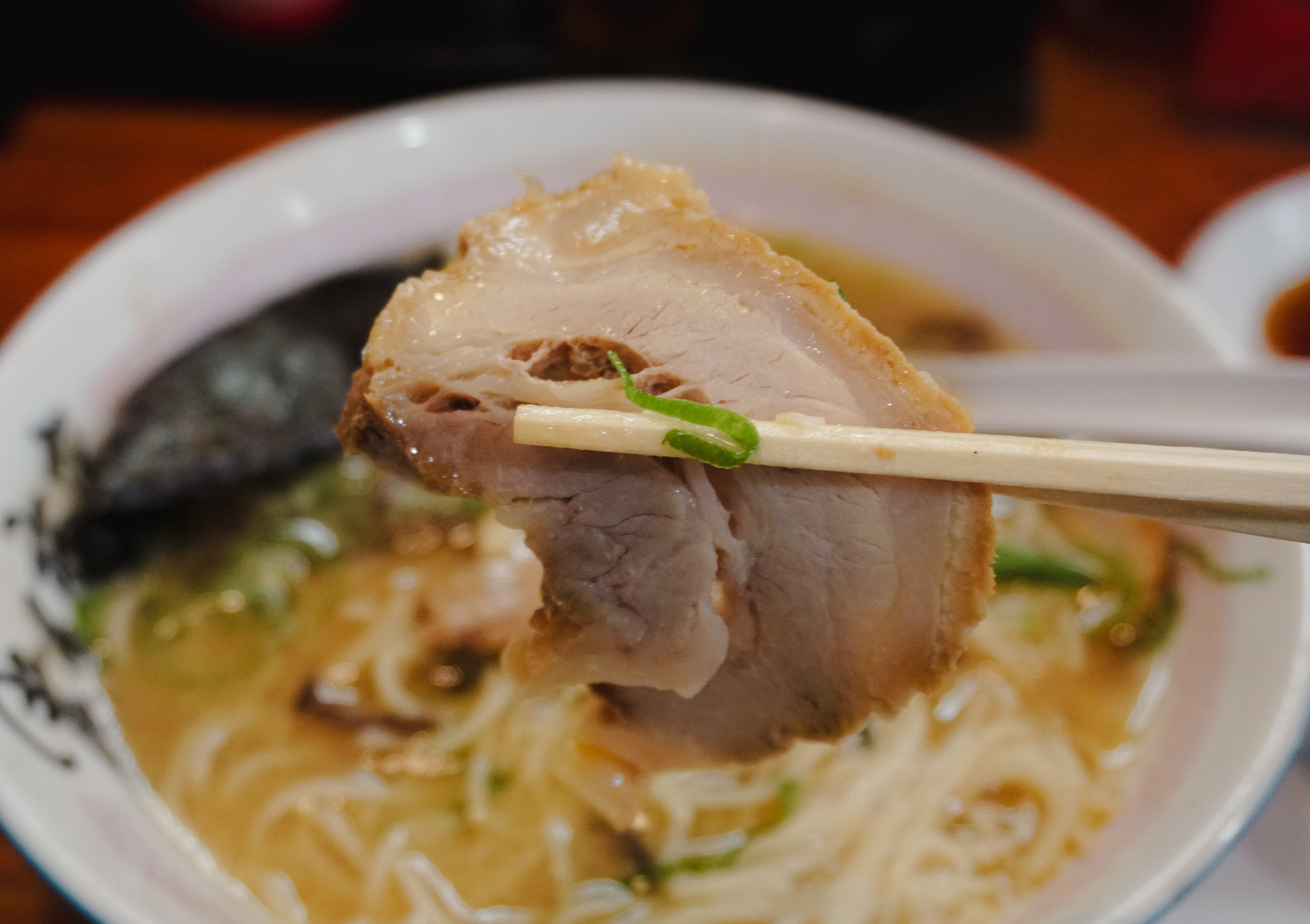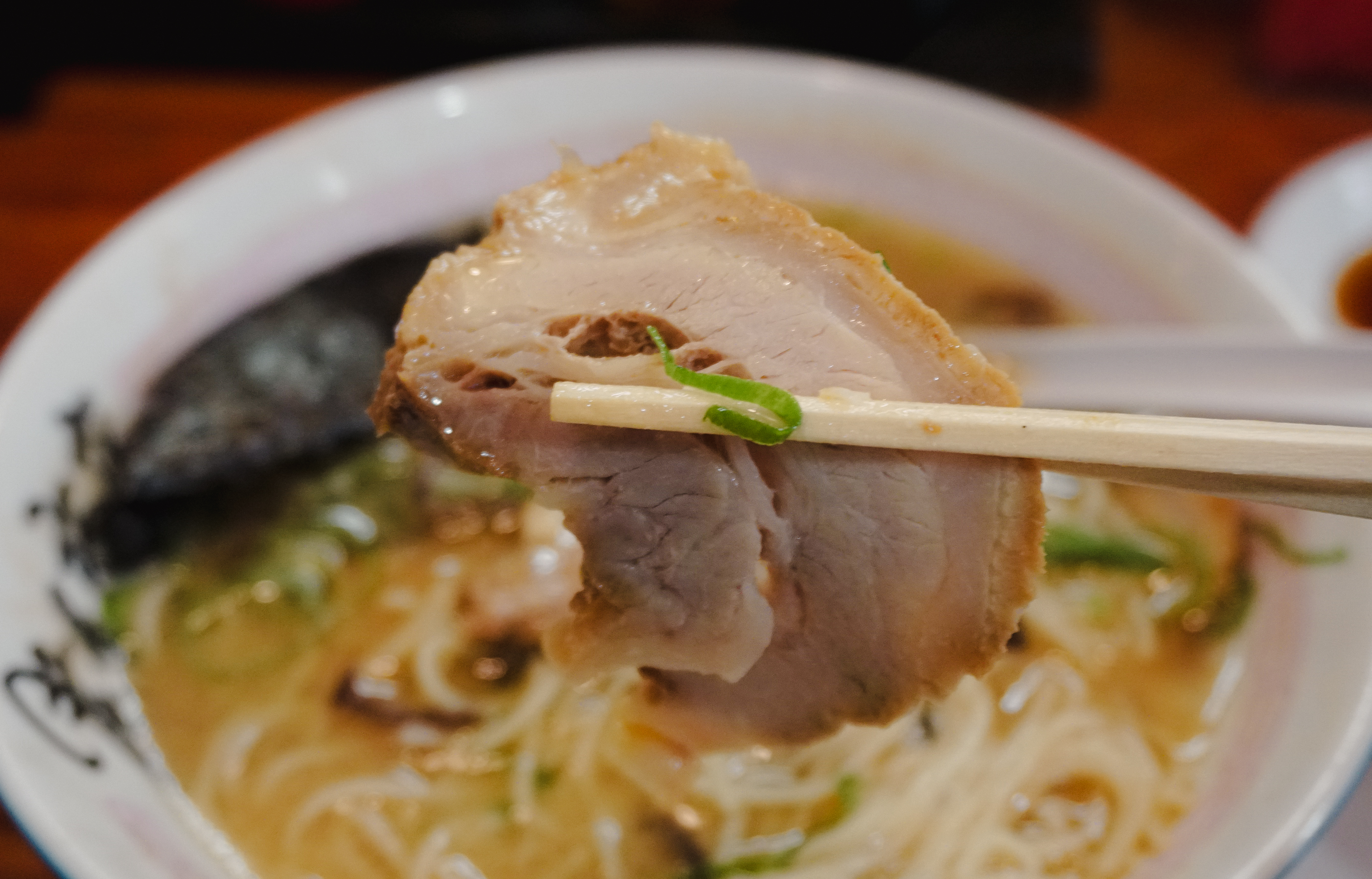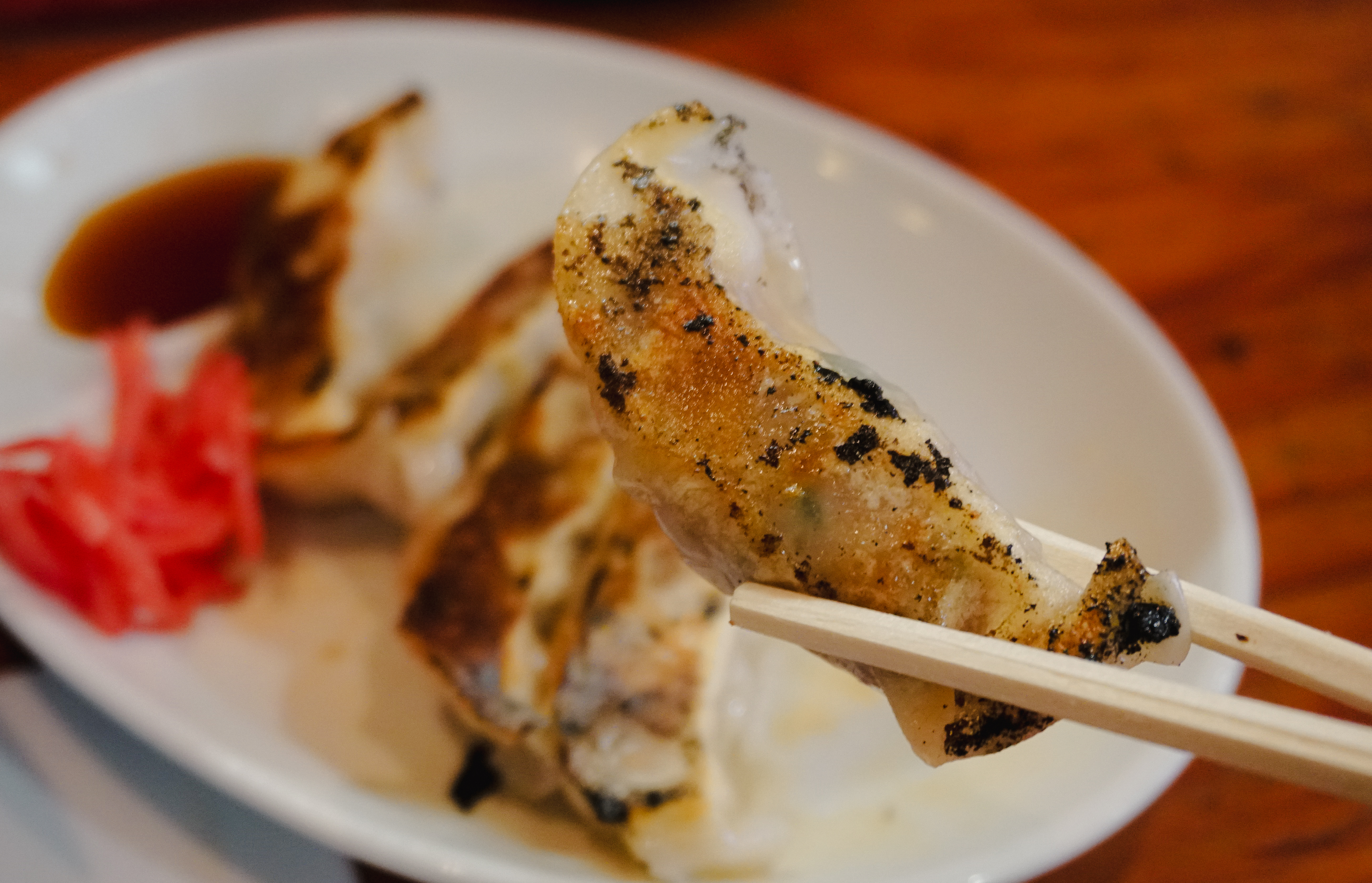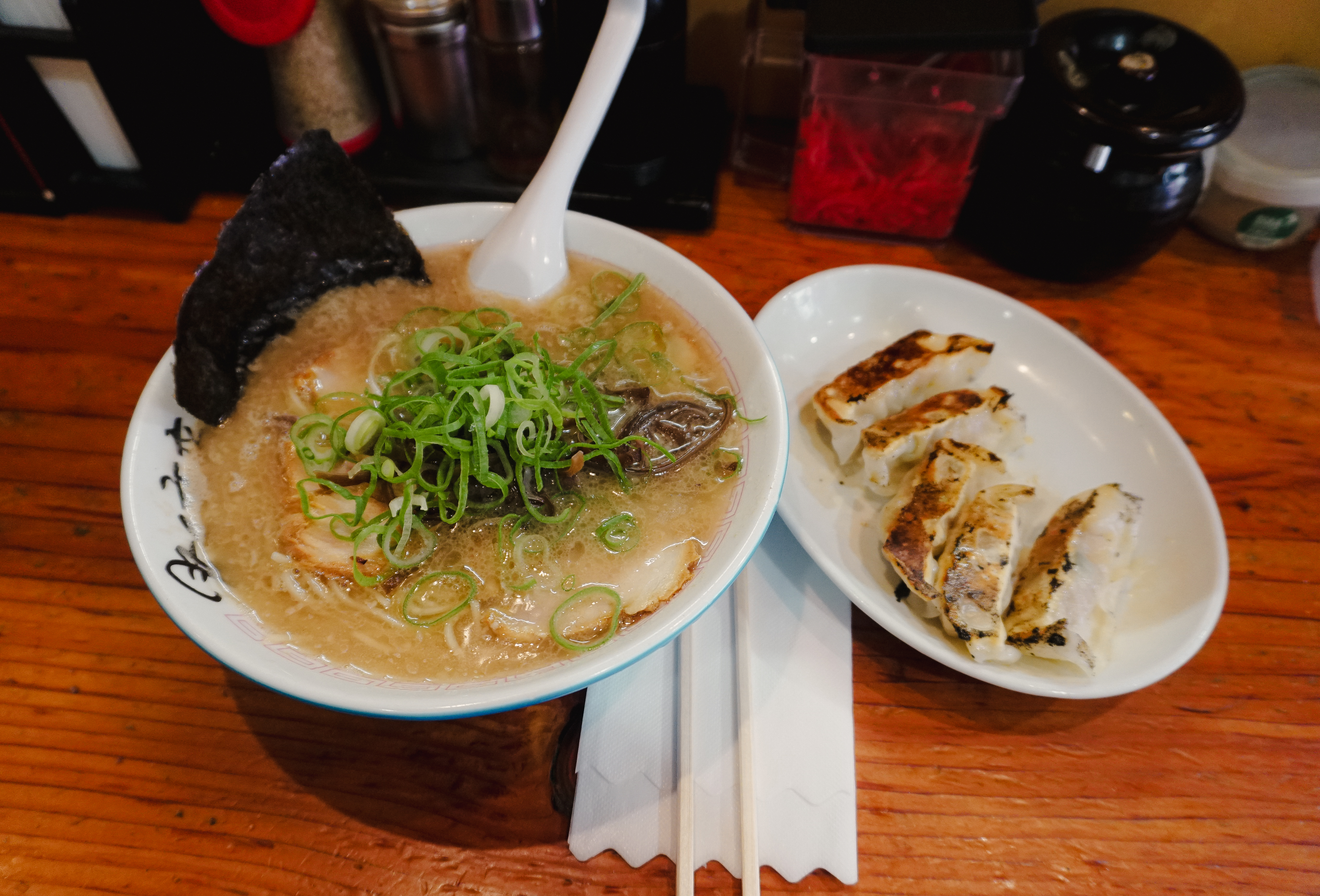 곧이어 주문한 차슈라멘과 교자가 나왔습니다. 이곳의 돈코츠라멘은 국물이 걸쭉하다고 느낄 정도로 가게 밖에서부터 진한 국물의 냄새가 느껴지는 메뉴였는데, 실제로도 라멘이 기름기가 많은 진한 국물이 인상적이었습니다. 내공이 많이 느껴지는 라멘에 비해서는 교자는 평범한 느낌이더라고요.