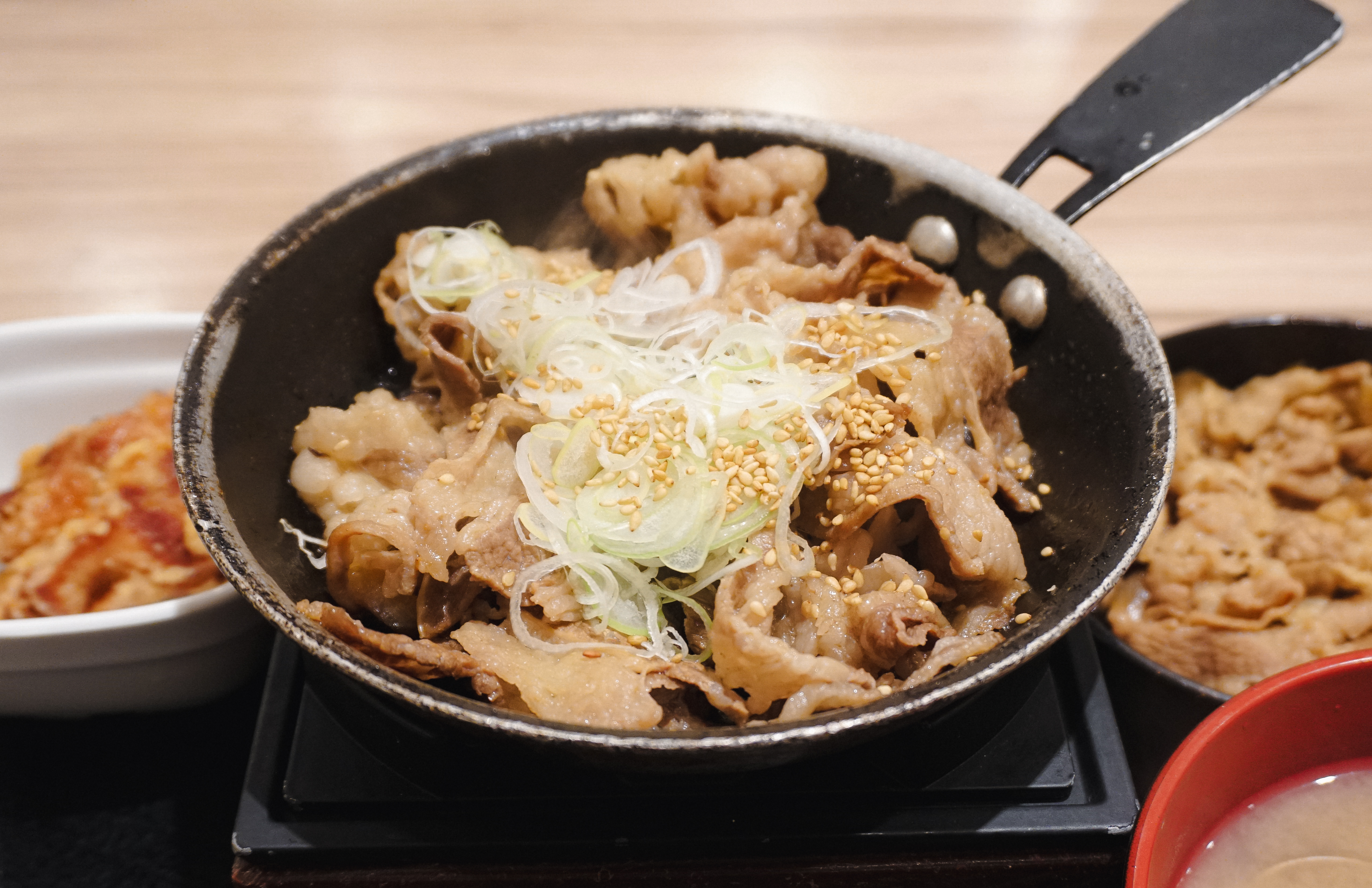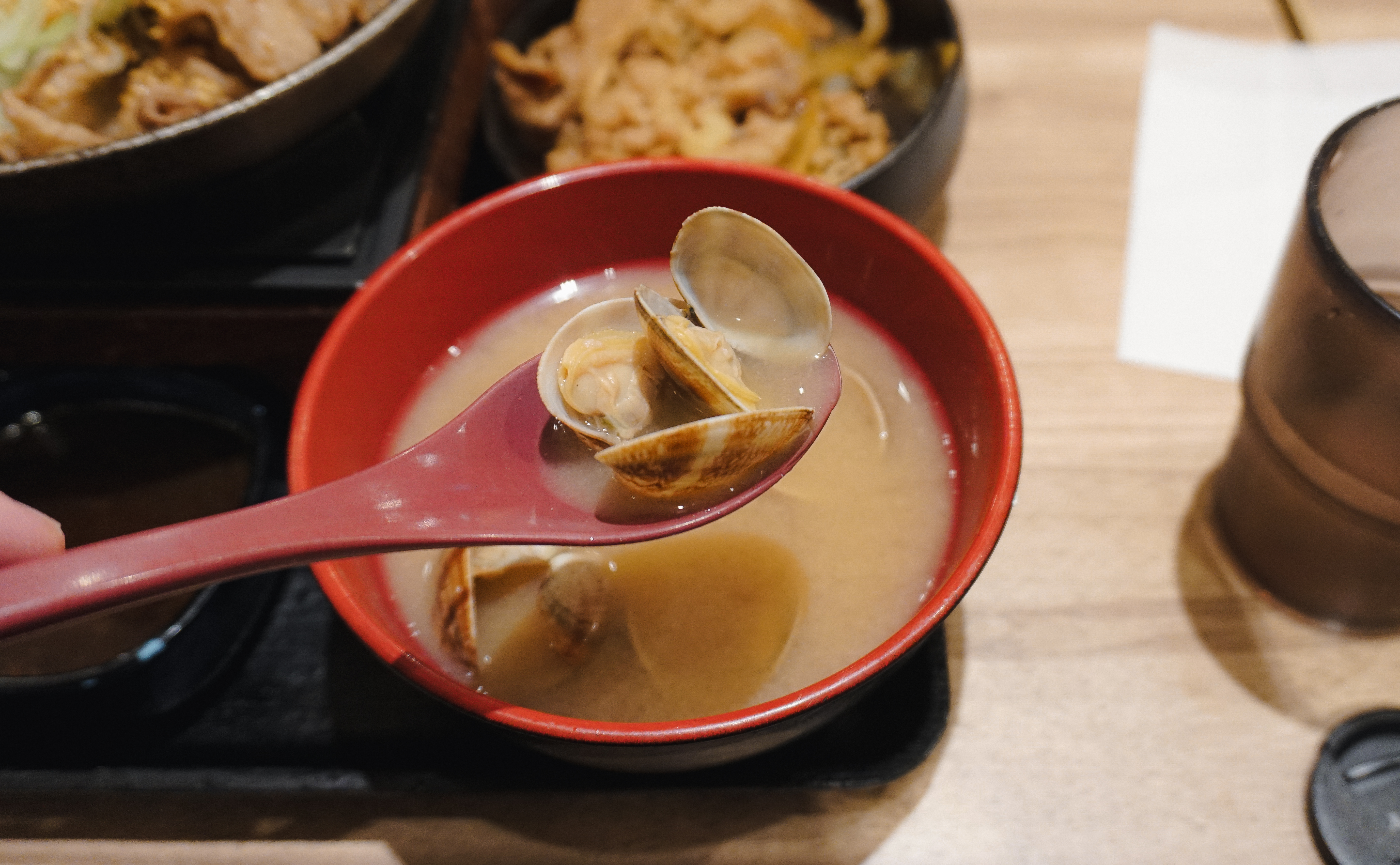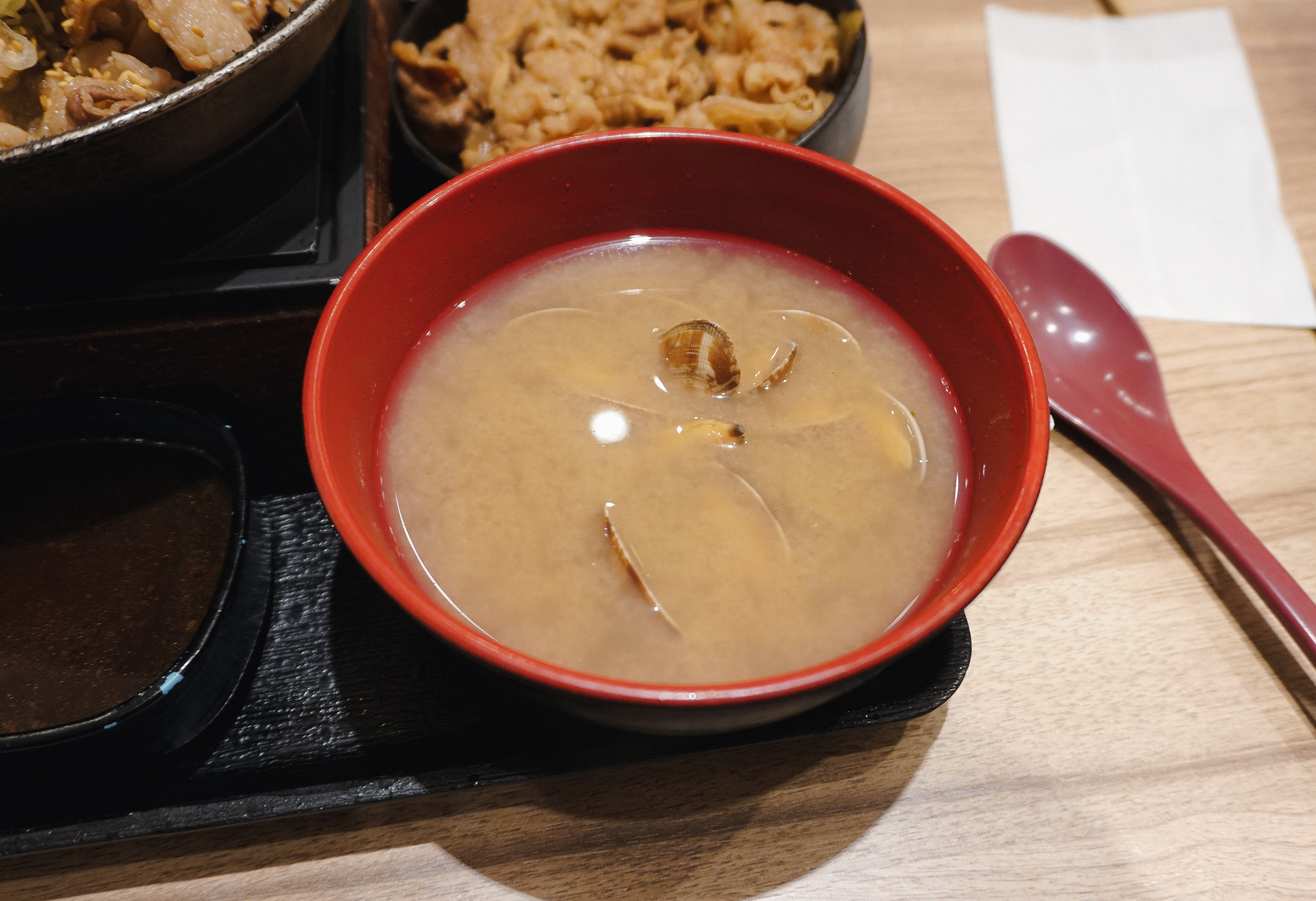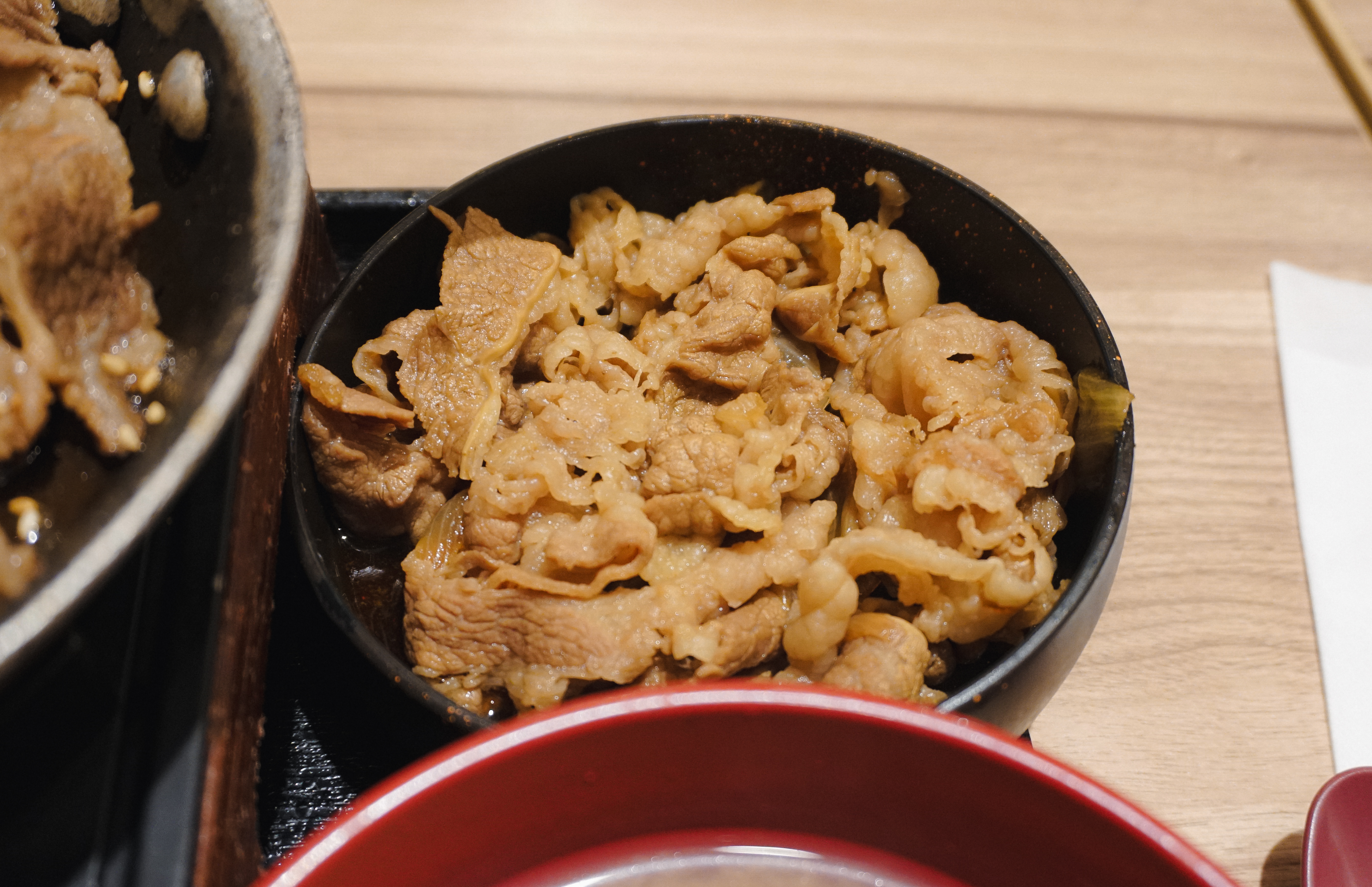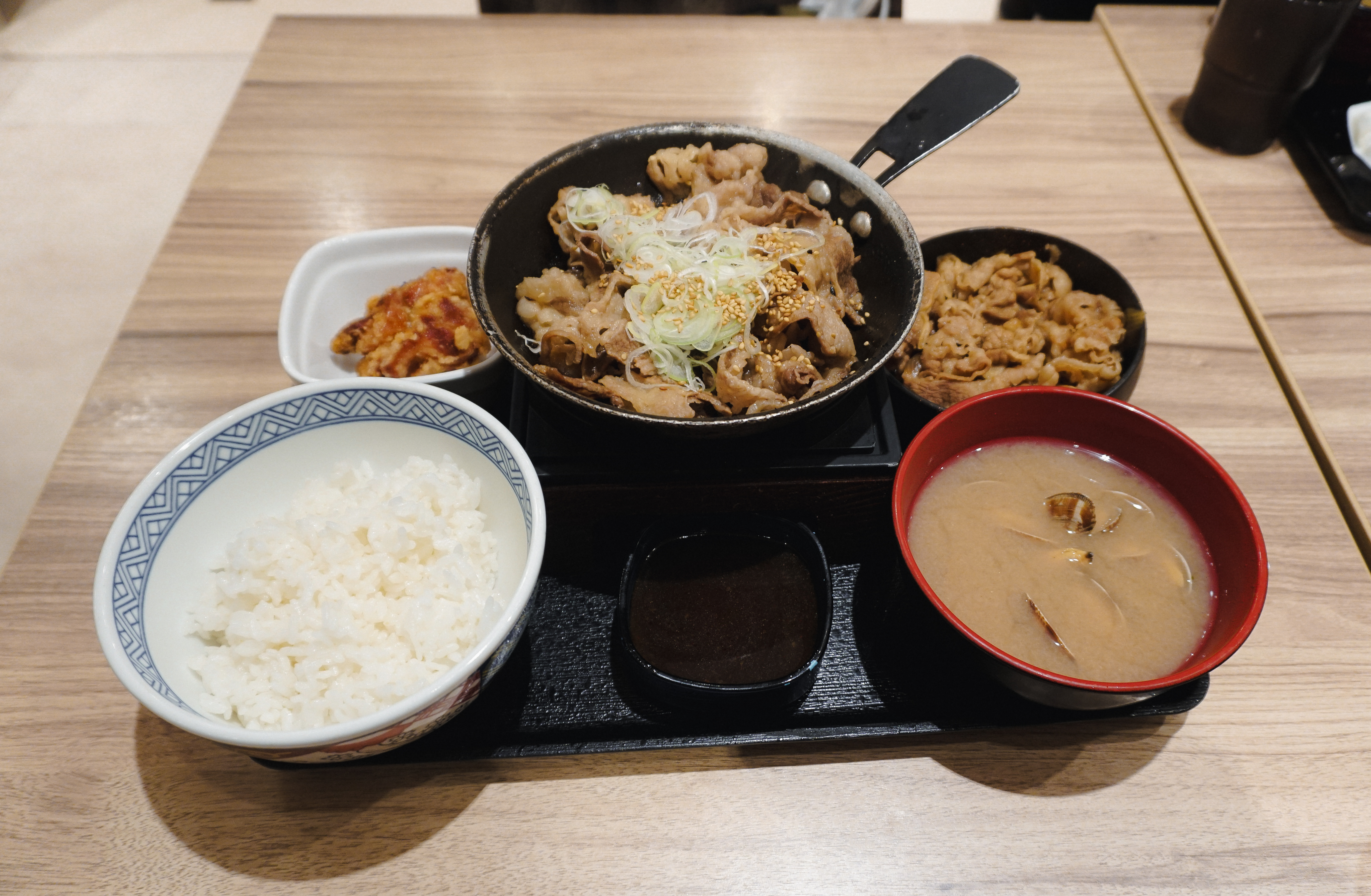 규동 전문점 요시노야에서 주문한 메뉴가 나왔습니다. 위에서부터 철판소갈비, 소고기(불고기), 가라아게(닭튀김), 바지락된장국이 나왔습니다. 저는 가장 놀라웠던 것이 한국에서 소갈비 하면 씹는 맛이 좋은 두툼하고 고소한 고기요리를 떠올리는데, 일본에서 소갈비나 야키니쿠를 주문하면 간혹 이런 얇은 고기의 메뉴가 나오더라고요.