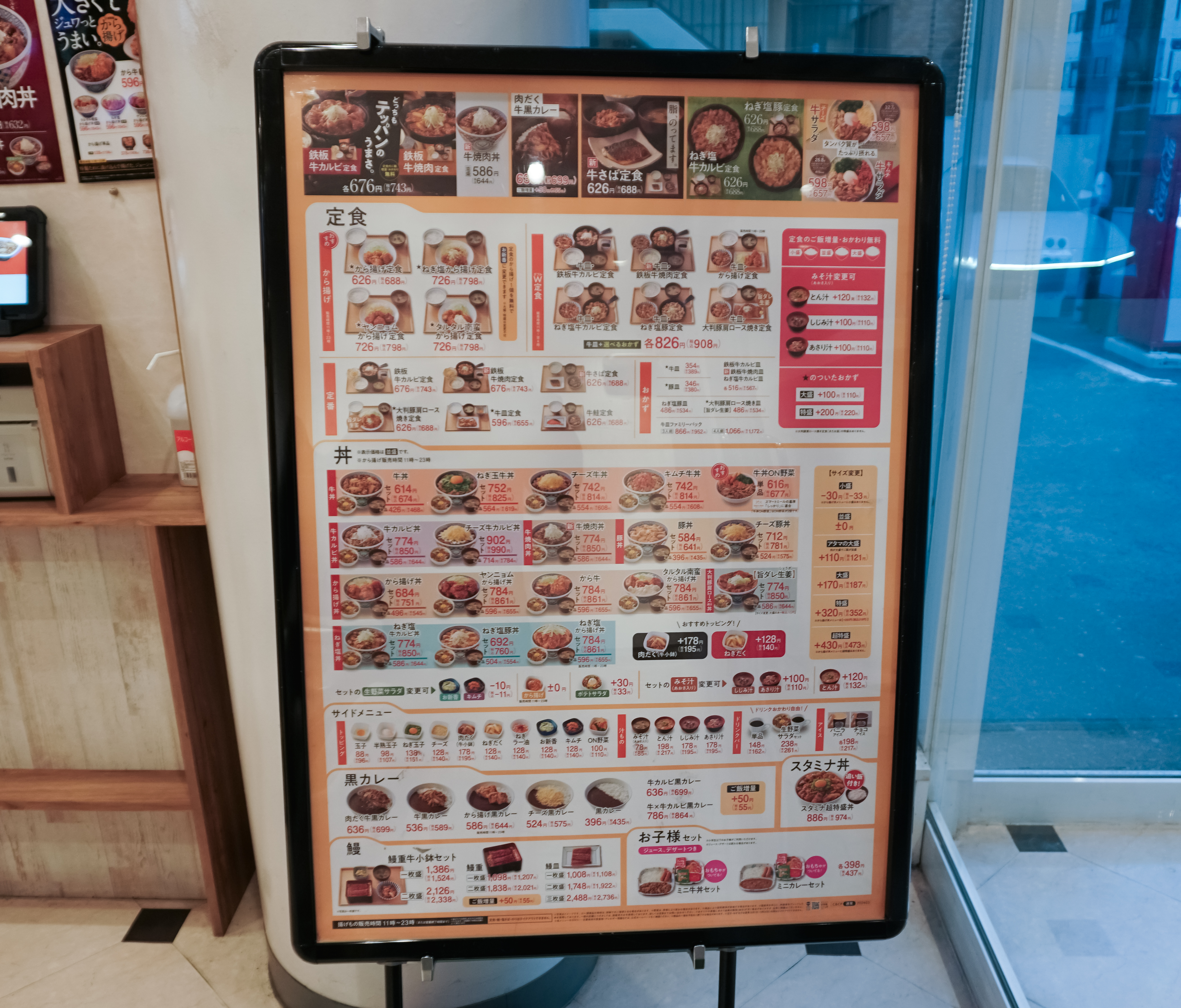 요시노야의 메뉴는 크게 정식, 덮밥, 카레, 사이드메뉴로 나뉘며, 튀김, 소고기, 돼지고기, 연어, 고등어 등 다양한 재료를 여러 가지 방식으로 조리해 취향에 맞게 선택할 수 있었습니다. 특히 사이드메뉴도 종류가 다양하고 된장국도 3가지 종류나 되어서 입맛대로 선택하여 먹을 수 있었습니다.
