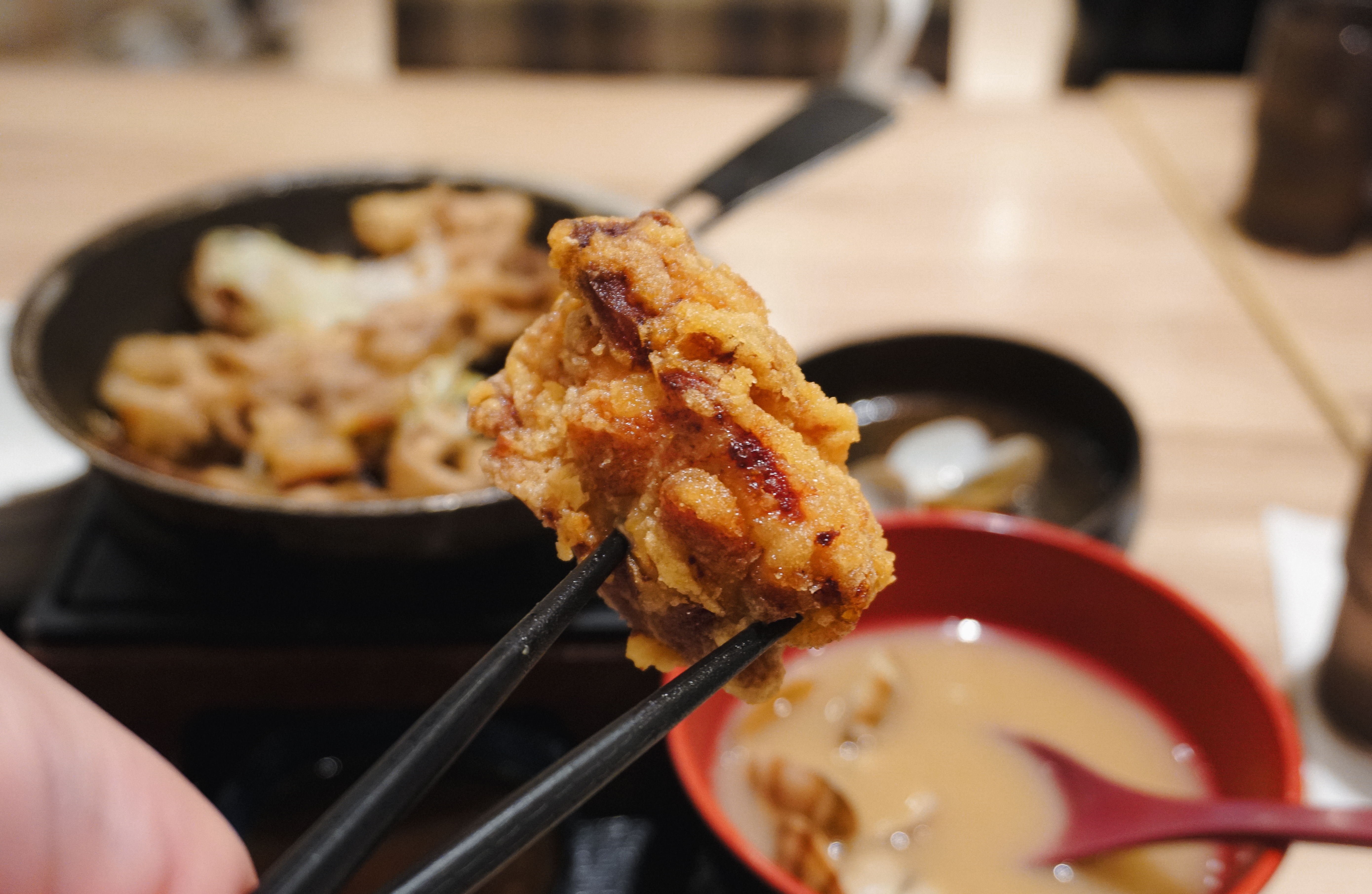 철판 소갈비는 약간 태우듯이 바싹 익혀낸 소불고기 맛이었는데, 불향이 잘 나는 메뉴였습니다. 같이 나온 소고기(불고기)와 차이점은 양념이 갈비맛이 났고, 조금 더 감칠맛이 좋았습니다. 그밖에 바지락된장국은 조금 짠맛이 강했지만 감칠맛이 좋았던 메뉴입니다. 가라아게는 겉바속촉 한국의 치킨을 떠올리게 하는 메뉴인데, 집에서 직접 만드는 치킨 같은 맛(?)이었습니다.