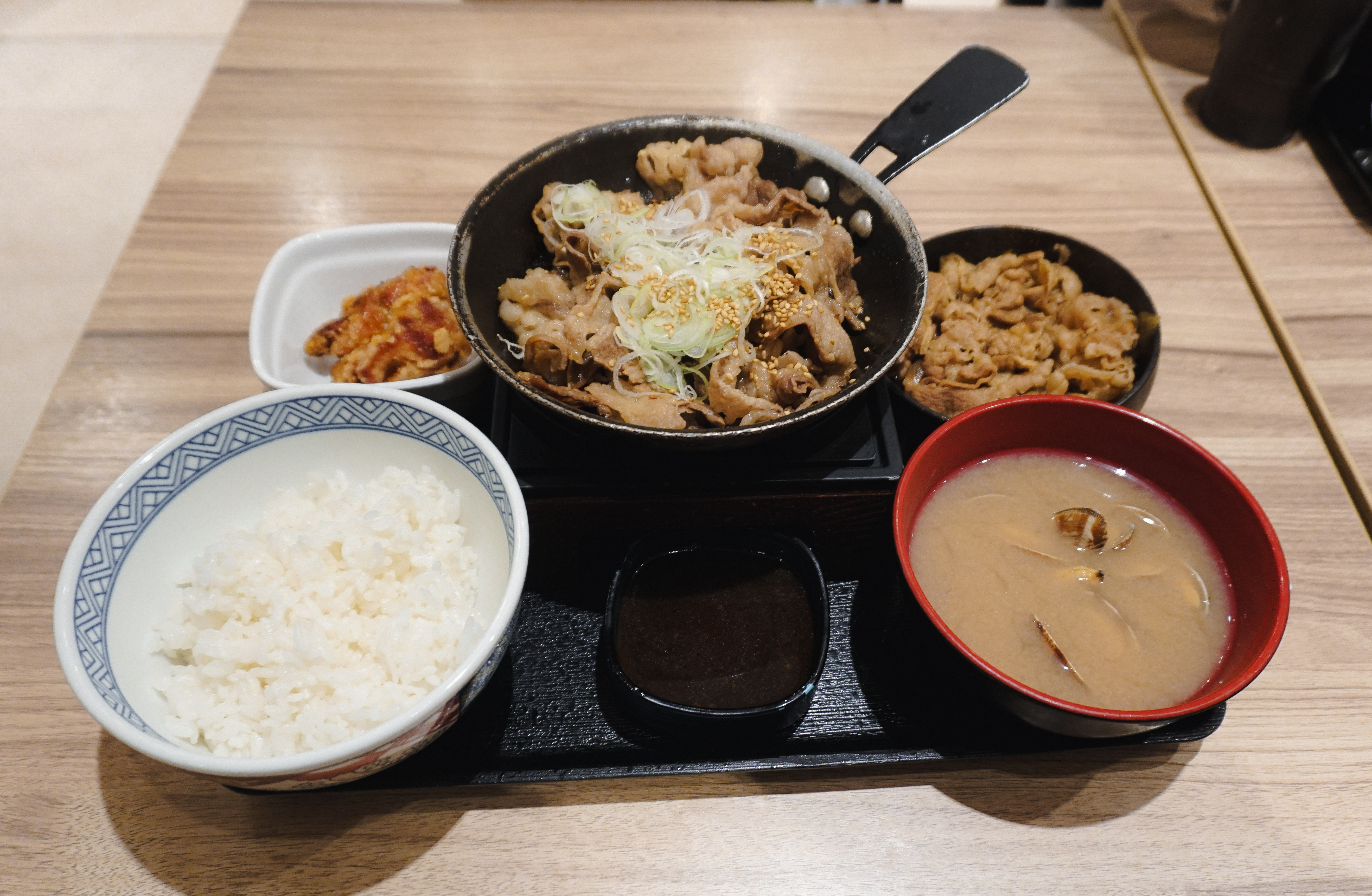 규동 전문점 요시노야에서 주문한 메뉴가 나왔습니다. 위에서부터 철판소갈비, 소고기(불고기), 가라아게(닭튀김), 바지락된장국이 나왔습니다. 저는 가장 놀라웠던 것이 한국에서 소갈비 하면 씹는 맛이 좋은 두툼하고 고소한 고기요리를 떠올리는데, 일본에서 소갈비나 야키니쿠를 주문하면 간혹 이런 얇은 고기의 메뉴가 나오더라고요.