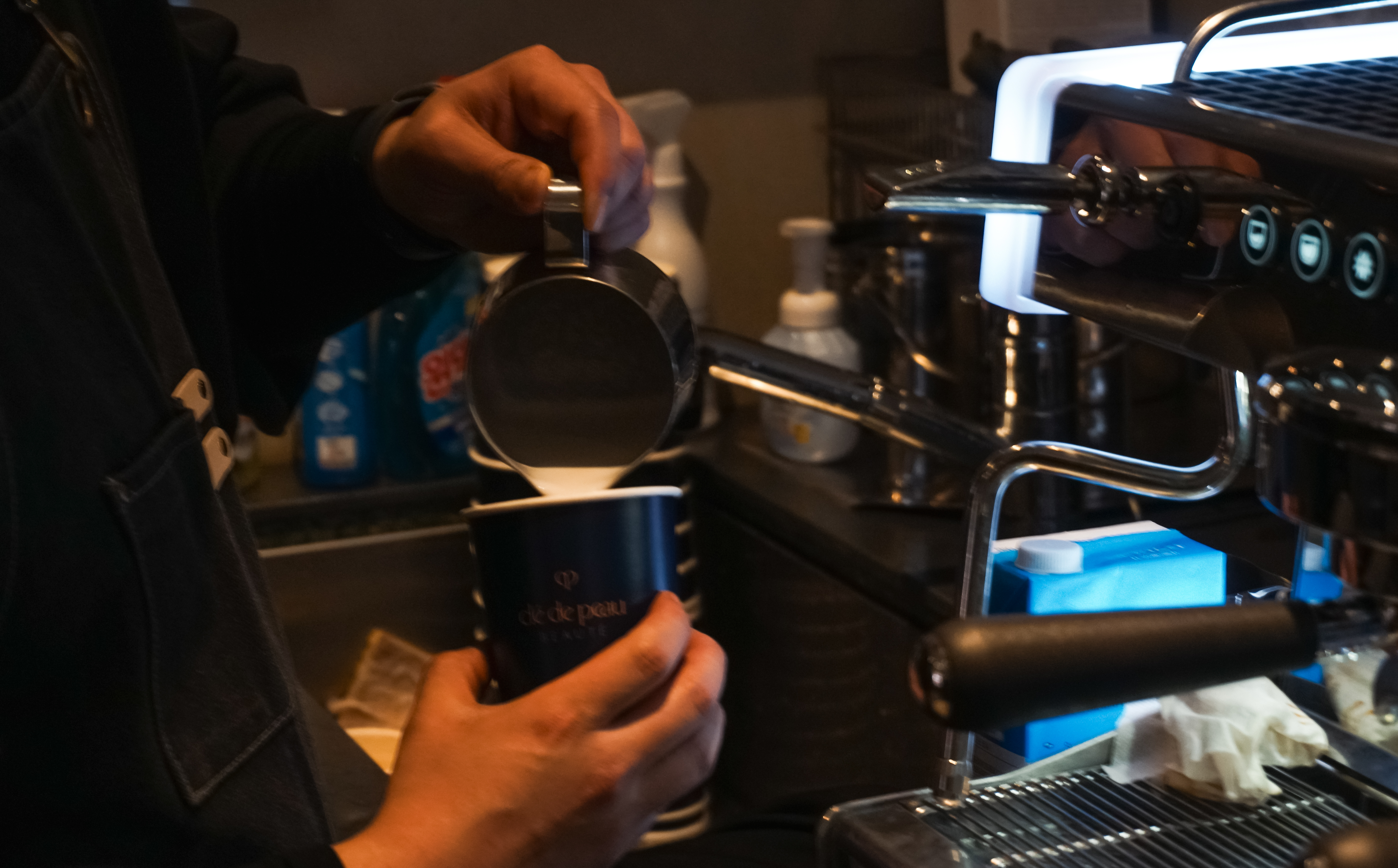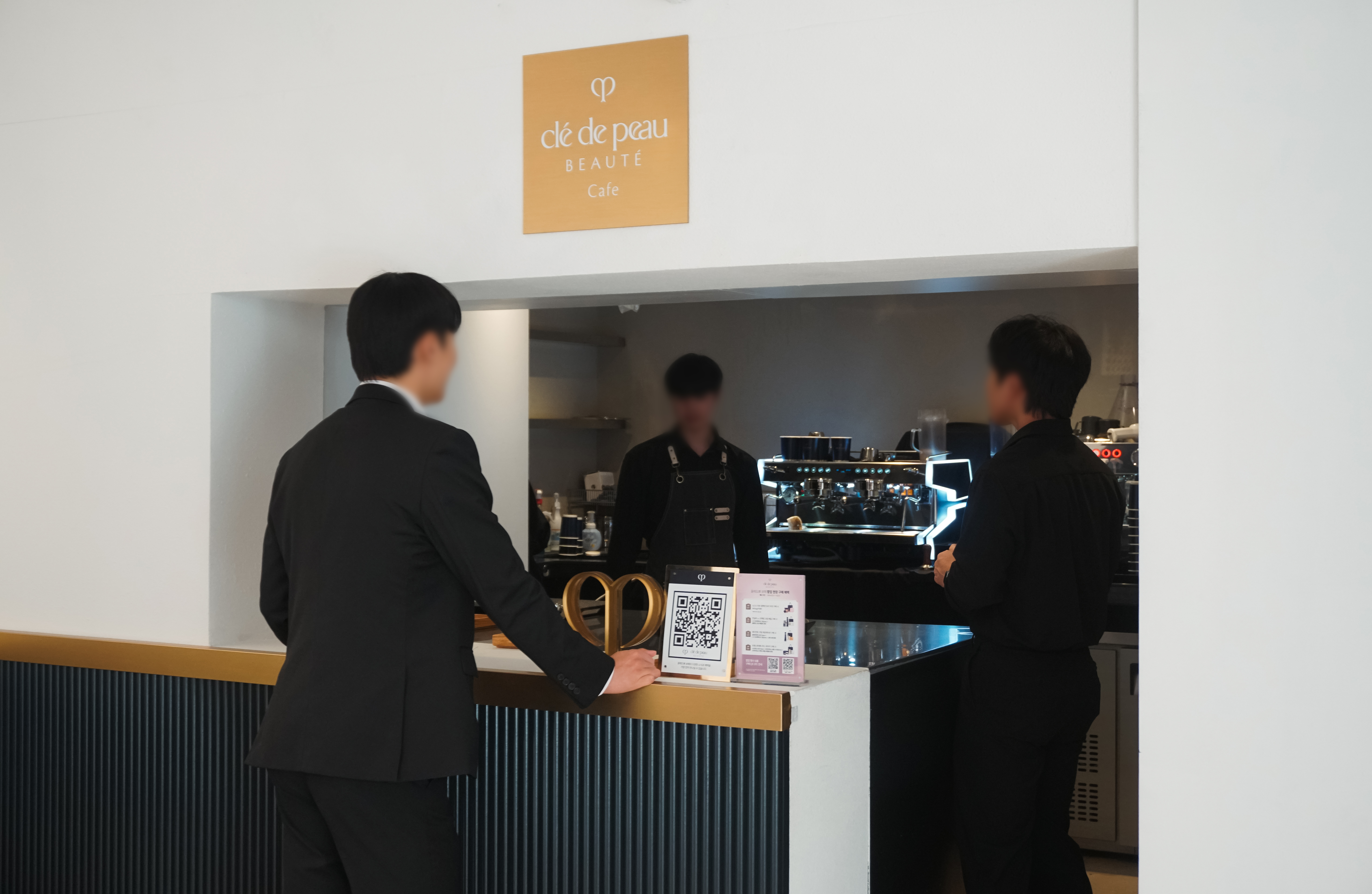 다음에 보실 장소는 꼴라보하우스 도산에서 열린 팝업행사에서 본 기업로고를 이용한 라떼아트였습니다. 이곳에서는 끌레드뽀(Clé de Peau) 라는 스킨케어 브랜드의 독특한 로고를 활용한 라떼아트를 볼 수 있었는데, 확실히 행사장의 분위기에 맞게 고급스러운 느낌을 주는 커피머신을 사용해 에스프레소를 내려 커피를 만들어주셨습니다.